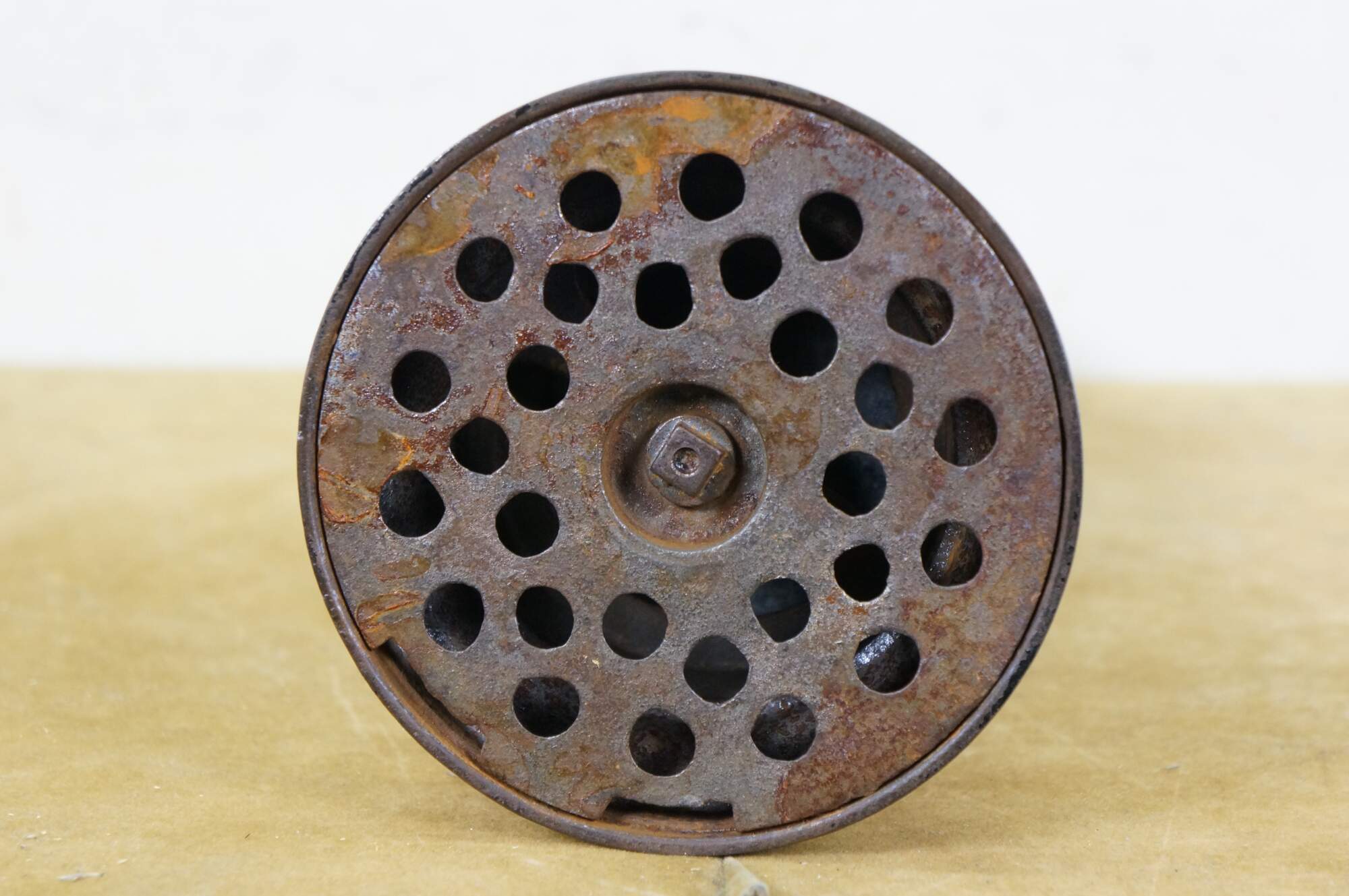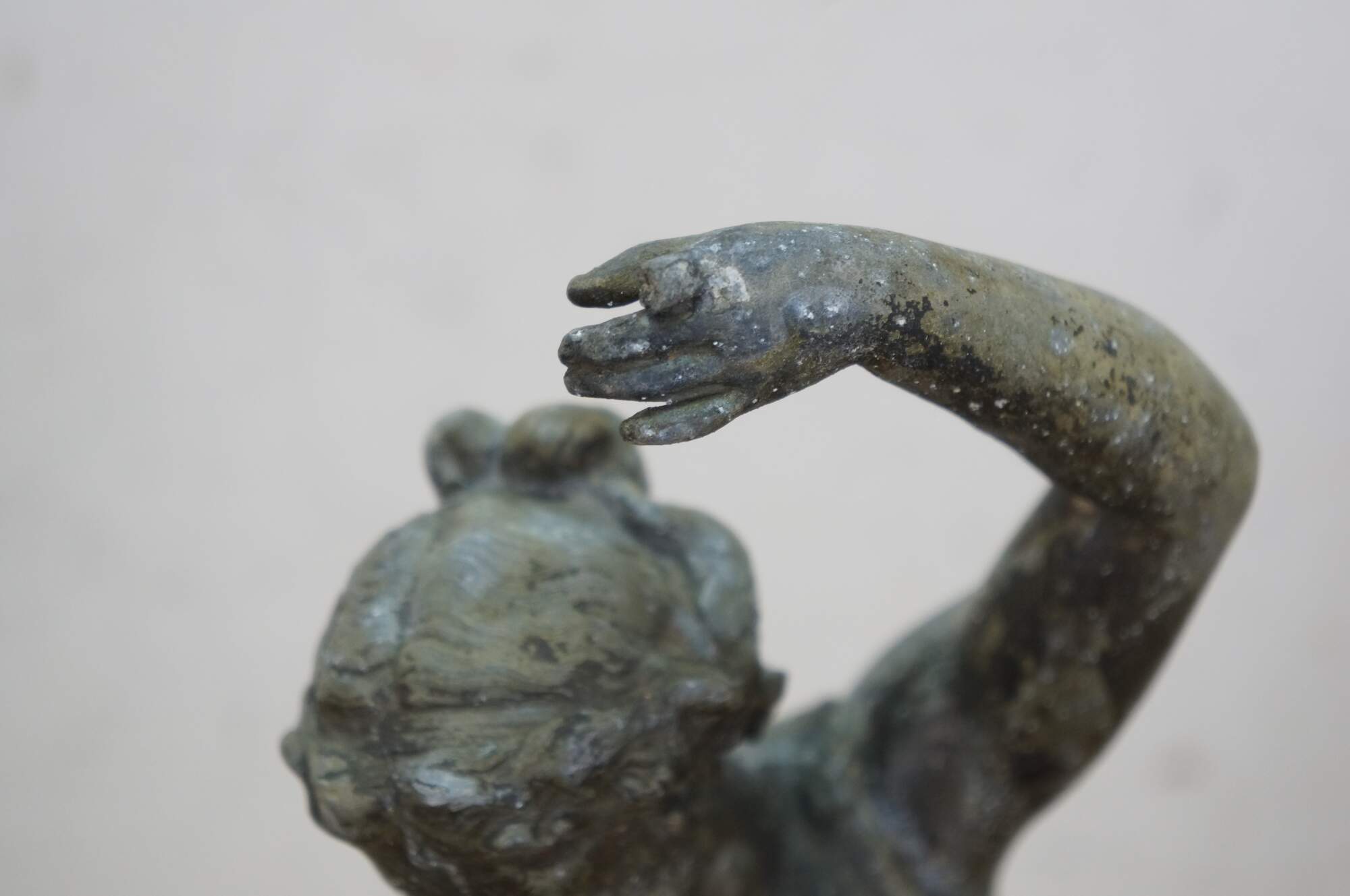 Wear and distressing; tarnish/oxidation; missing finger and whatever else was being held.