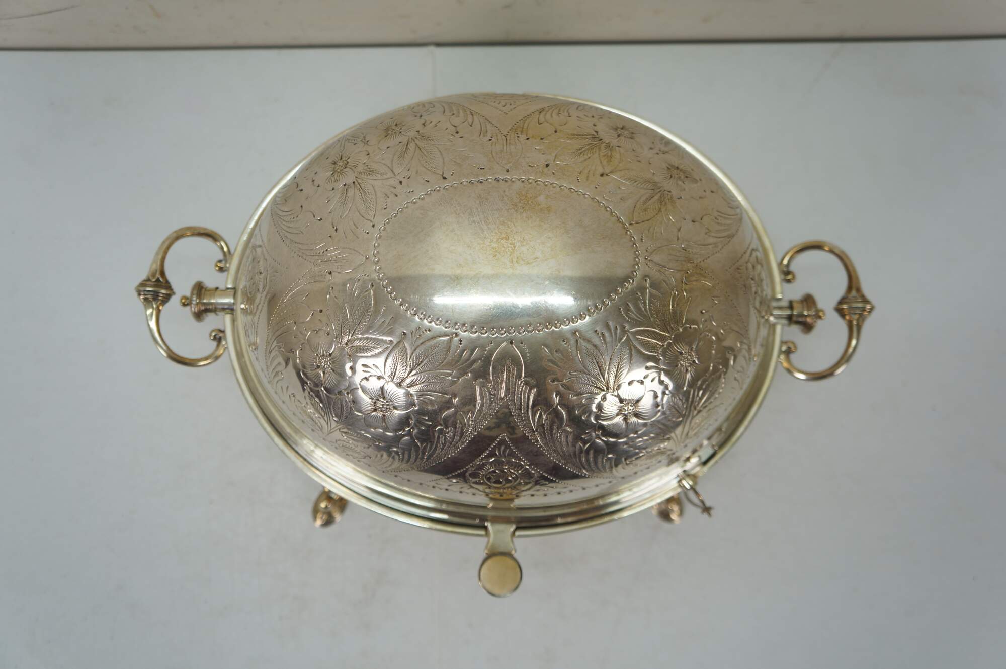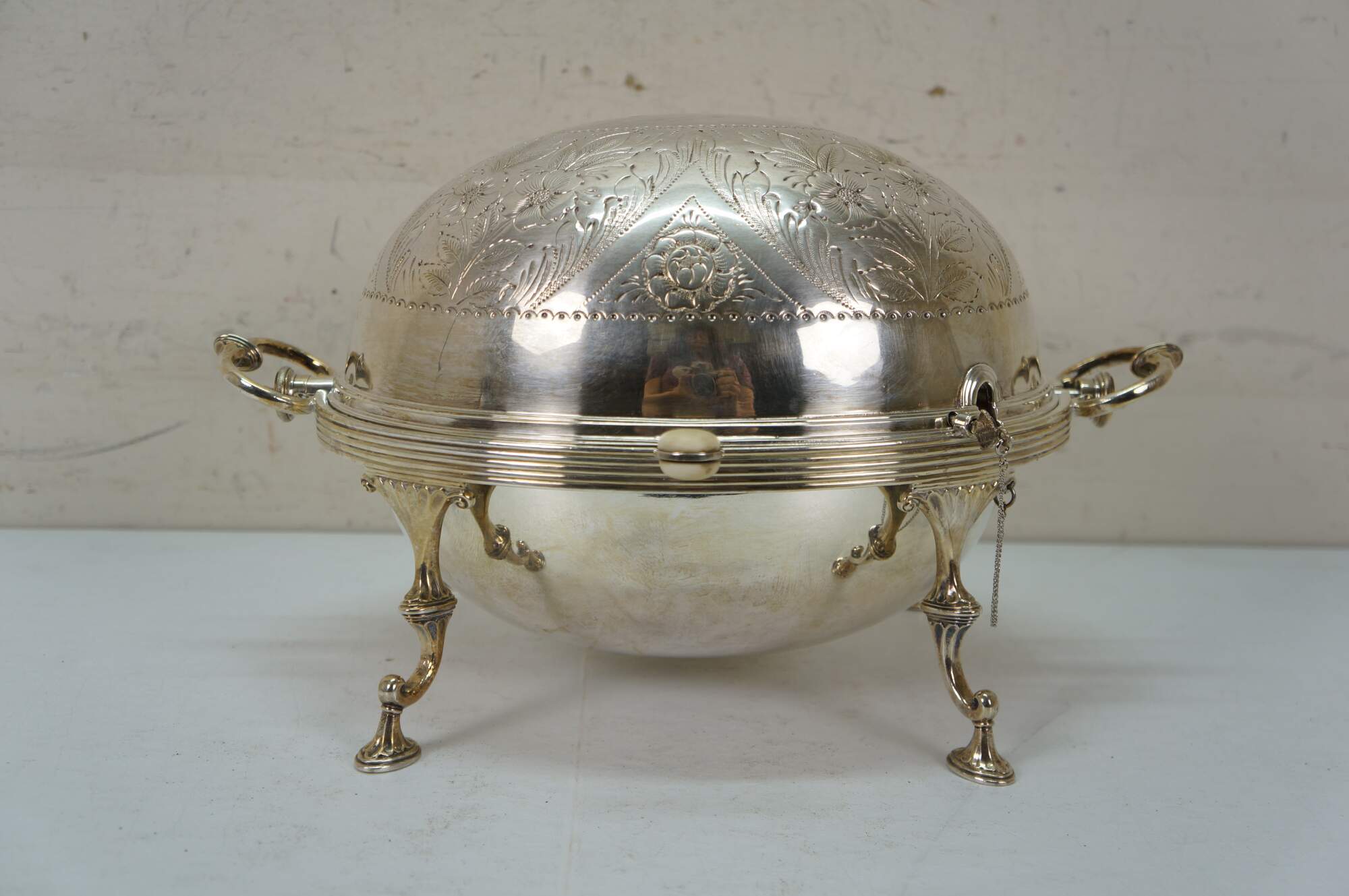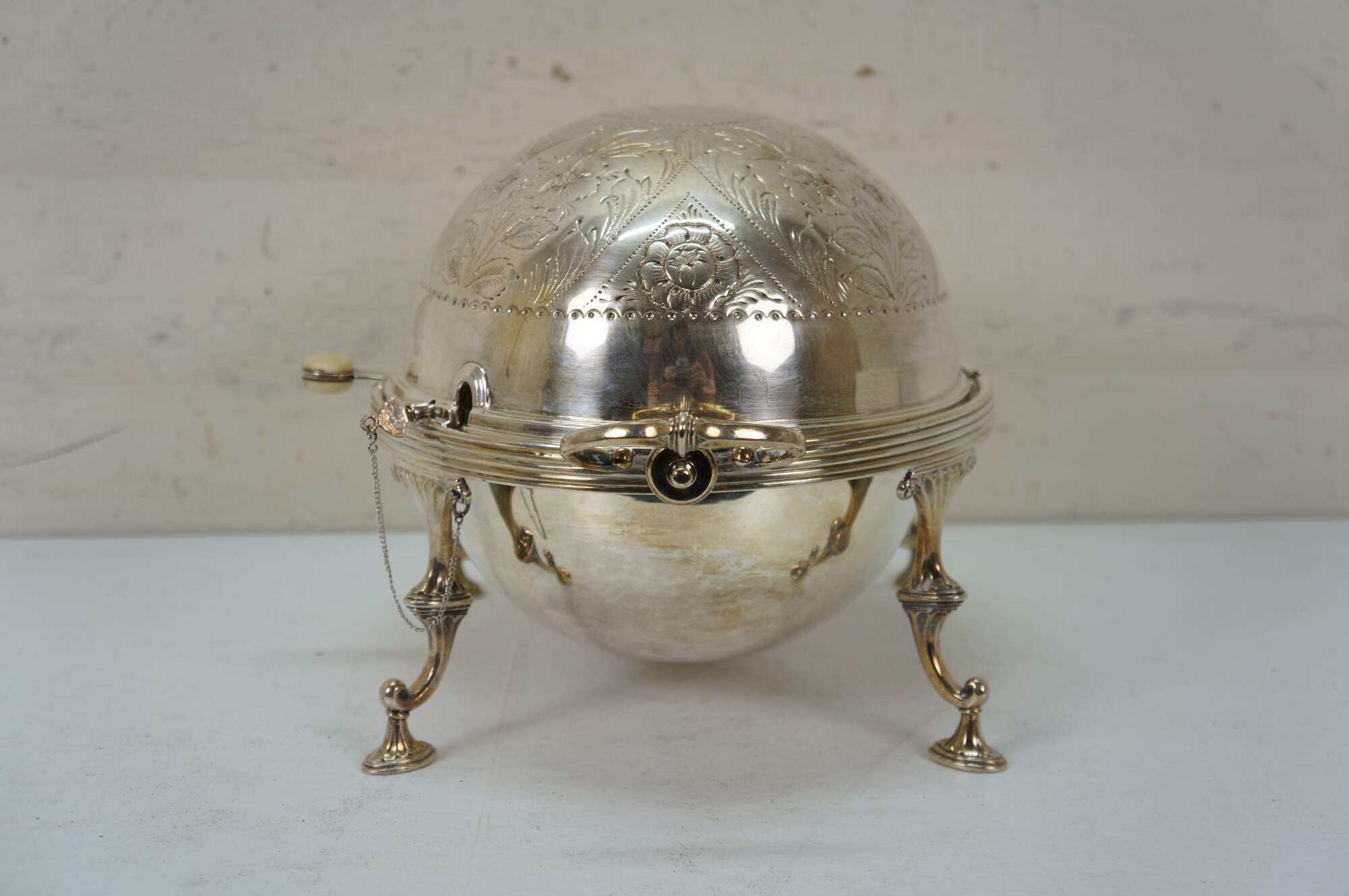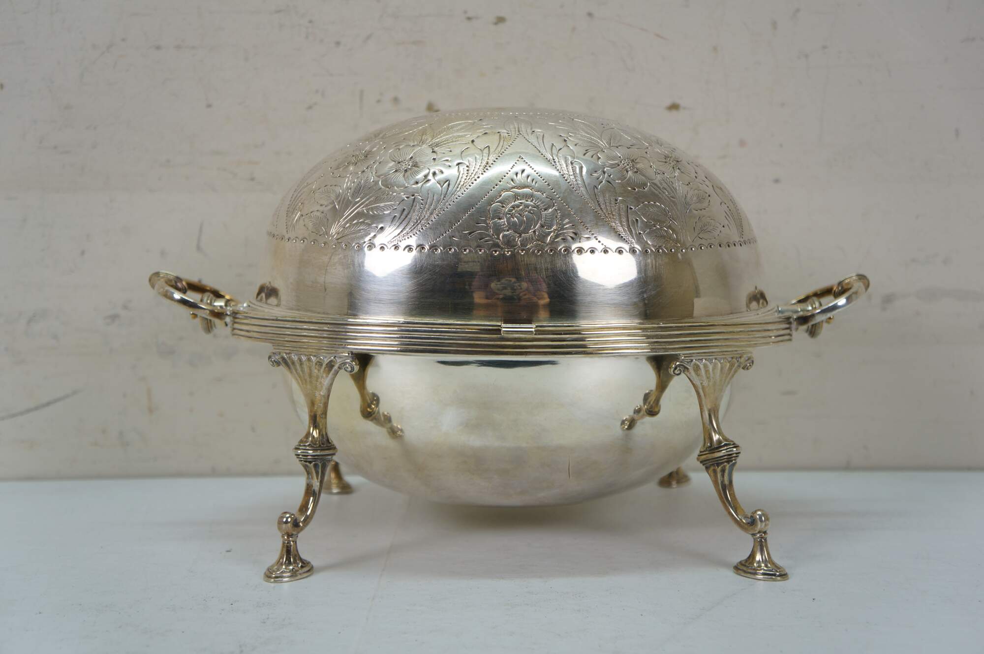 Late 19th to early 20th century English Victorian / Edwardian silver revolving / rotating dome top serving / chafing / warming food dish. Oval, egg shaped dome shaped dish with four C scroll legs, two side handles, and camel bone handle. To one side is a locking pin on a chain and a cut out for a serving utensil. Dome is etched with a floral design. Opens to reveal a removable inner dish and pierced tray. Unidentified maker - stamped JW&? EP GS in blocks with clipped corners. Numbered by hand 3033 / 3206.