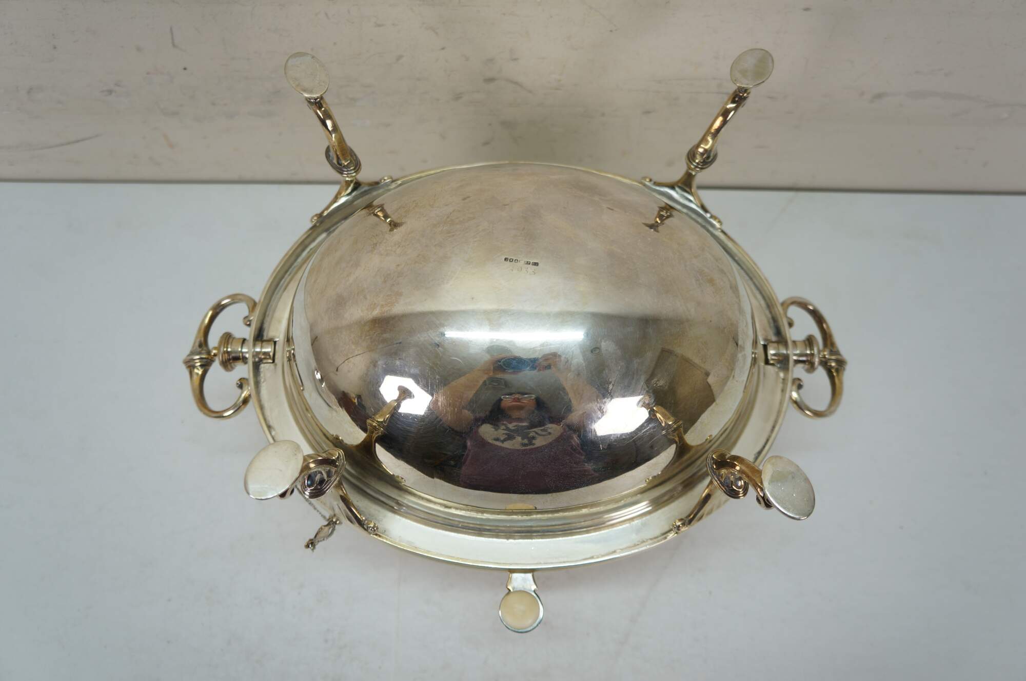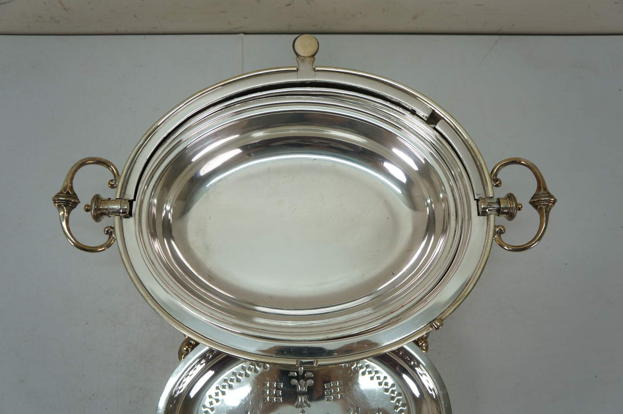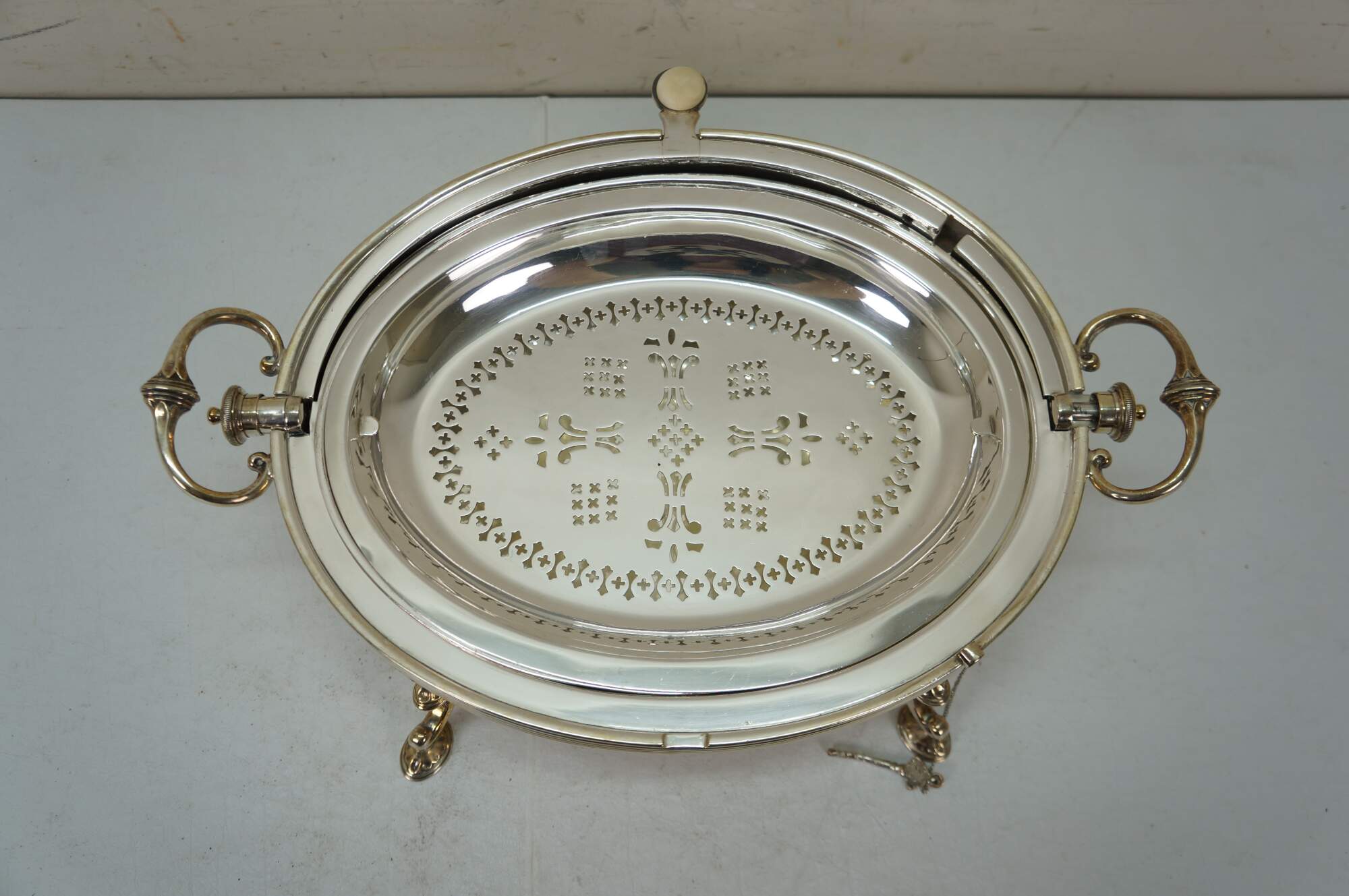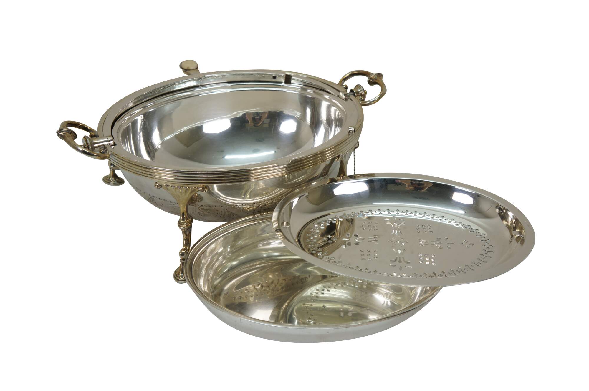 Late 19th to early 20th century English Victorian / Edwardian silver revolving / rotating dome top serving / chafing / warming food dish. Oval, egg shaped dome shaped dish with four C scroll legs, two side handles, and camel bone handle. To one side is a locking pin on a chain and a cut out for a serving utensil. Dome is etched with a floral design. Opens to reveal a removable inner dish and pierced tray. Unidentified maker - stamped JW&? EP GS in blocks with clipped corners. Numbered by hand 3033 / 3206.