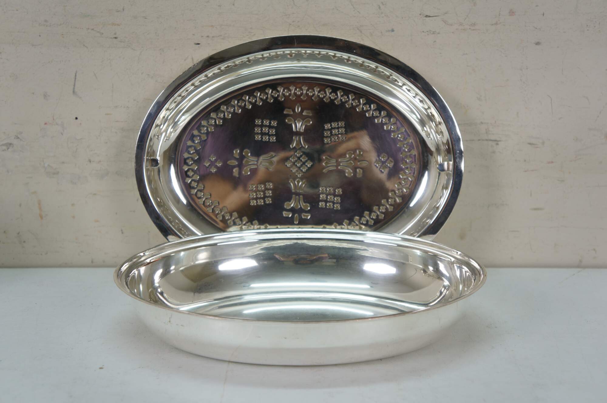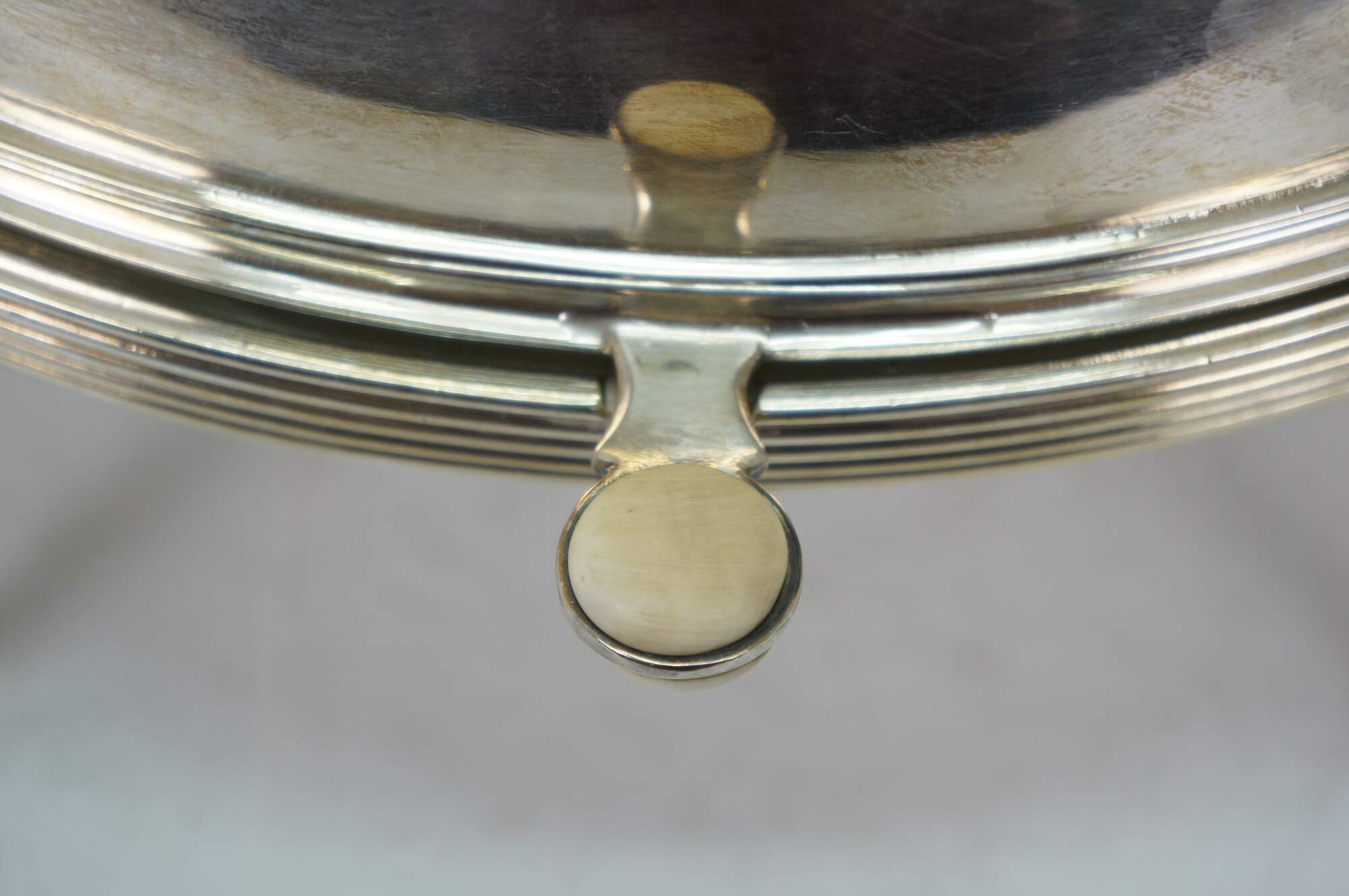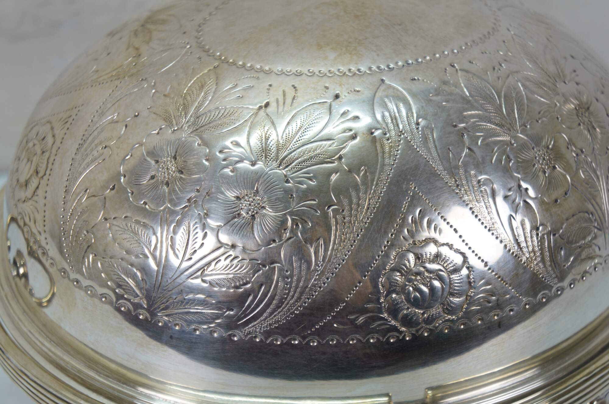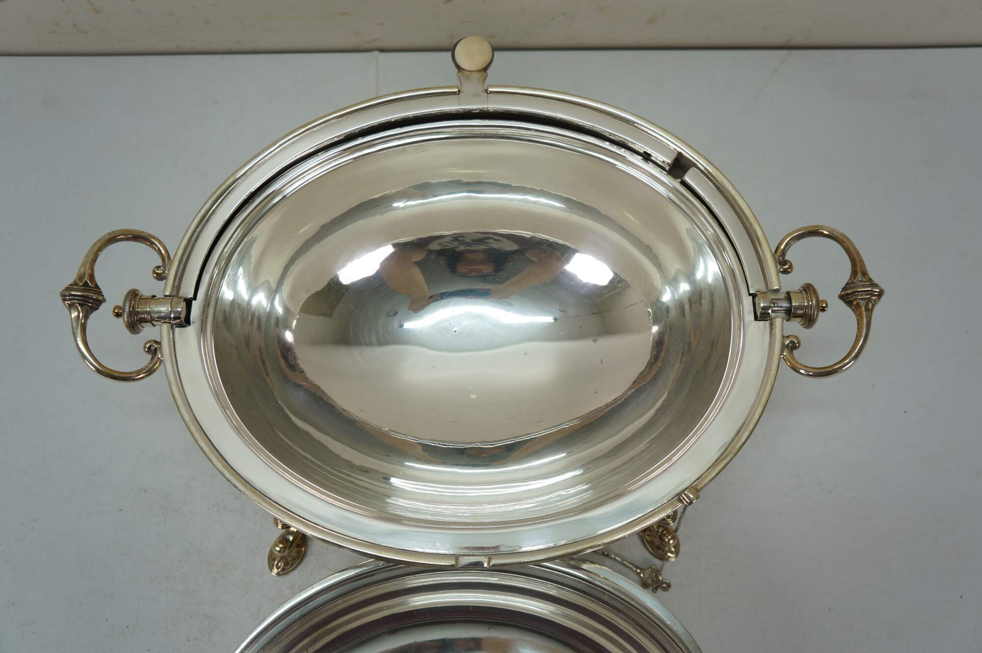 Late 19th to early 20th century English Victorian / Edwardian silver revolving / rotating dome top serving / chafing / warming food dish. Oval, egg shaped dome shaped dish with four C scroll legs, two side handles, and camel bone handle. To one side is a locking pin on a chain and a cut out for a serving utensil. Dome is etched with a floral design. Opens to reveal a removable inner dish and pierced tray. Unidentified maker - stamped JW&? EP GS in blocks with clipped corners. Numbered by hand 3033 / 3206.