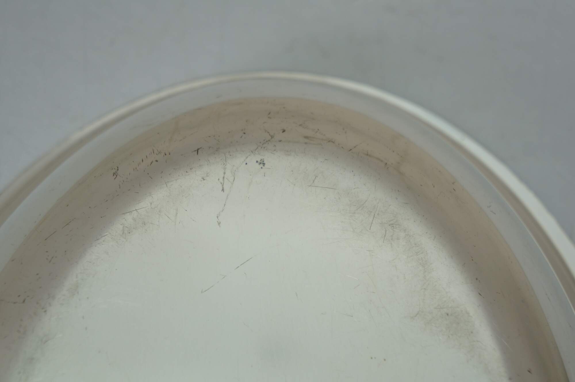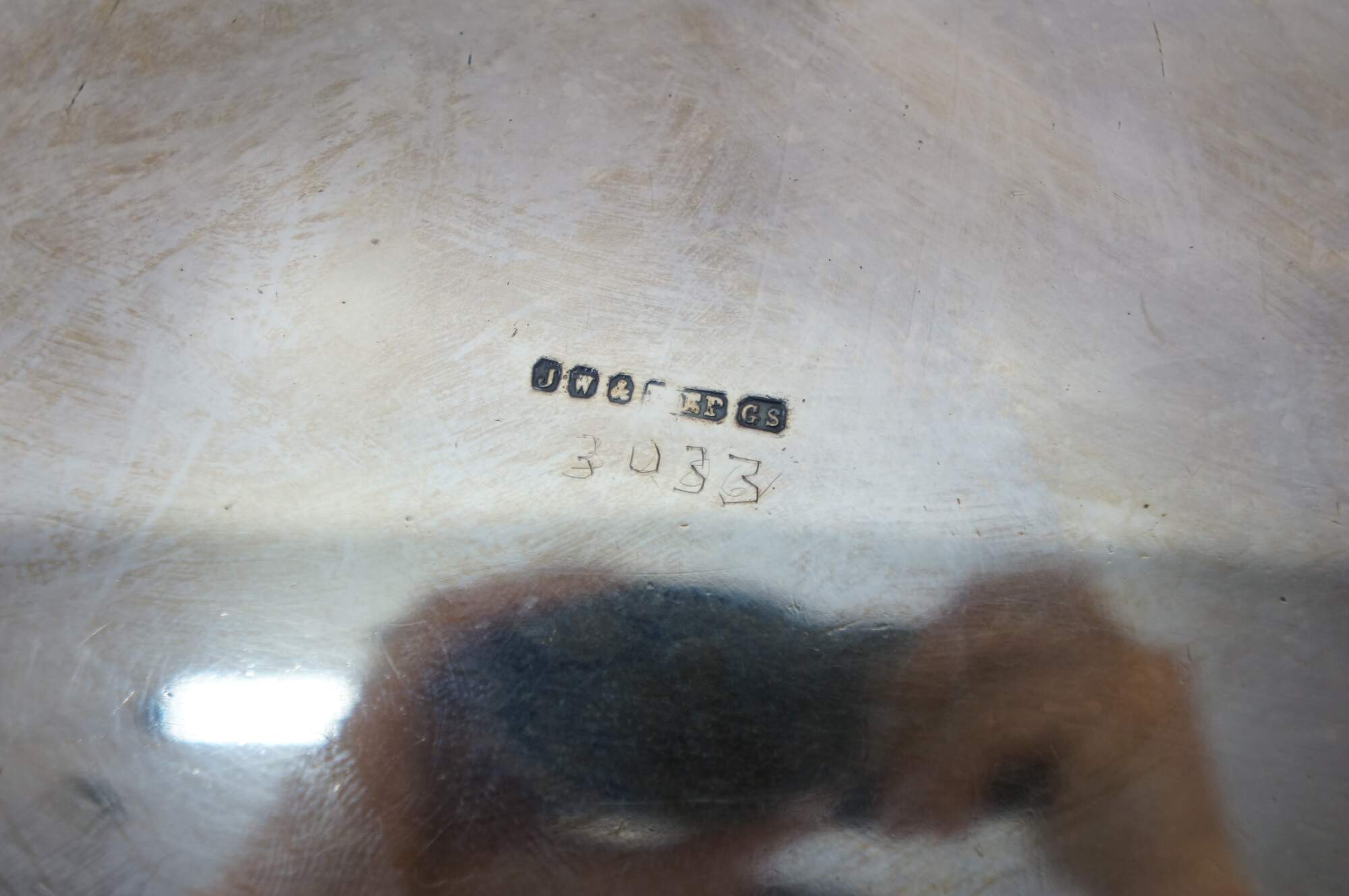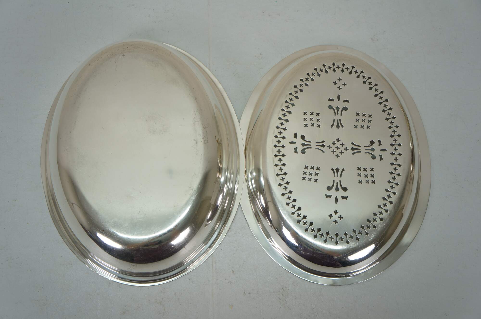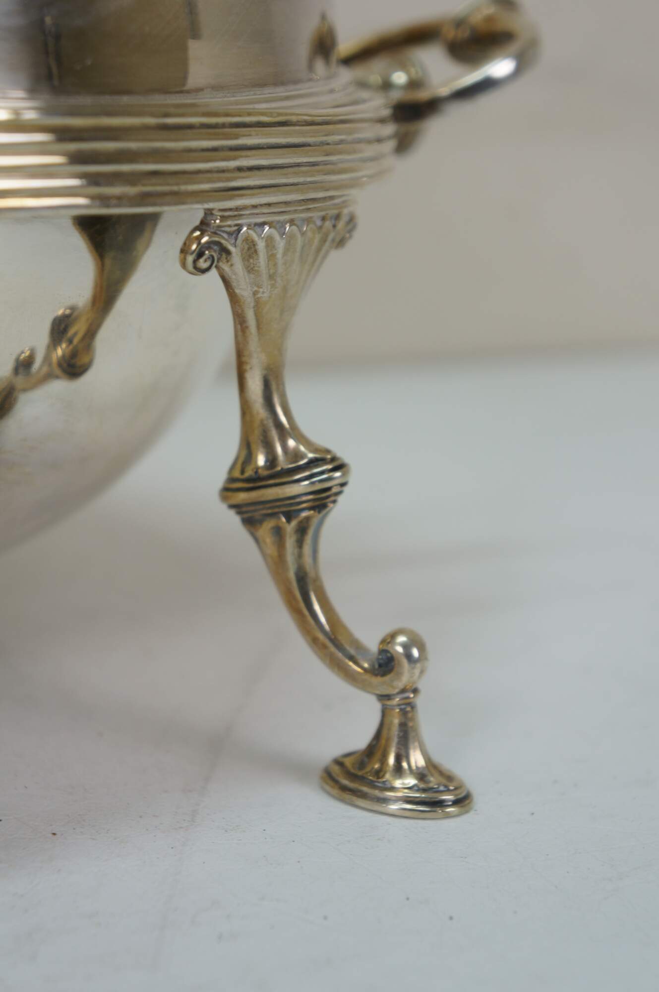 Late 19th to early 20th century English Victorian / Edwardian silver revolving / rotating dome top serving / chafing / warming food dish. Oval, egg shaped dome shaped dish with four C scroll legs, two side handles, and camel bone handle. To one side is a locking pin on a chain and a cut out for a serving utensil. Dome is etched with a floral design. Opens to reveal a removable inner dish and pierced tray. Unidentified maker - stamped JW&? EP GS in blocks with clipped corners. Numbered by hand 3033 / 3206.