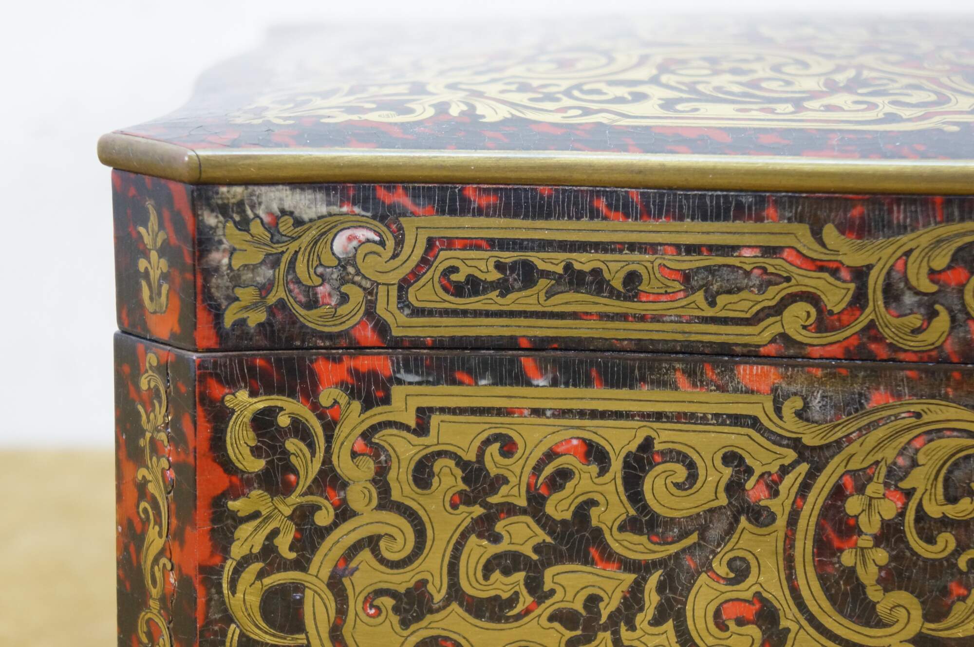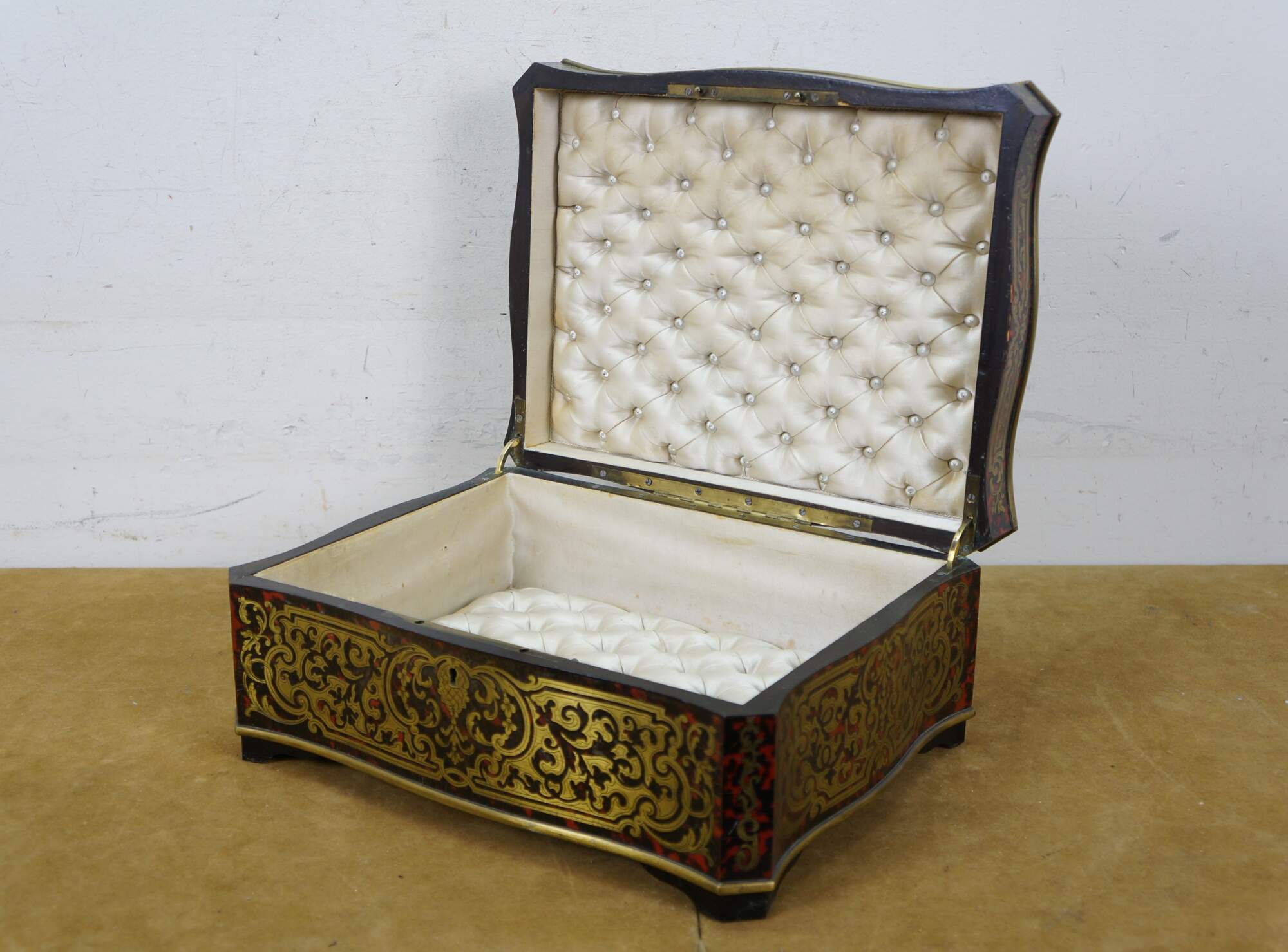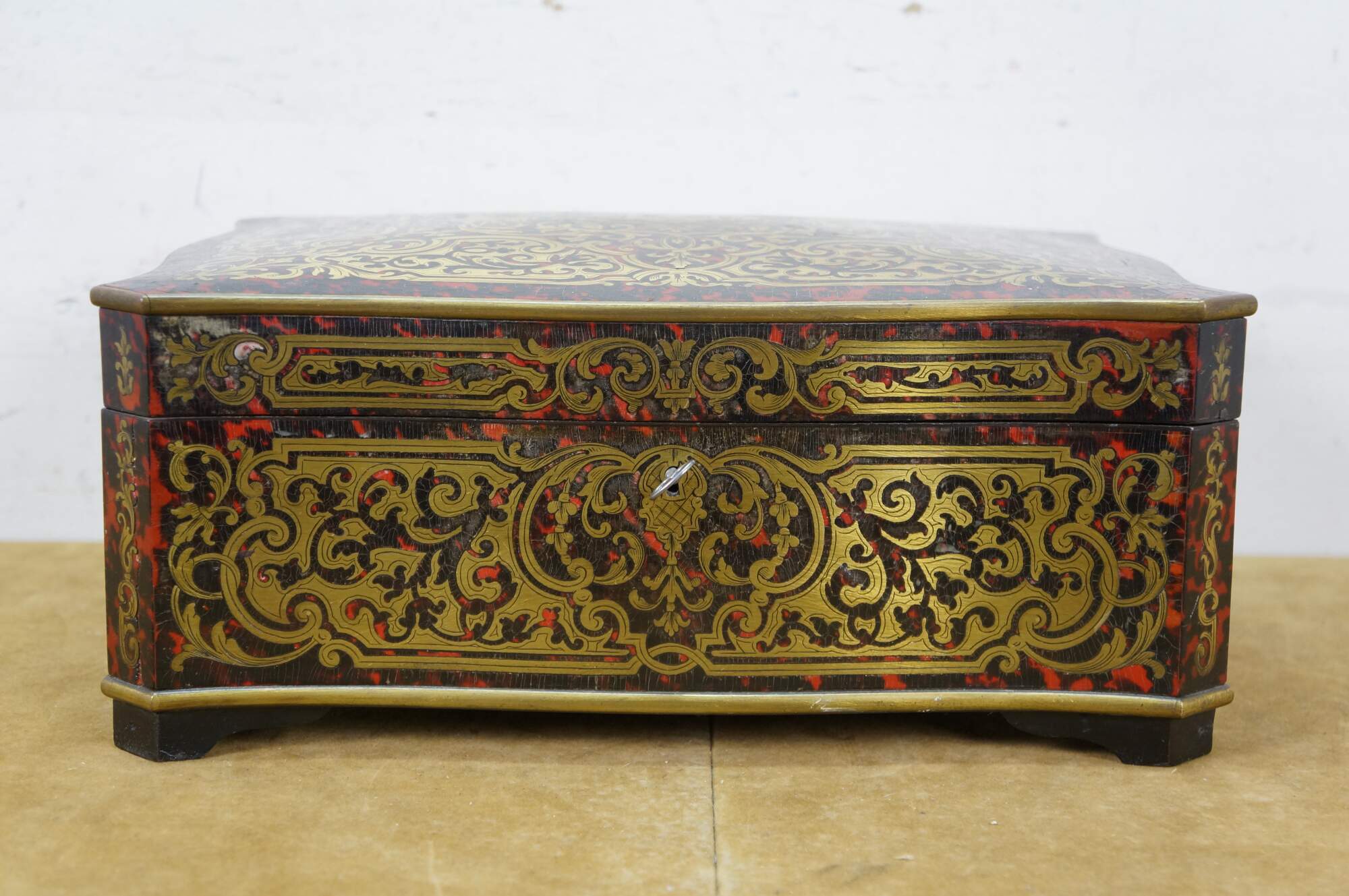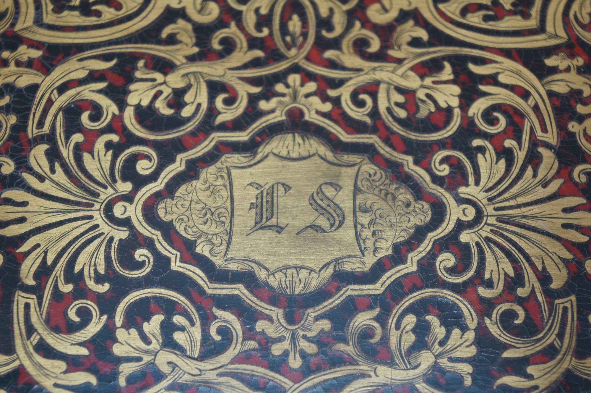 Antique 19th century Napoleon III era French Marquetry Boulle box. Red and black tortoiseshell with foliate brass inlay. Decoration on top includes the monogram LS. Rectangular form with scalloped edges and cut corners. Key included; lock is operational. Interior is fully lined with white tufted silk. Base initialed VS in ink.