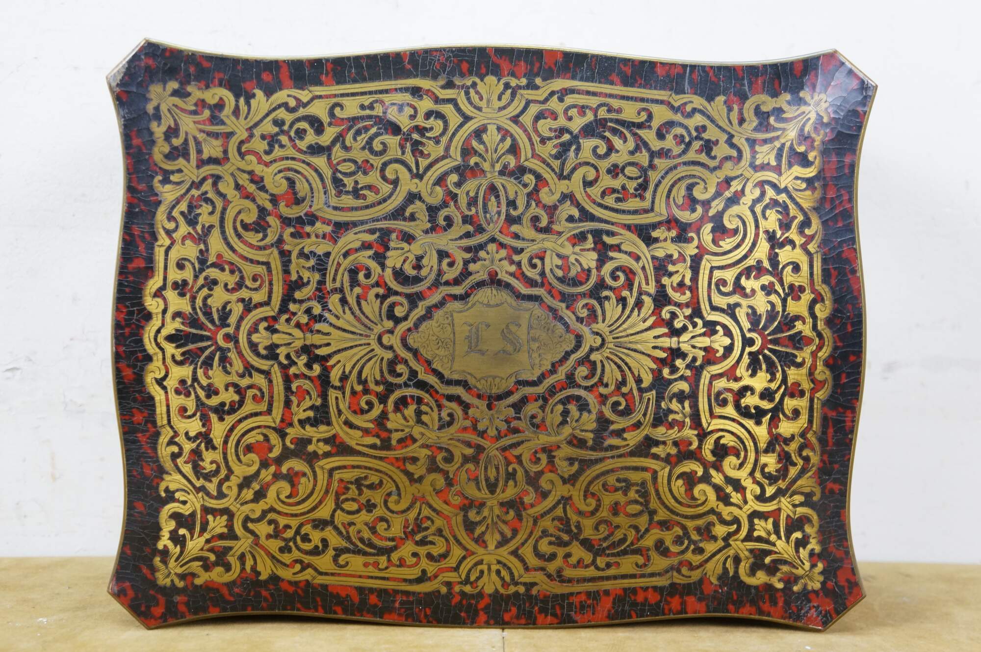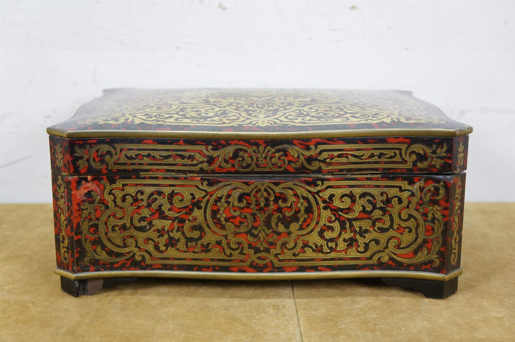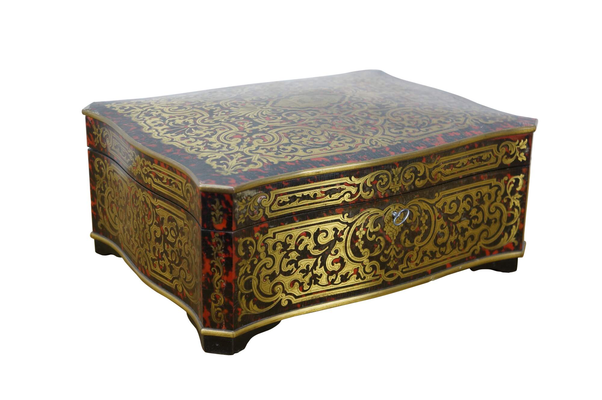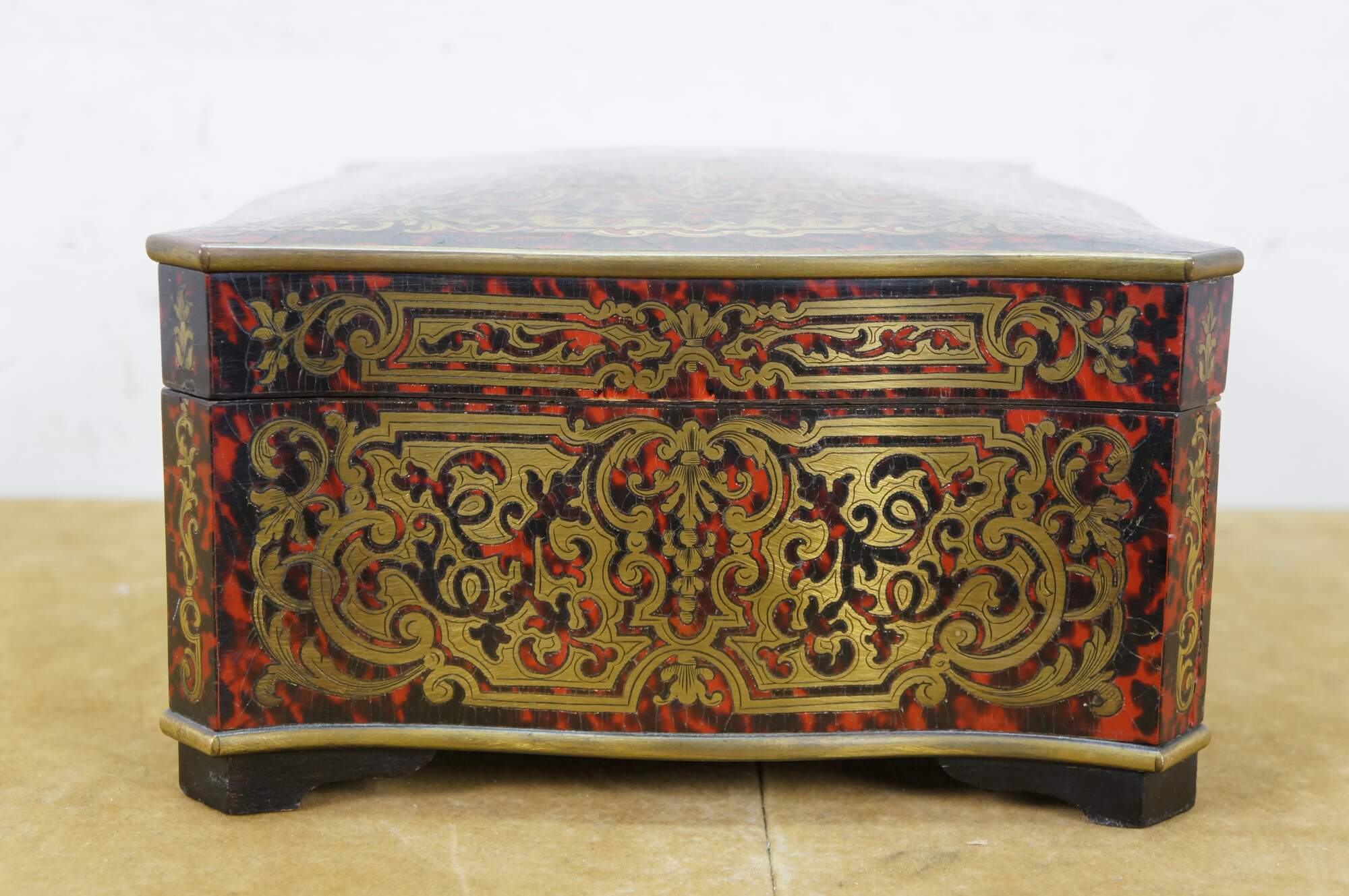 Antique 19th century Napoleon III era French Marquetry Boulle box. Red and black tortoiseshell with foliate brass inlay. Decoration on top includes the monogram LS. Rectangular form with scalloped edges and cut corners. Key included; lock is operational. Interior is fully lined with white tufted silk. Base initialed VS in ink.