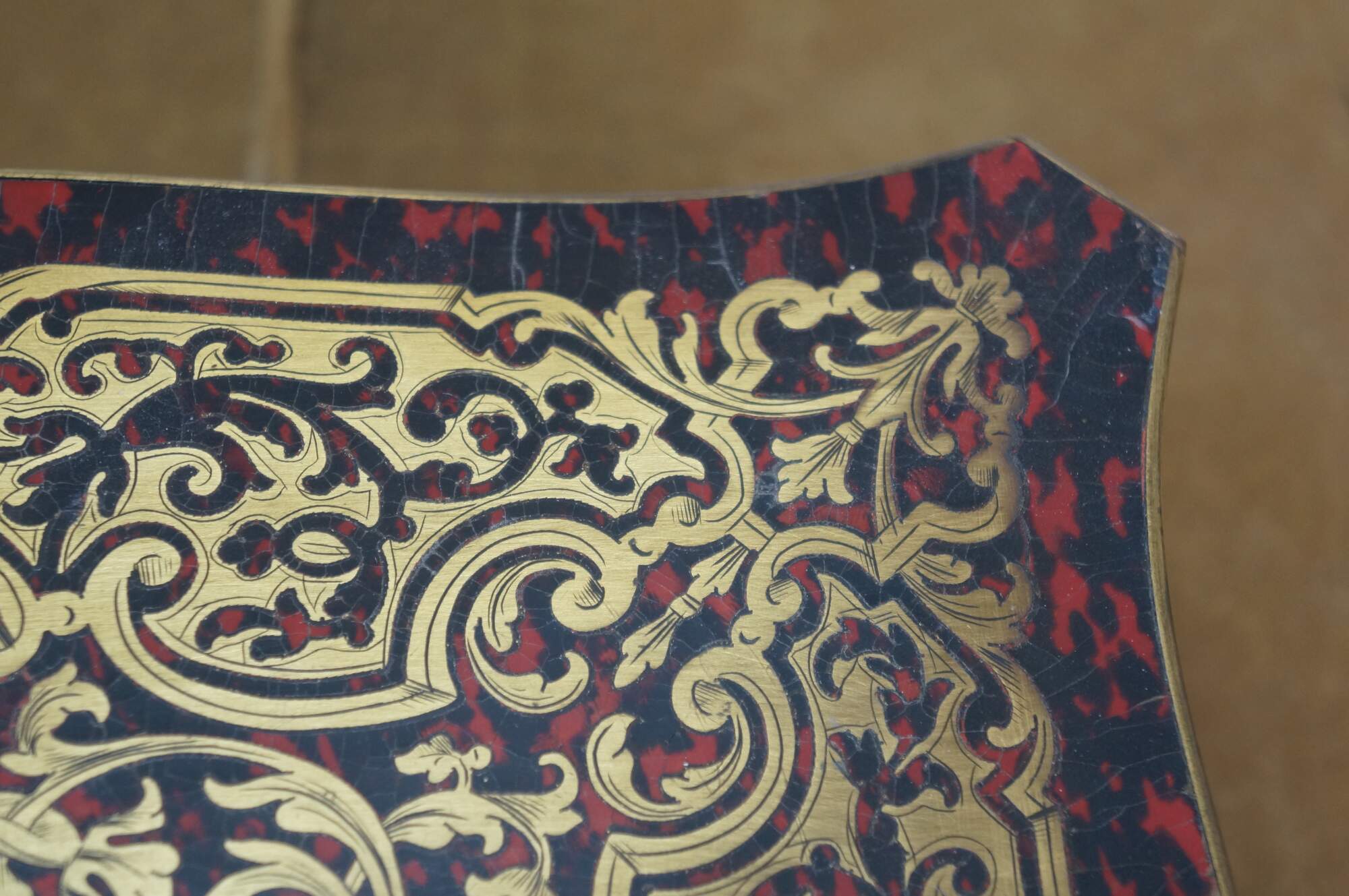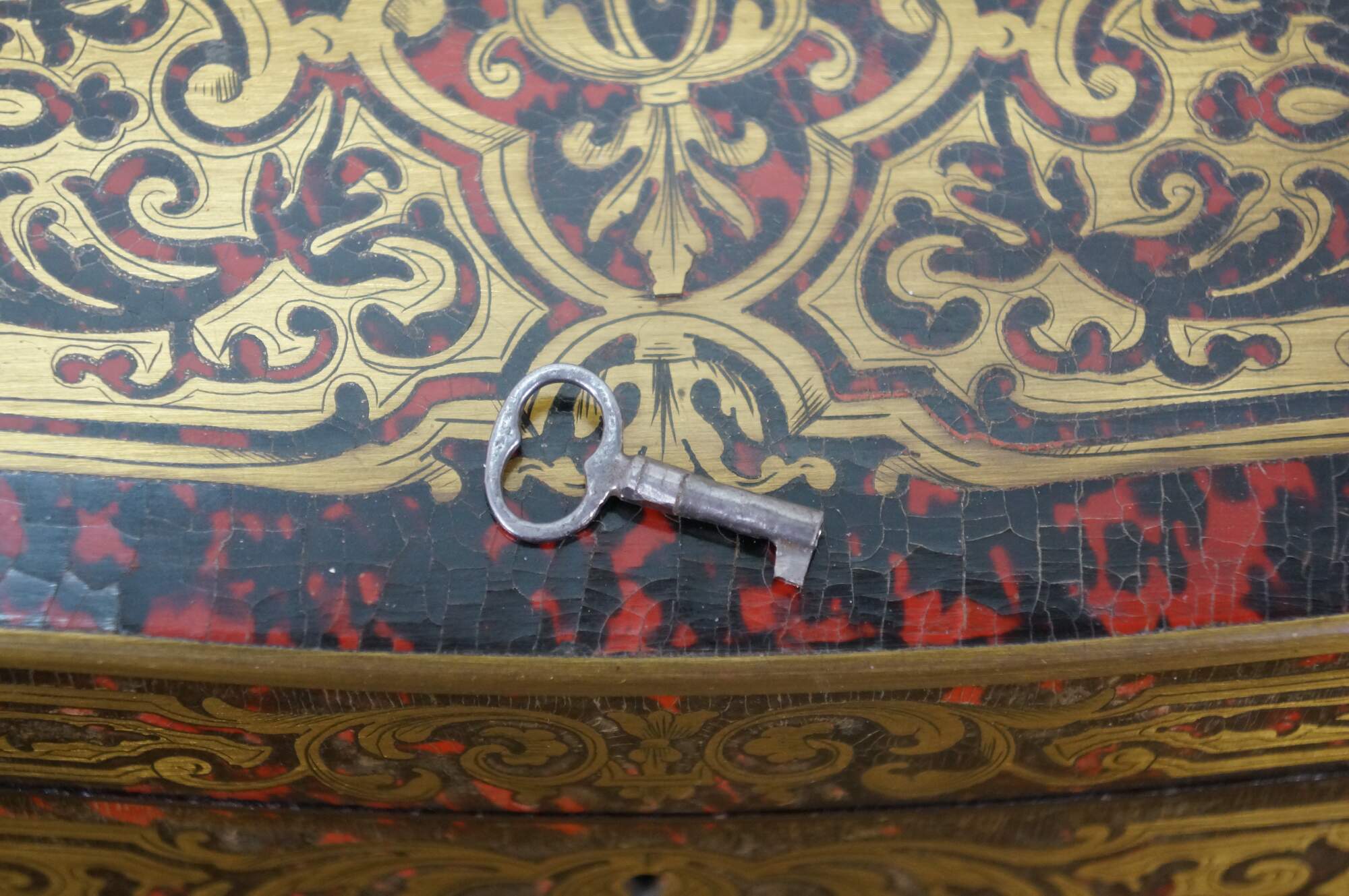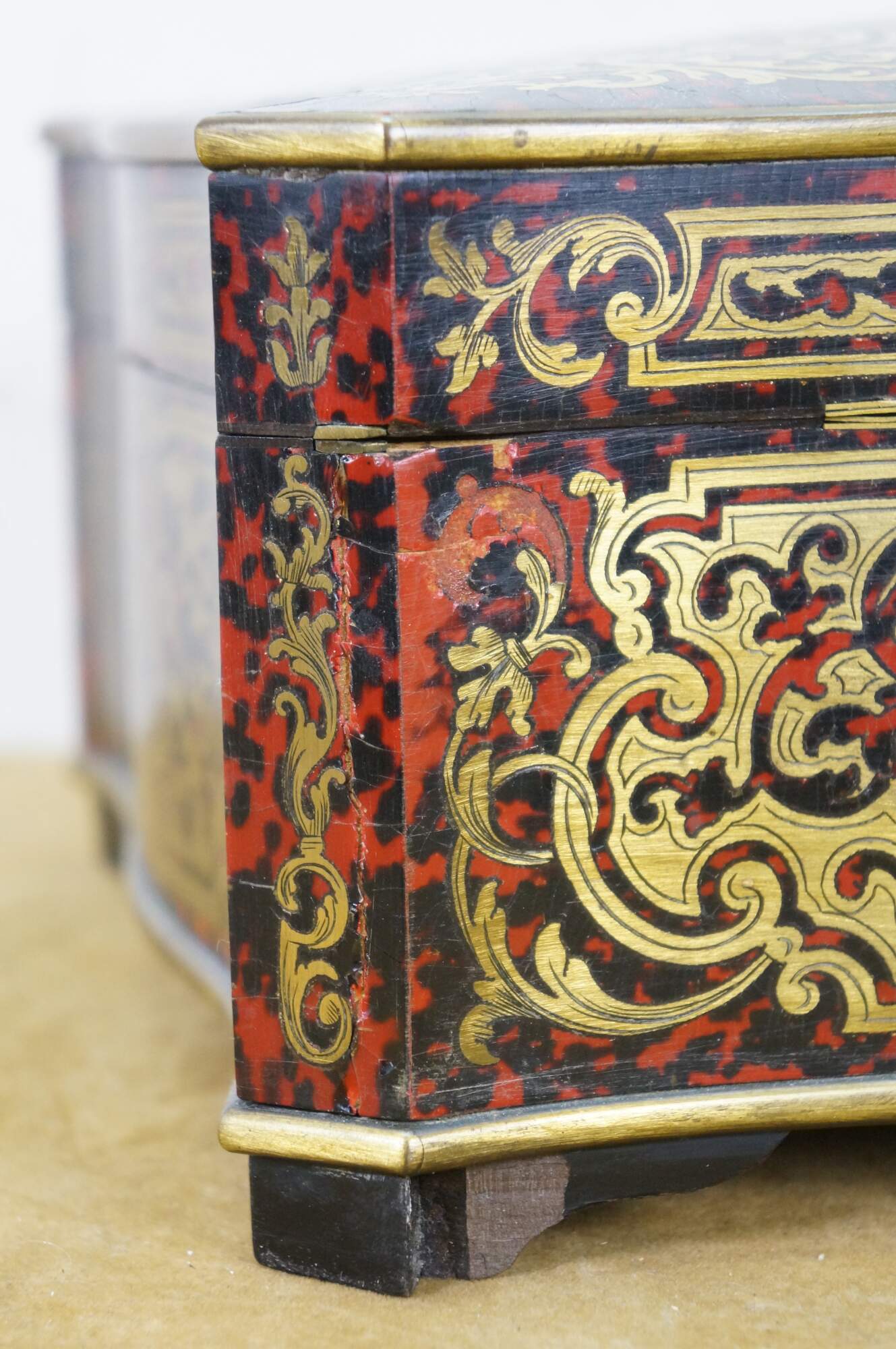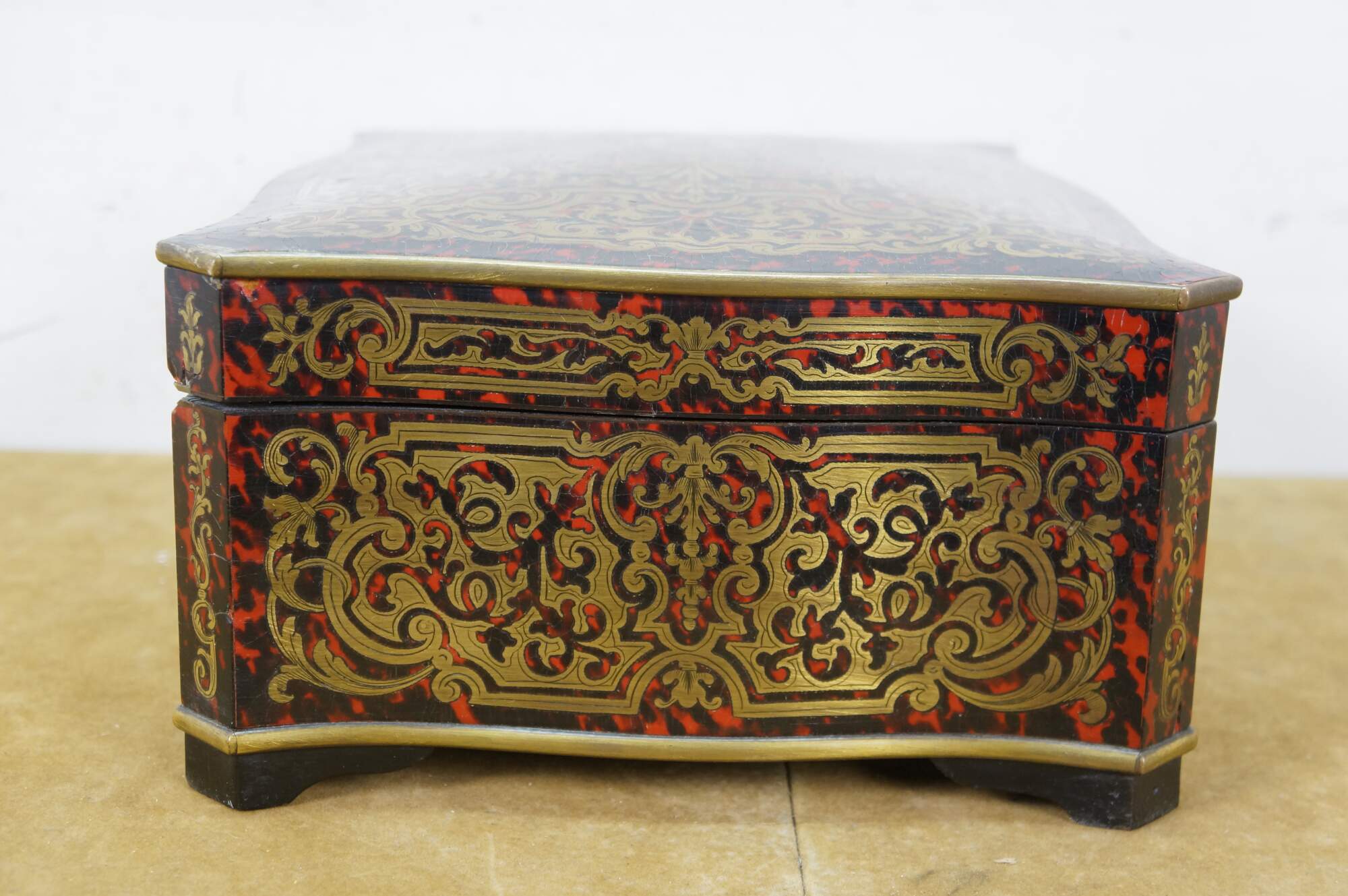 Antique 19th century Napoleon III era French Marquetry Boulle box. Red and black tortoiseshell with foliate brass inlay. Decoration on top includes the monogram LS. Rectangular form with scalloped edges and cut corners. Key included; lock is operational. Interior is fully lined with white tufted silk. Base initialed VS in ink.