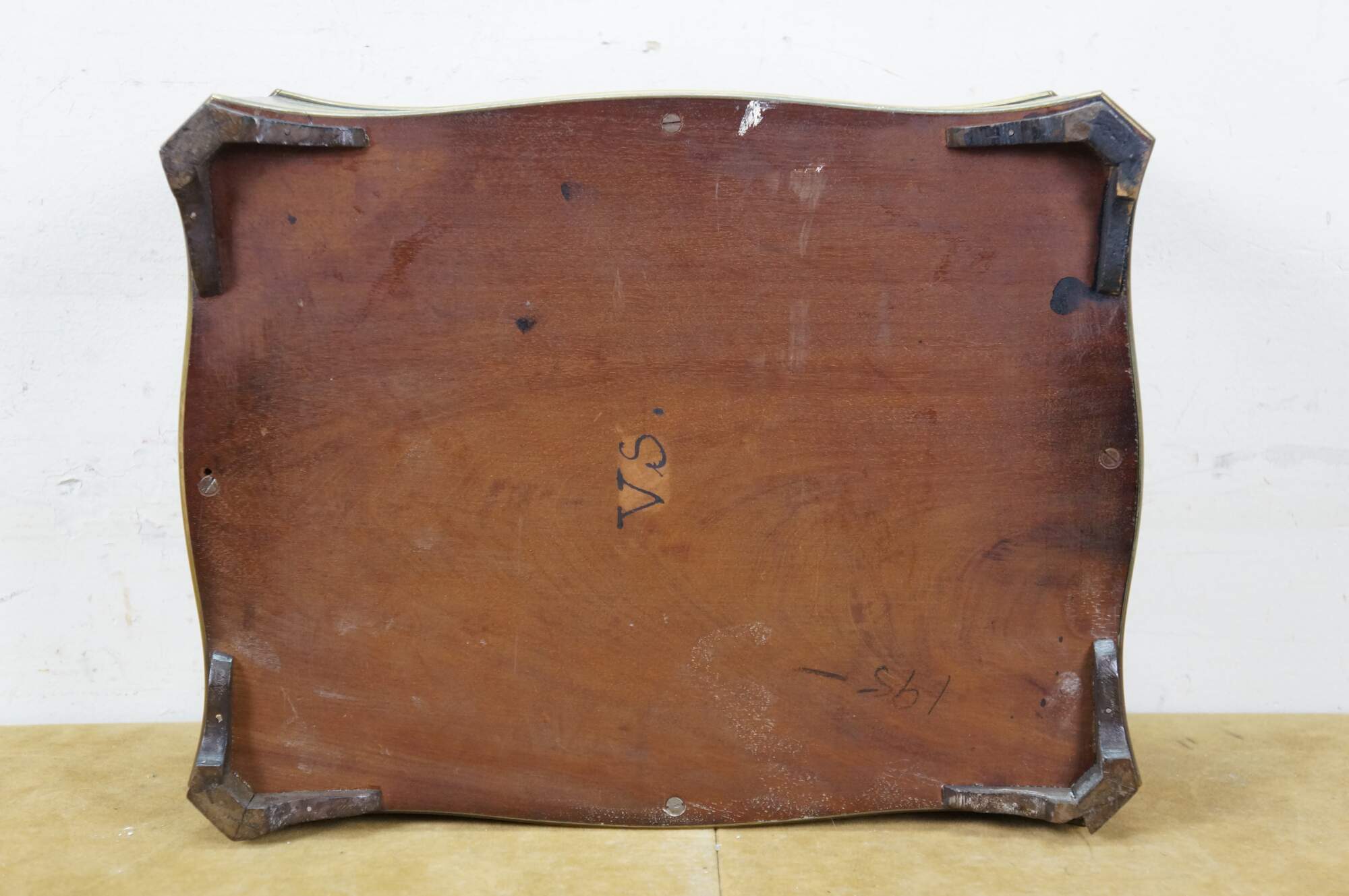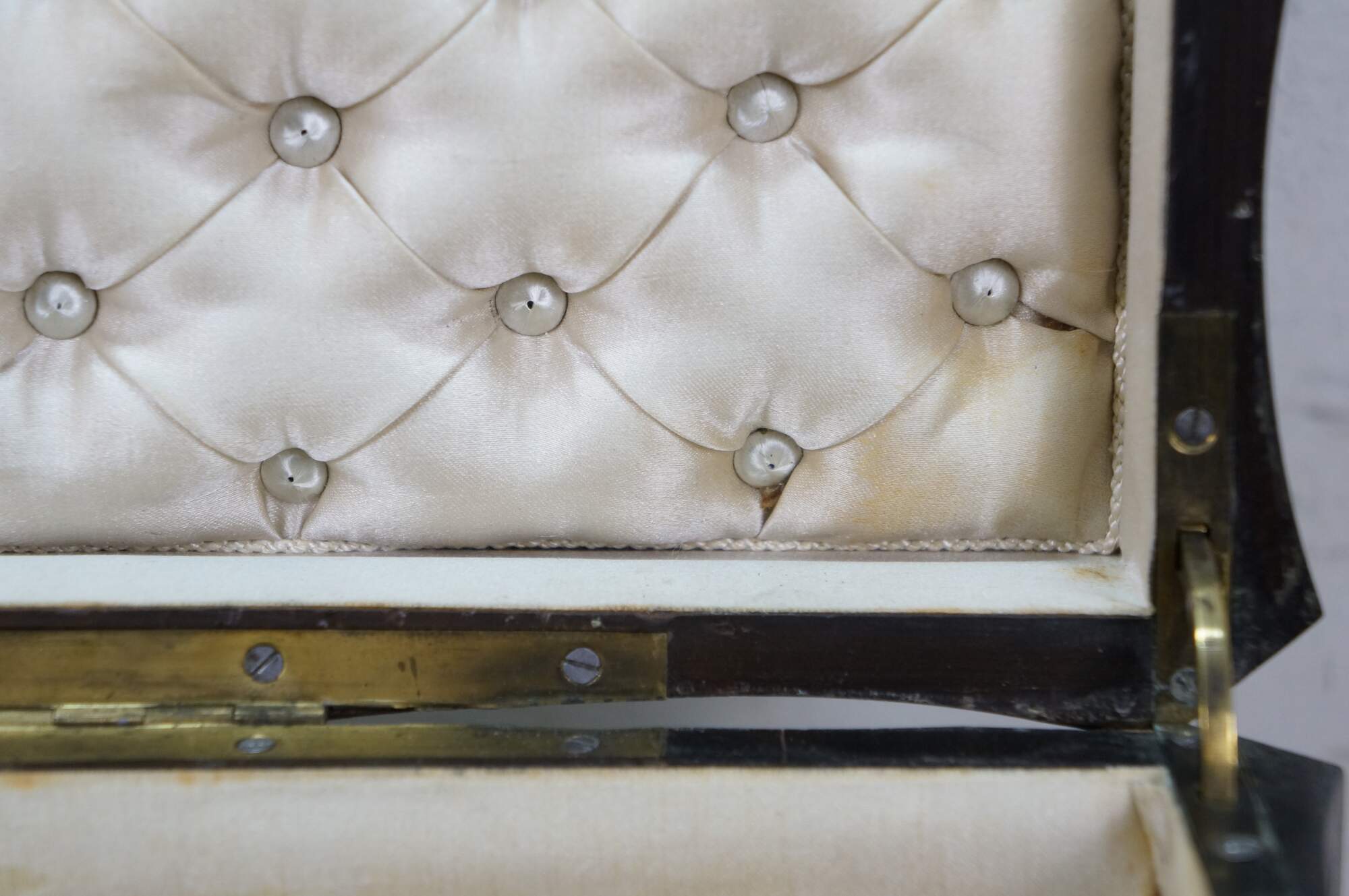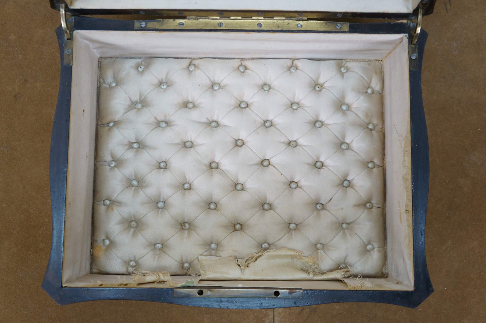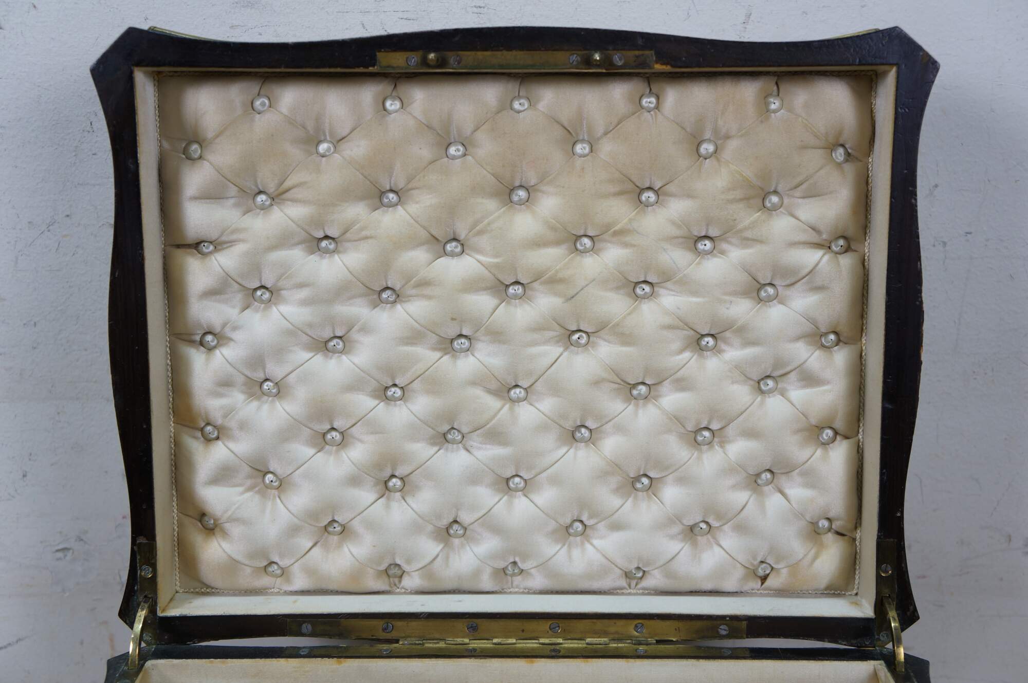 Antique 19th century Napoleon III era French Marquetry Boulle box. Red and black tortoiseshell with foliate brass inlay. Decoration on top includes the monogram LS. Rectangular form with scalloped edges and cut corners. Key included; lock is operational. Interior is fully lined with white tufted silk. Base initialed VS in ink.