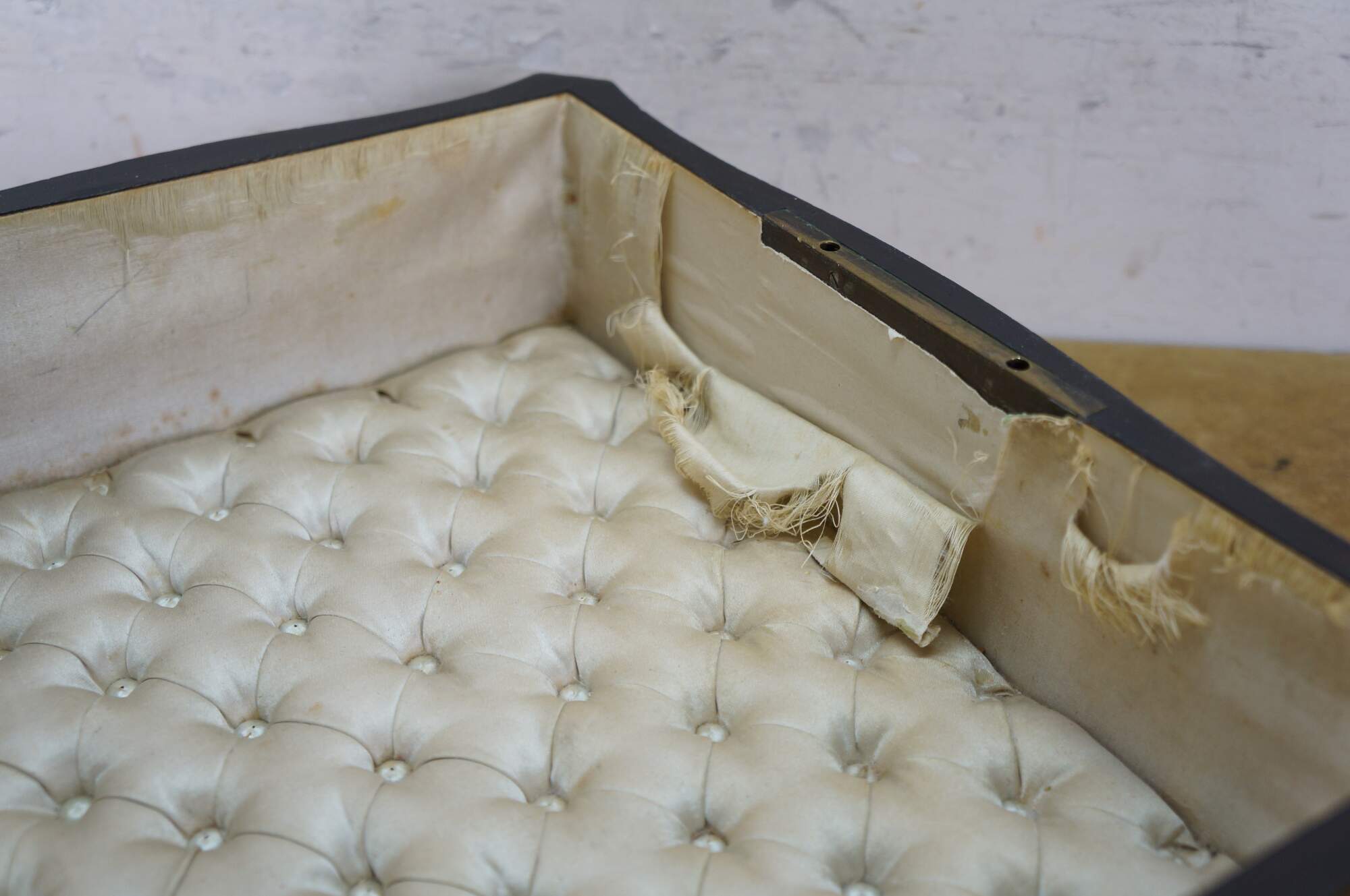 Wear and distressing from age and use, discoloration/some frying to interior silk; alligatoring/some chipping / finish loss / crazing to exterior, key works.