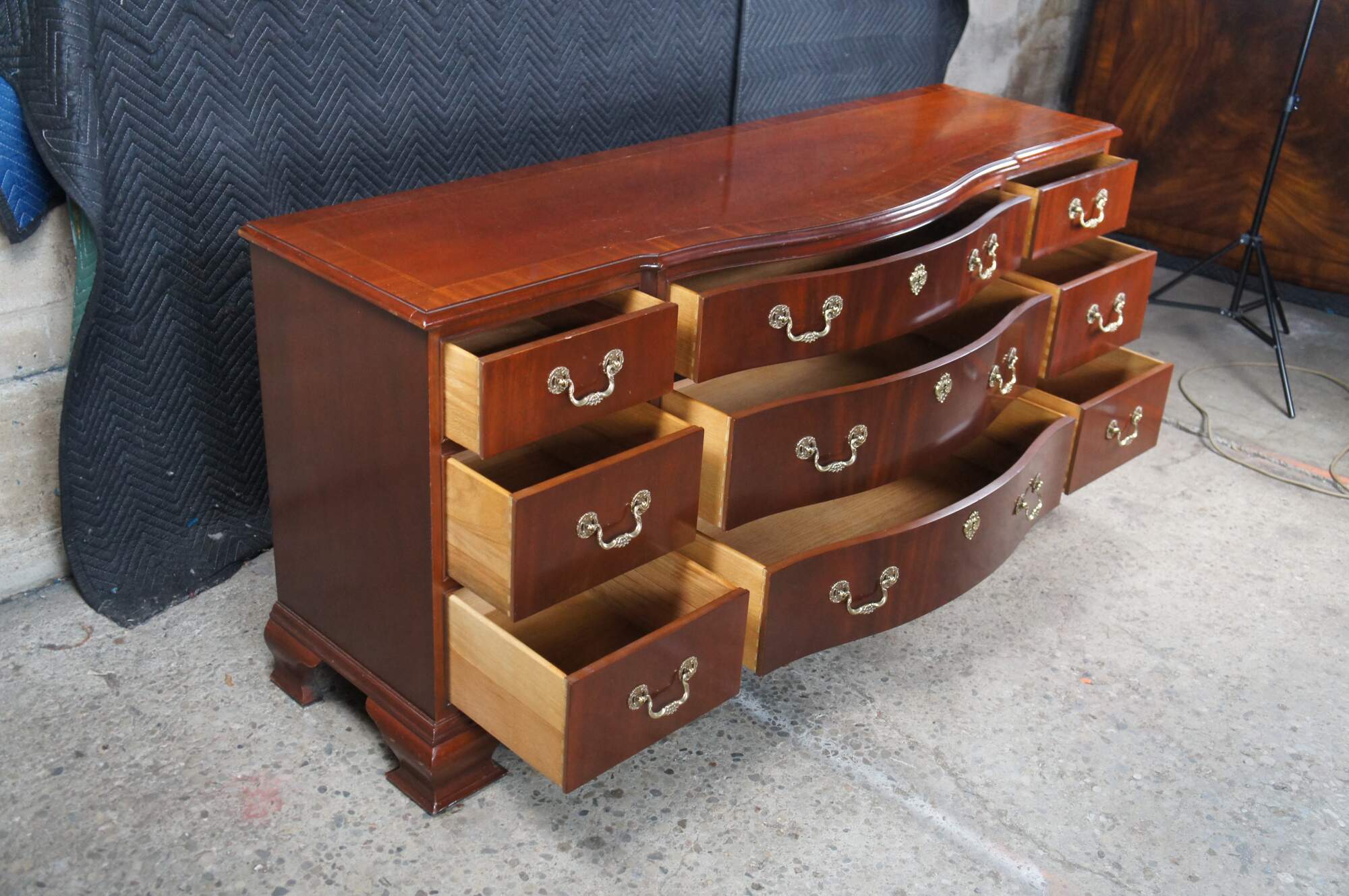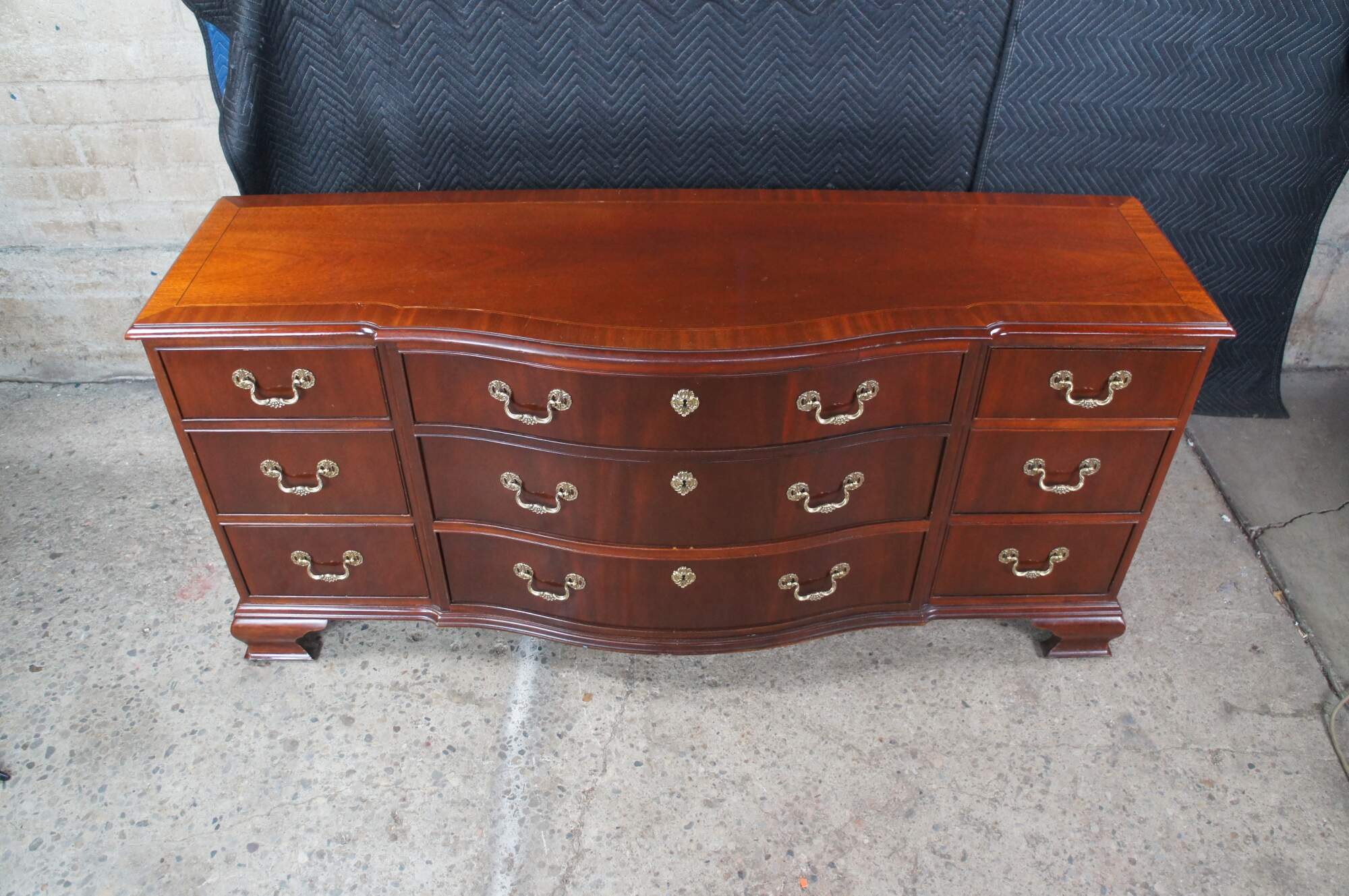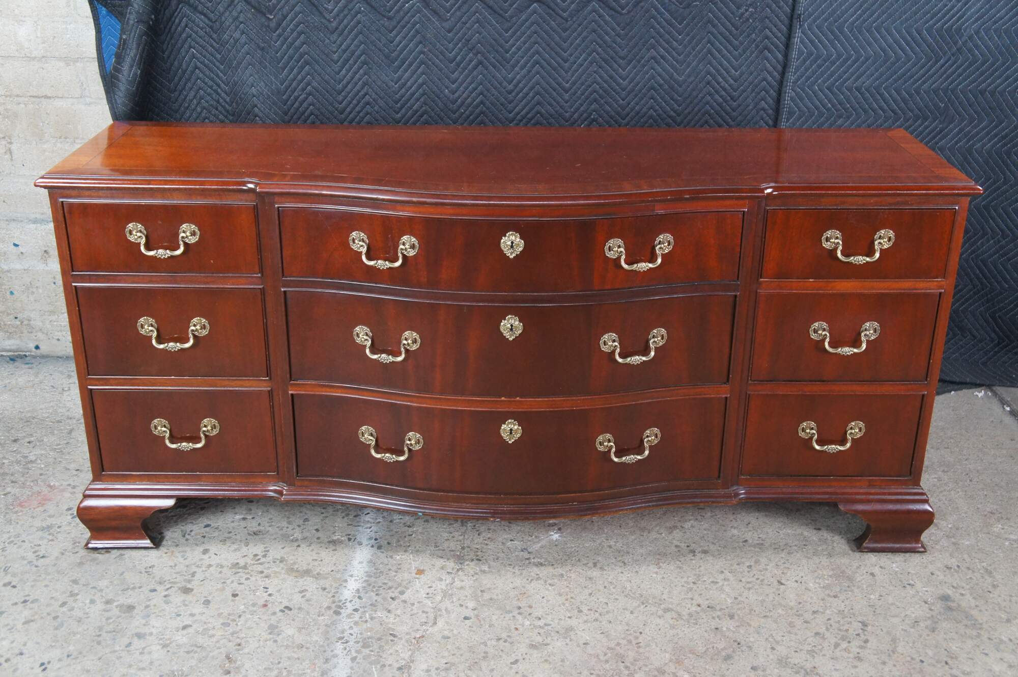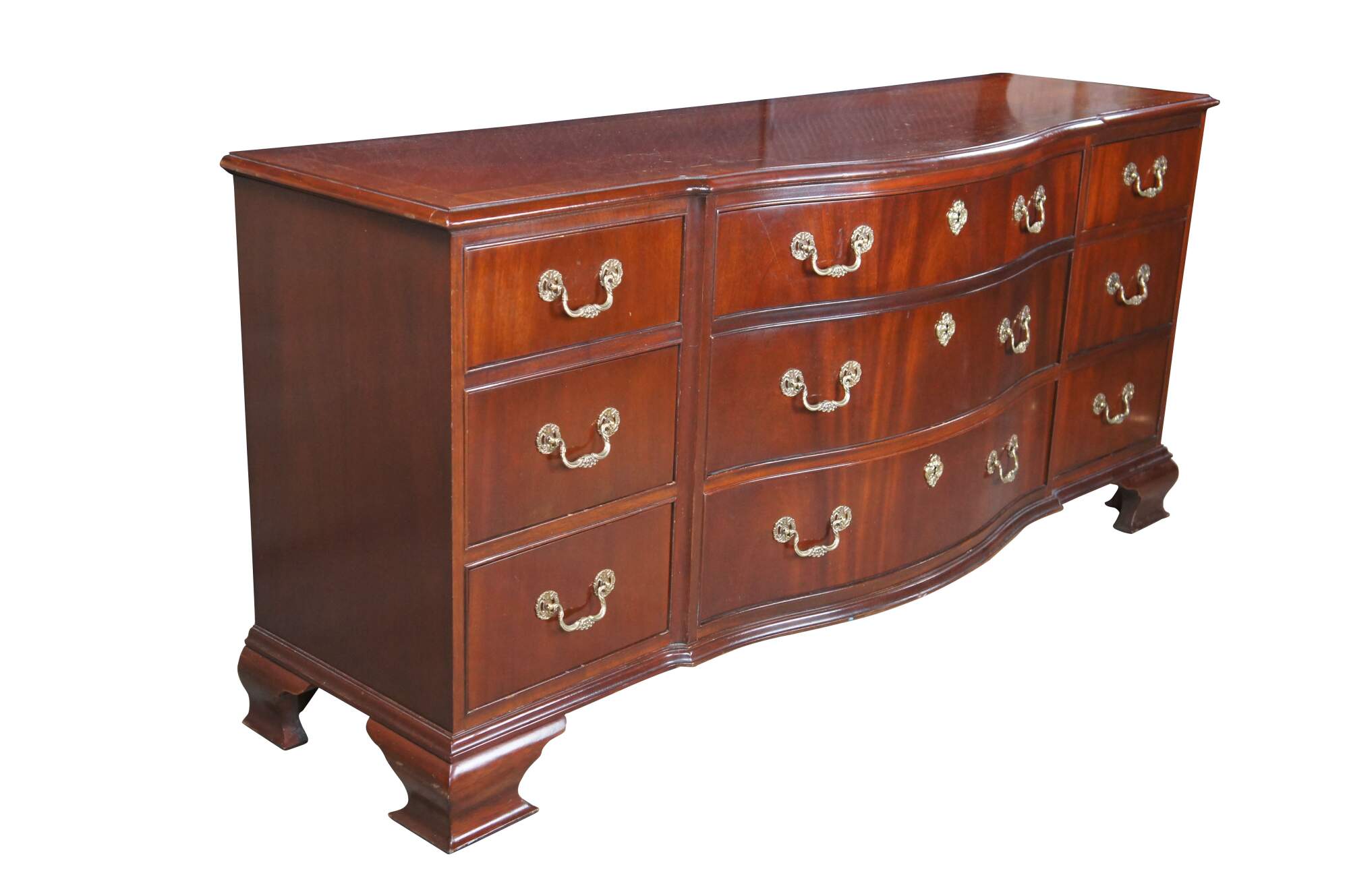 Vintage Baker Furniture long triple dresser, chest of drawers or sideboard. Made of mahogany featuring Georgian styling with serpentine bowffront showcasing inlaid banded top and nine dovetailed drawers supported by bracket feet. Includes beautiful polished brass bale hardware and escutcheon plates. Circa 1980s