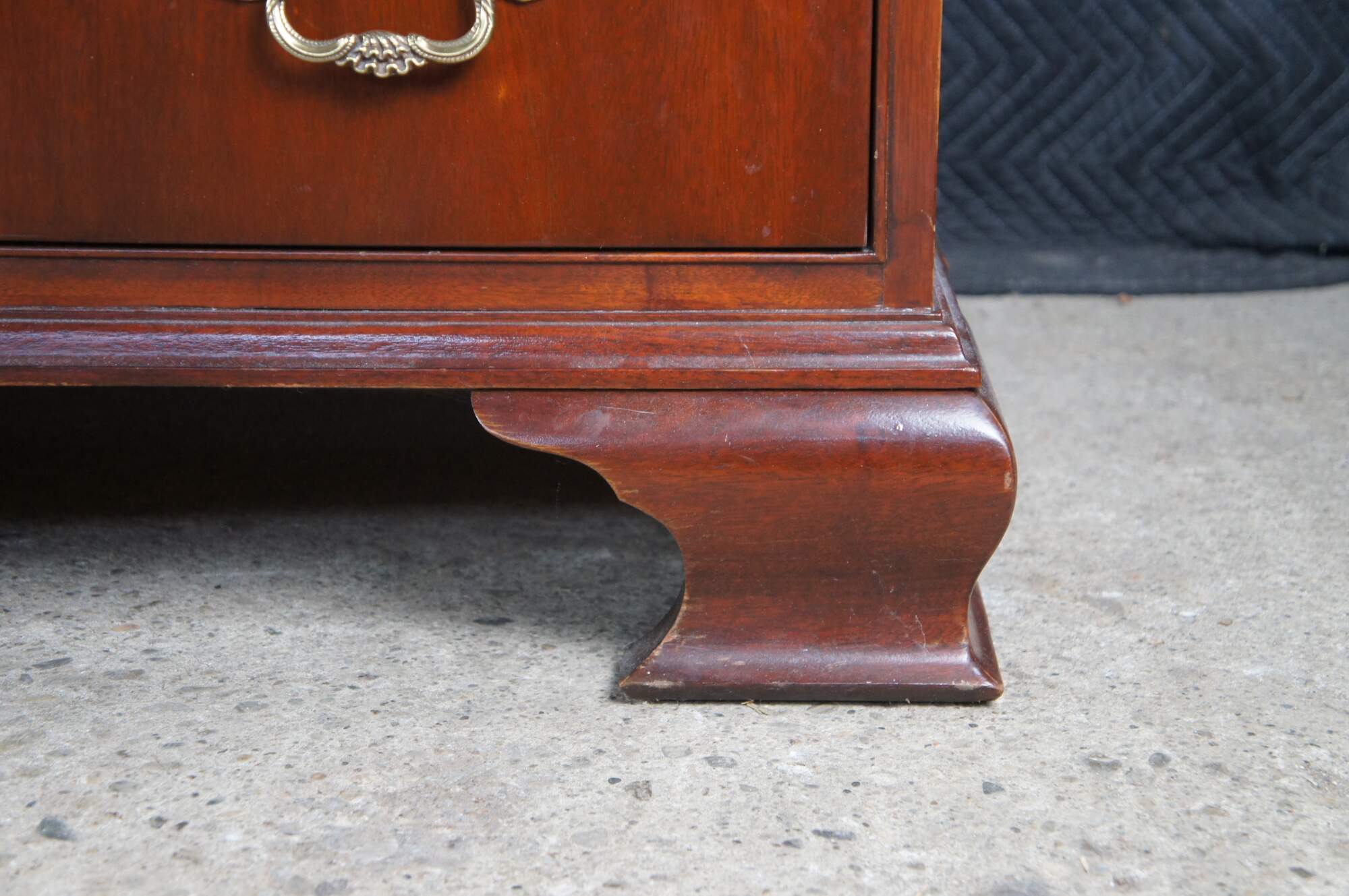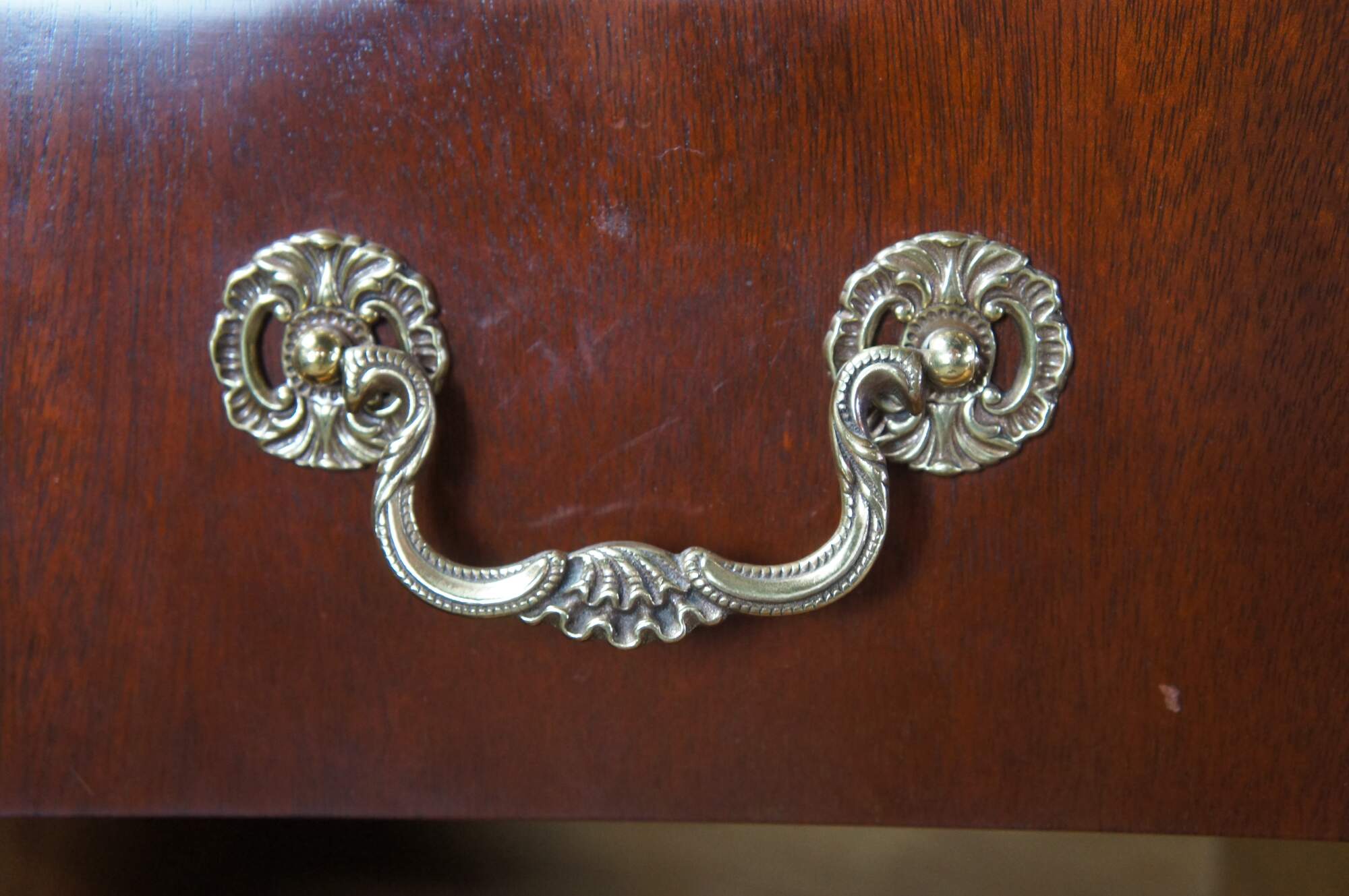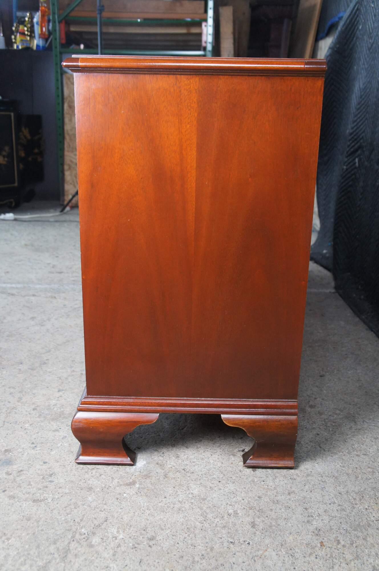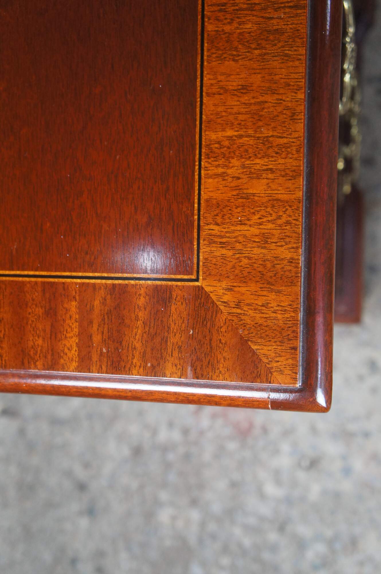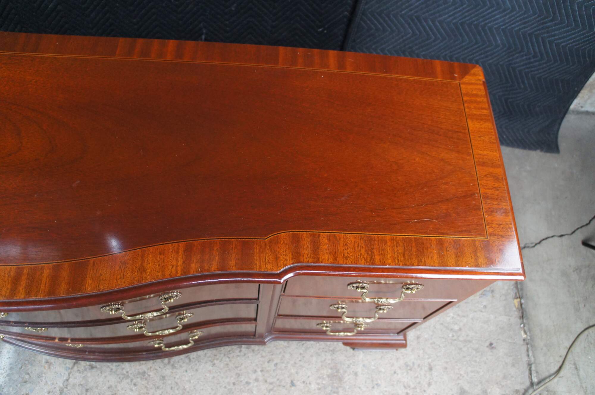 Vintage Baker Furniture long triple dresser, chest of drawers or sideboard. Made of mahogany featuring Georgian styling with serpentine bowffront showcasing inlaid banded top and nine dovetailed drawers supported by bracket feet. Includes beautiful polished brass bale hardware and escutcheon plates. Circa 1980s
