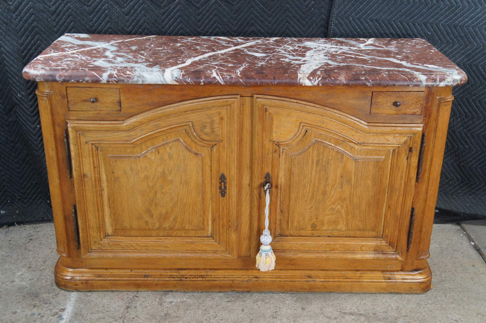 Striking Mid 18th Century French Louis XIV style Hunting Cabinet. Made from oak with a thick ruege marble beveled top over an oak case with two hand dovetailed knife drawers and a larger lower domed cabinet for storage with working lock and key. The buffet rest on molded plinth base. A remarkable addition to any space.