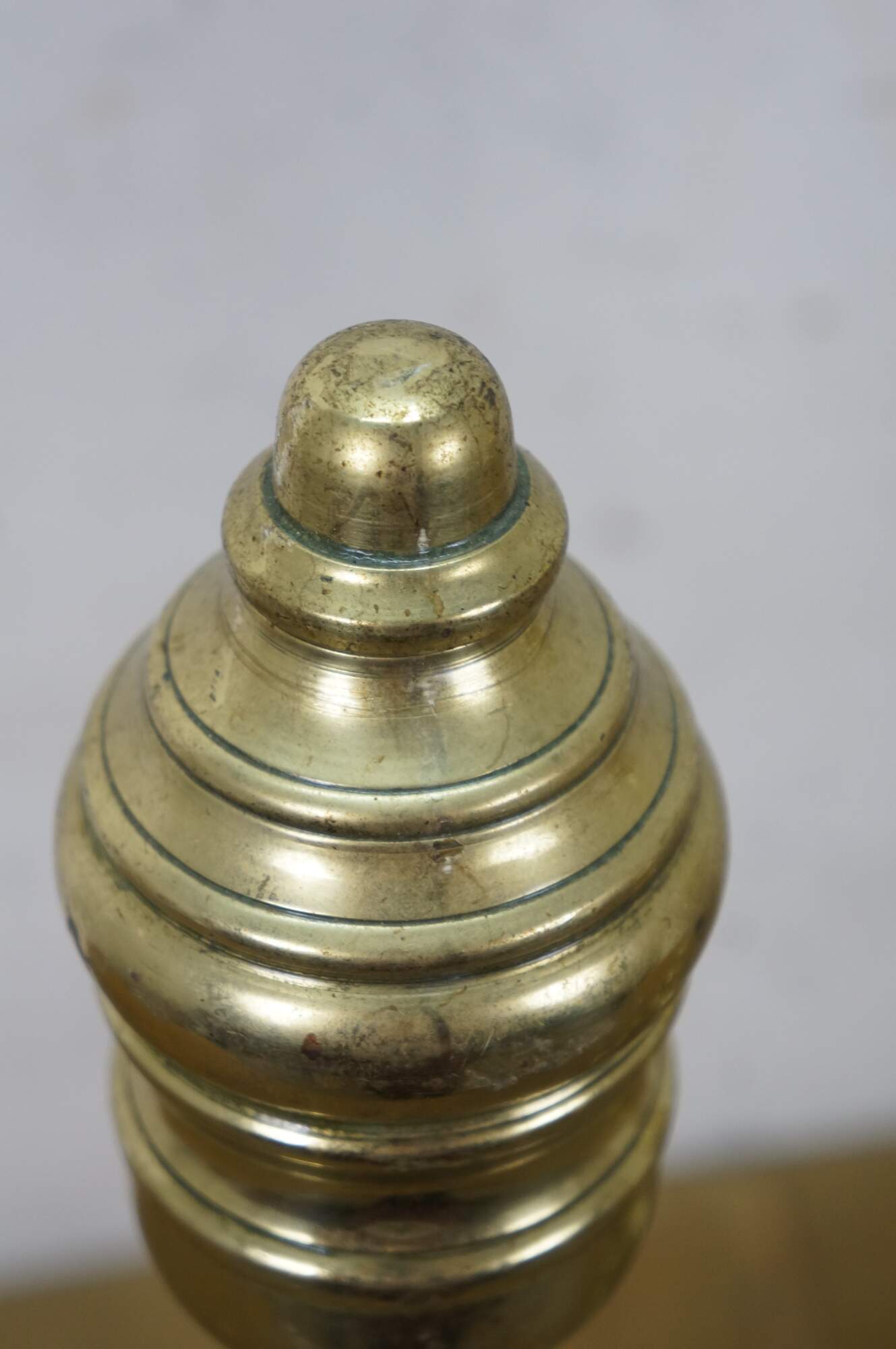 Pair of antique brass Chippendale / Georgian / Colonial style andirons / fire dogs - beehive shaped baluster style posts on bowed legs with orb feet.