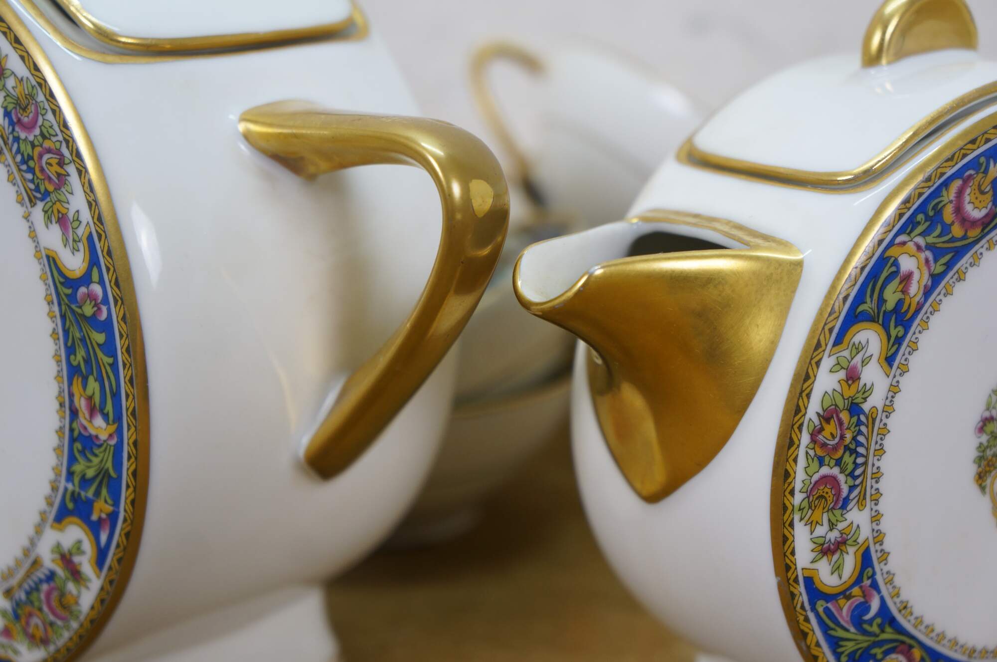 11 piece antique French Limoges porcelain demitasse tea set by TLB (Touze, Lemaître Frères & Blancher). Pots feature a stylized round, art deco inspired shape. White porcelain with gold gilt details and folk art style floral pattern in blue, pink, and yellow. Includes: Teapot with Lid, 6 Teacups, Dessert Plate, and Sugar / Waste Pot with Lid. Made in France.