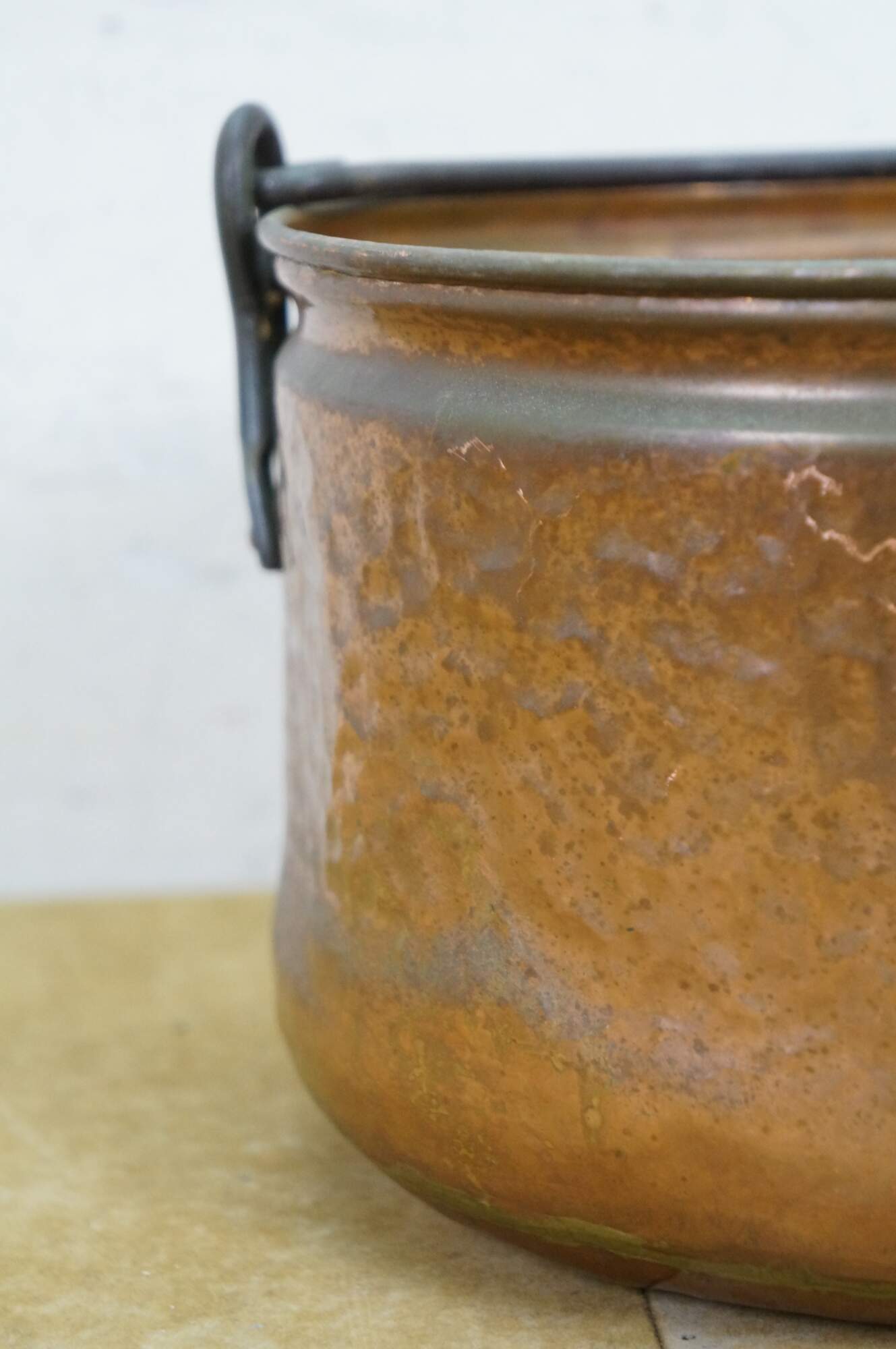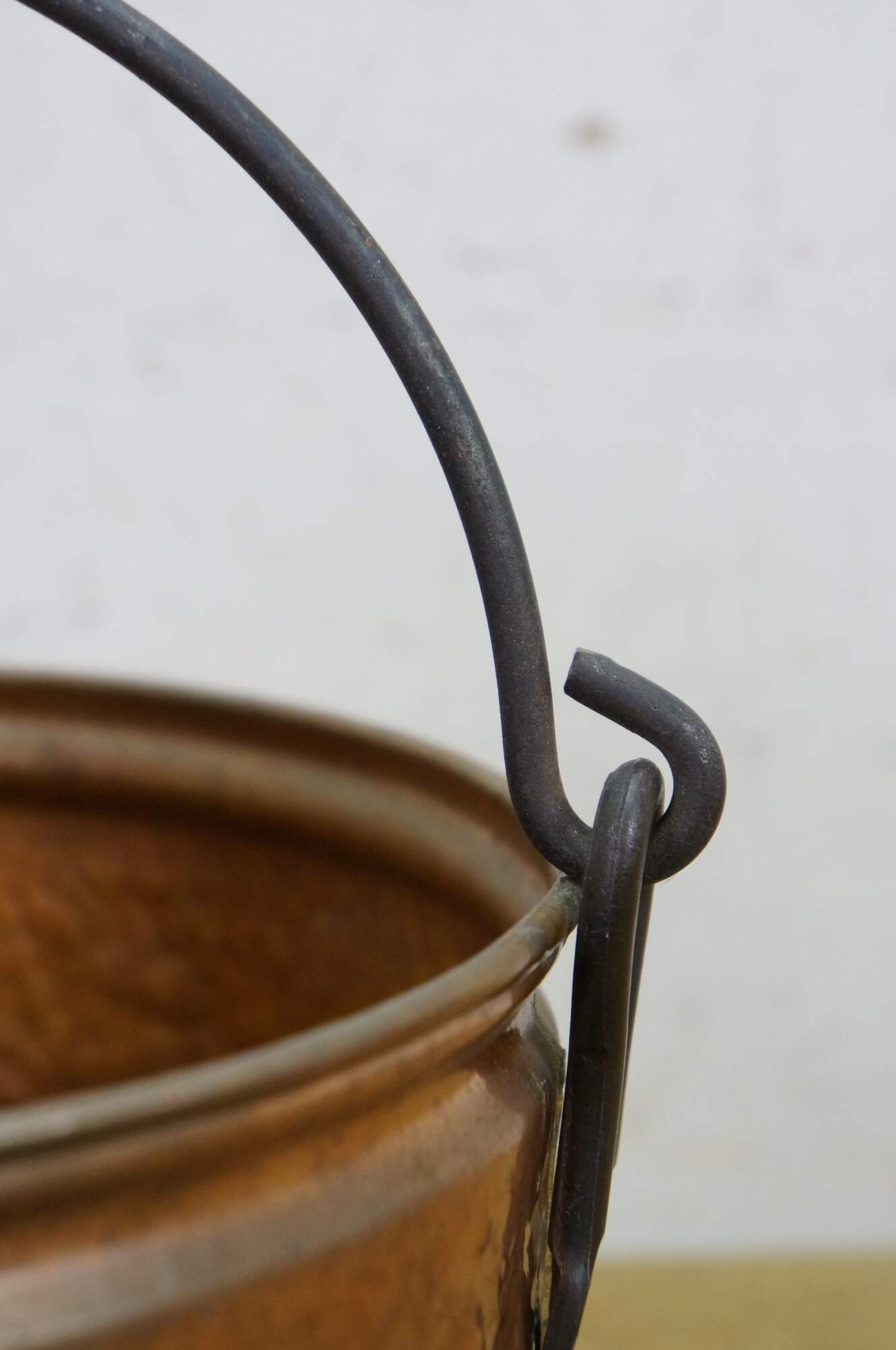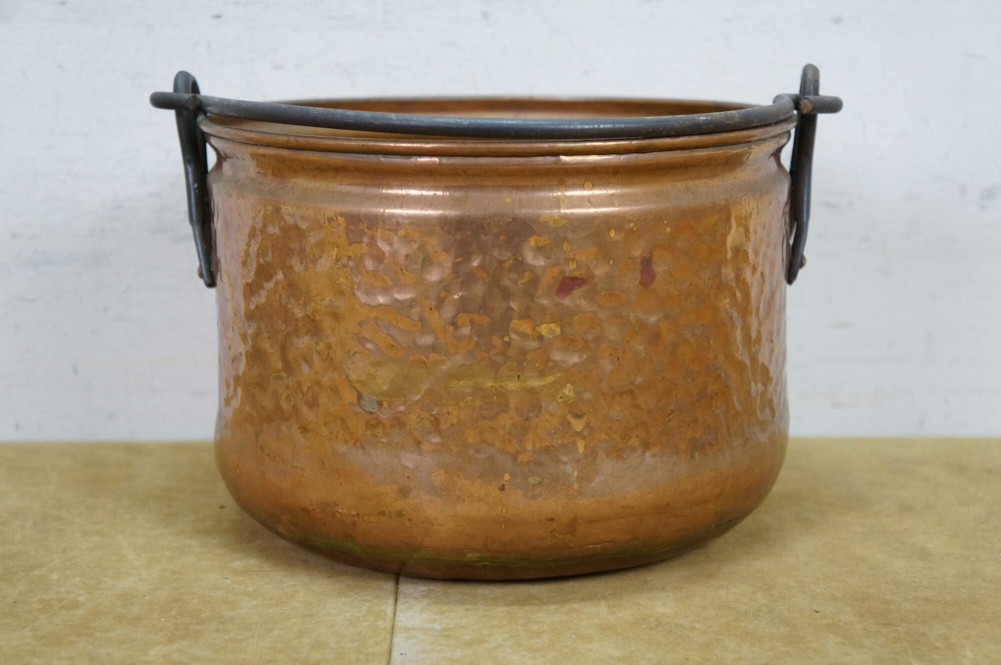 Late 19th to early 20th century dovetailed copper cooking pot with rotating rattail bail handle.