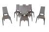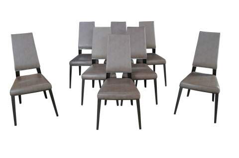 8 Elite Manufacturing Vivian Dining Chairs. Tall and elegant, with shapely tapered legs and just a hint of sparkle. Crisply tapered and tailored forms create a striking silhouette, while providing comfort and support. Vivians sparkle comes from a polished stripe of solid aluminum, which links the extra tall upholstered back with the sturdy steel frame. Upholstered in a brown faux ostrich leather. MSRP $10,000