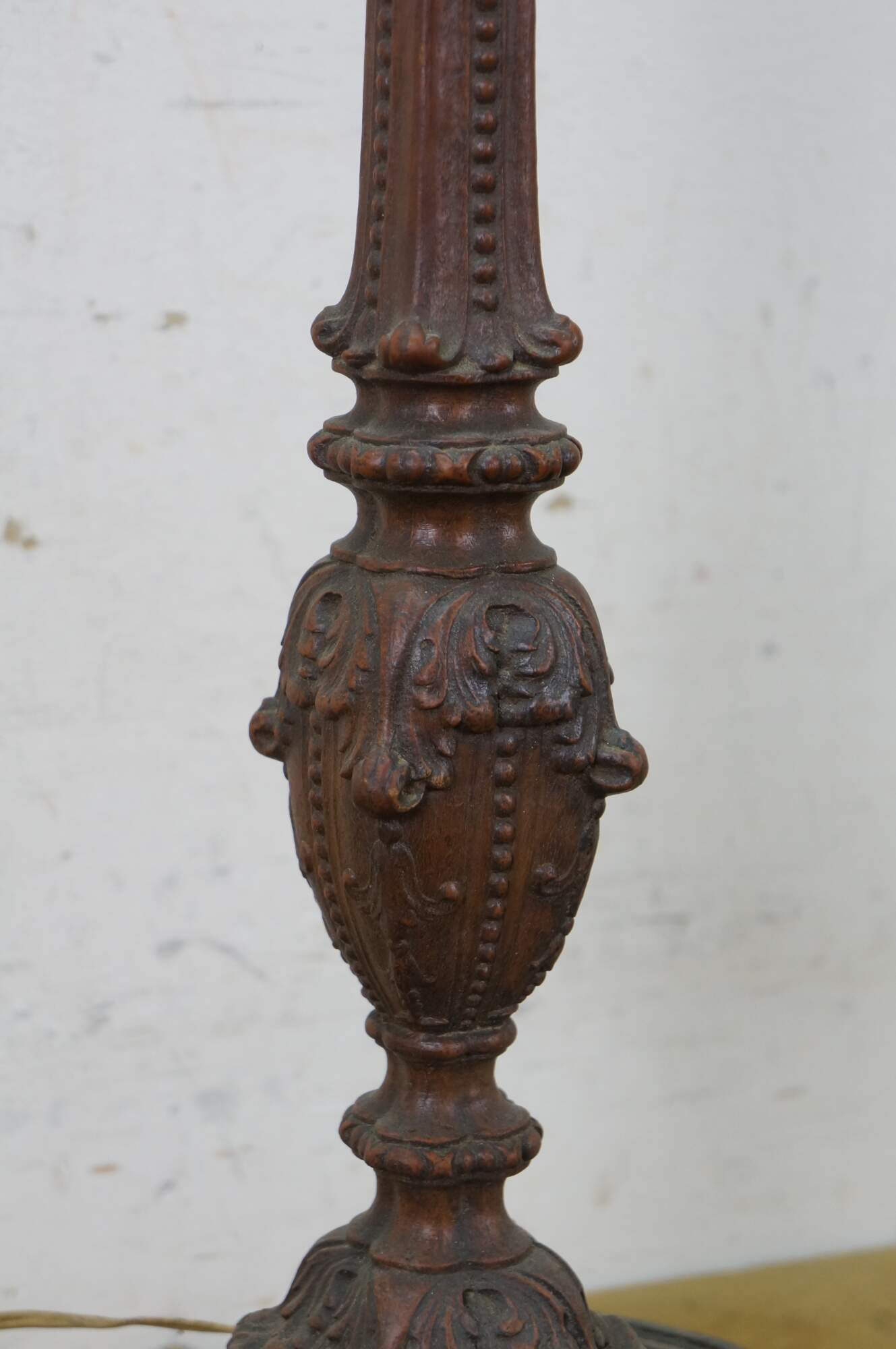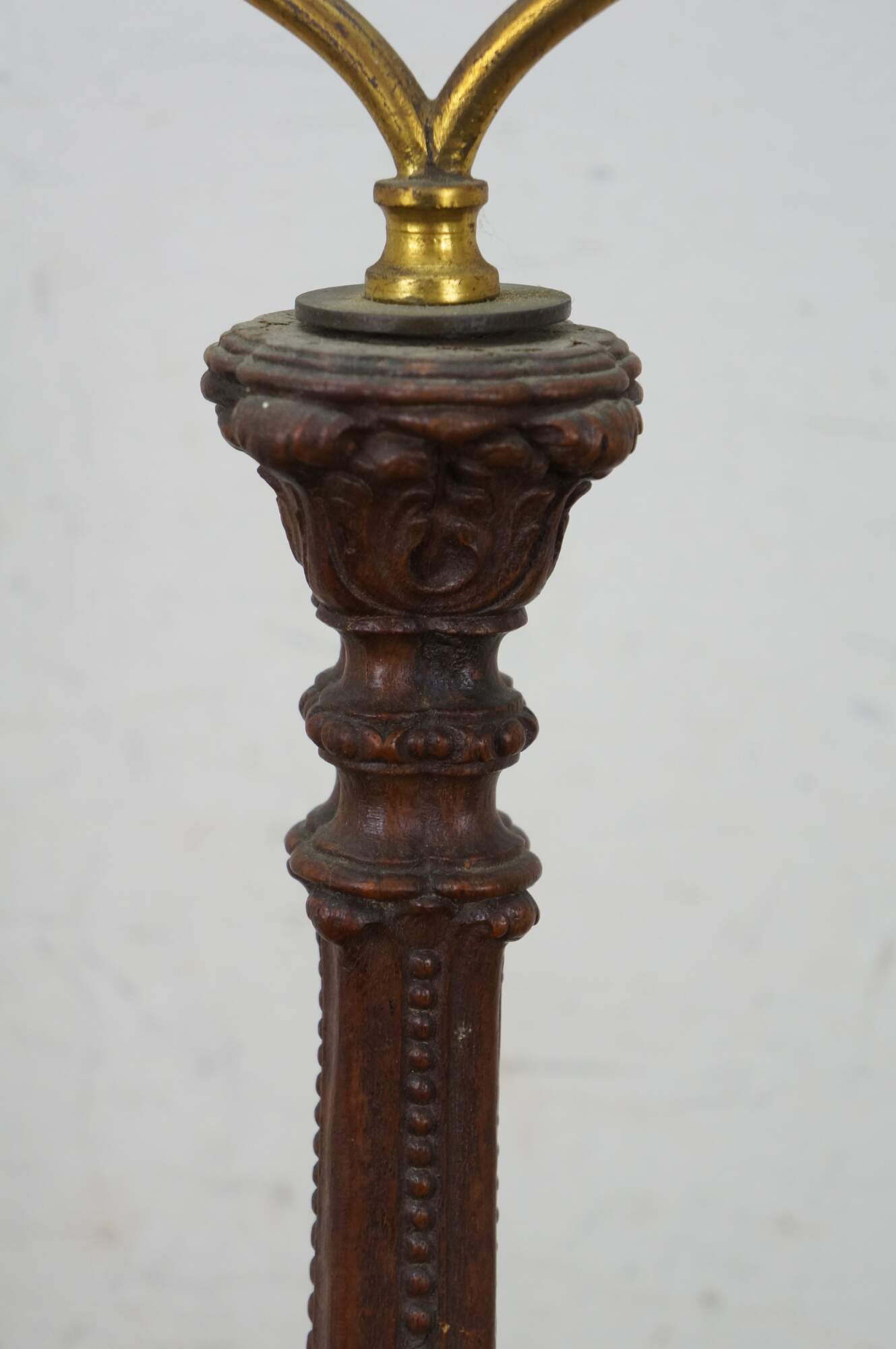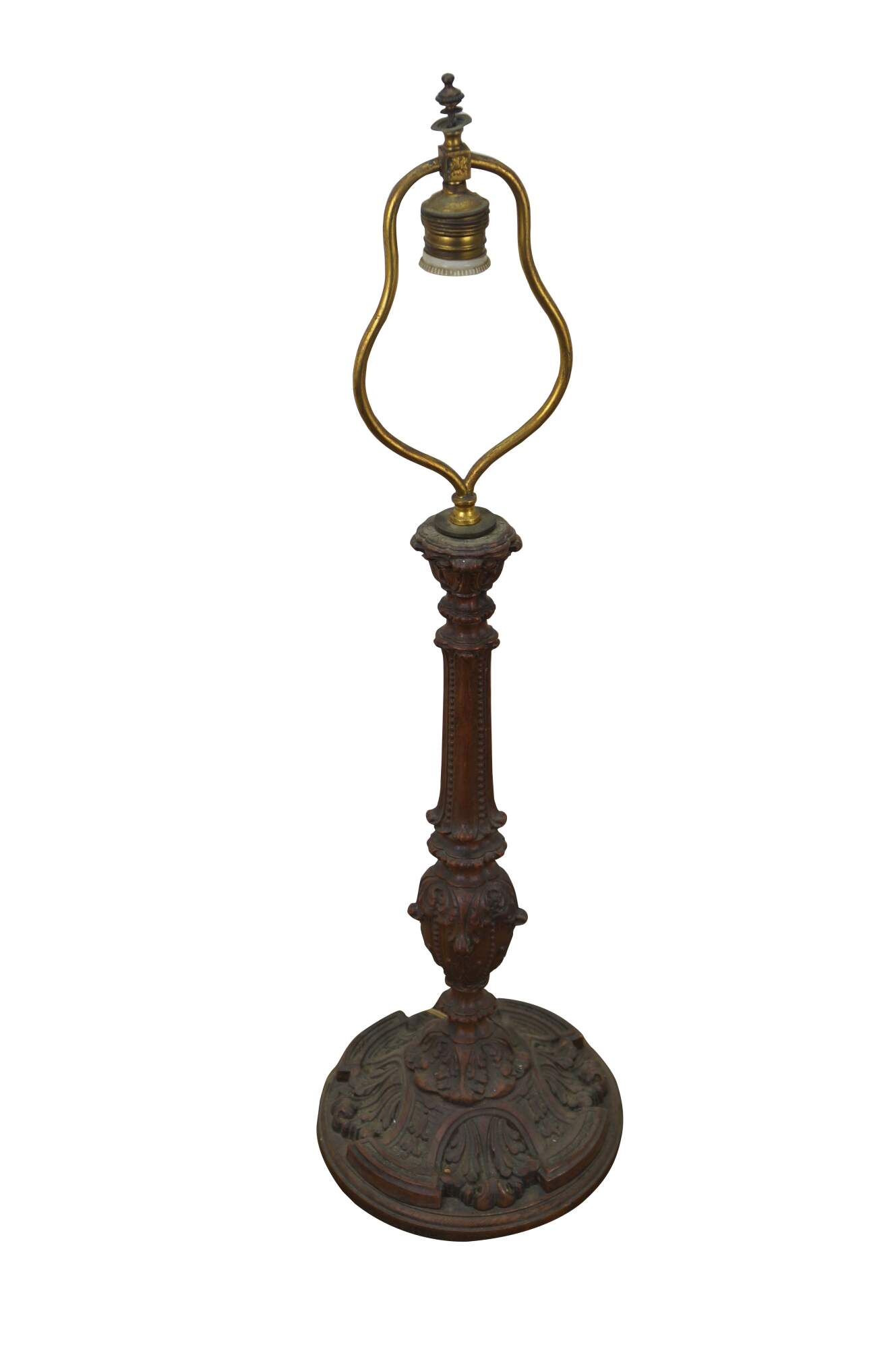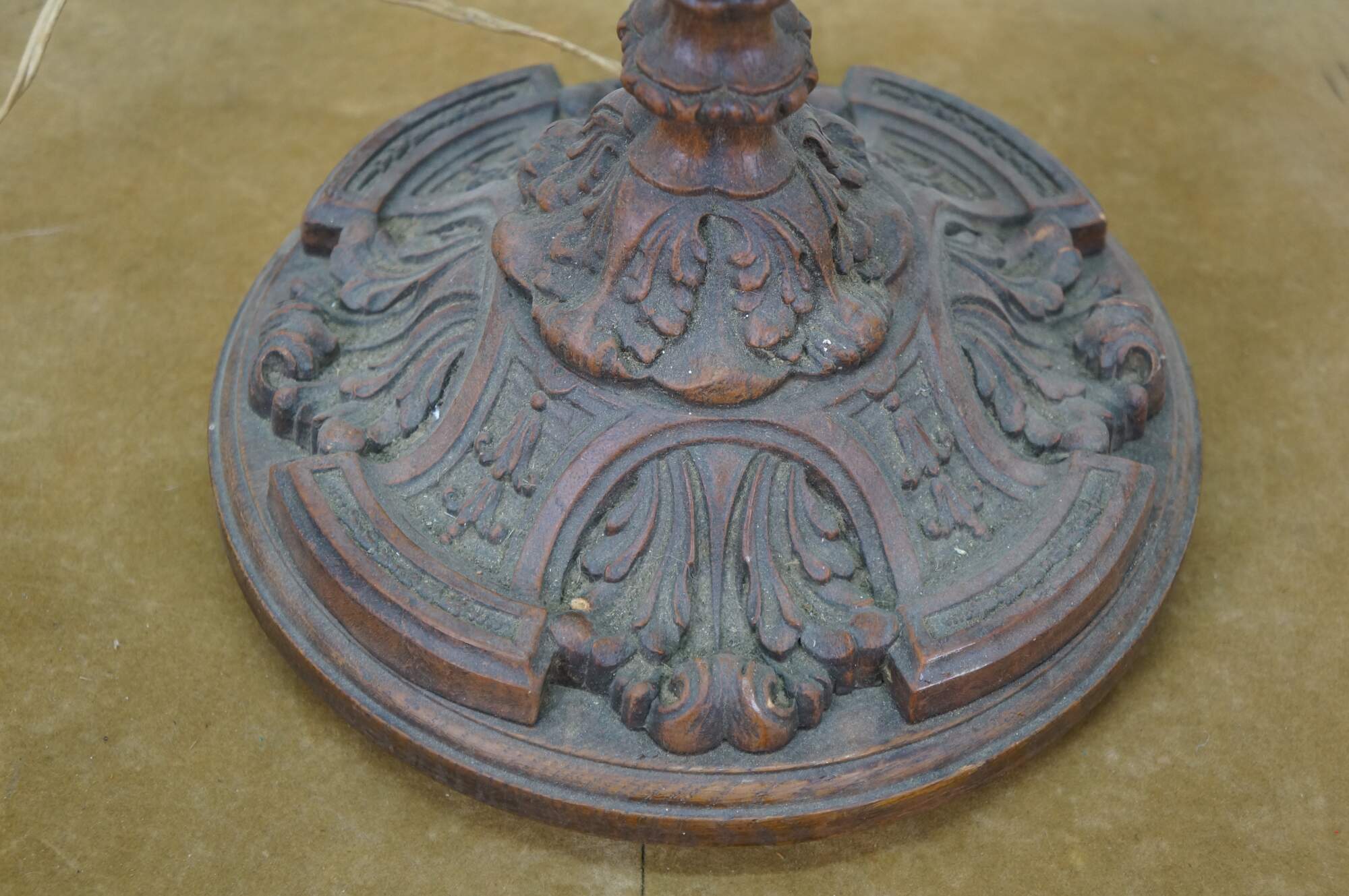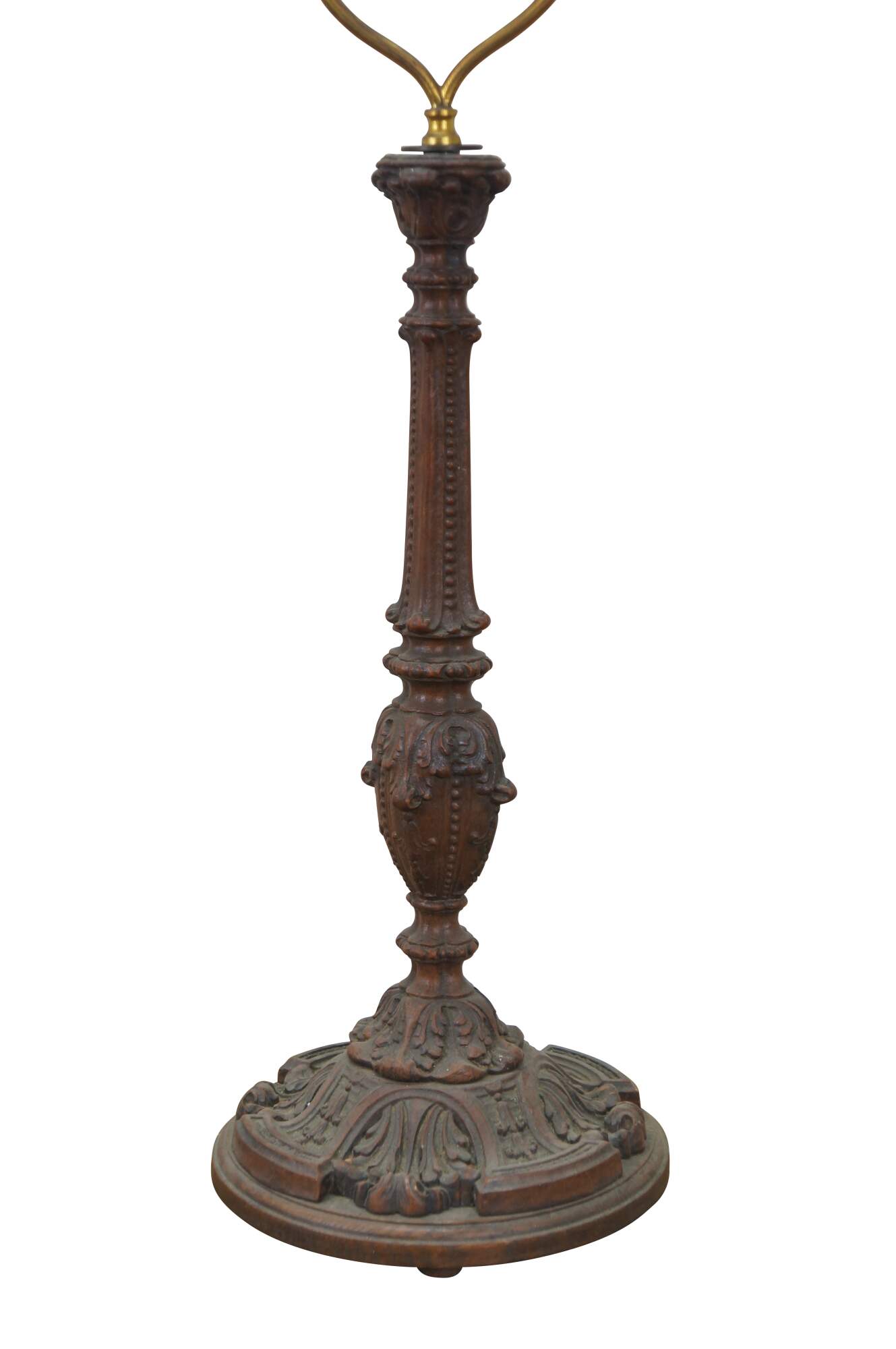 Vintage oak wood table lamp featuring ornately carved designs with a round base and baluster shaped candlestick column, accanted with scallops, beading and acanthus leaves. Attached gilt brass harp. Includes finial.