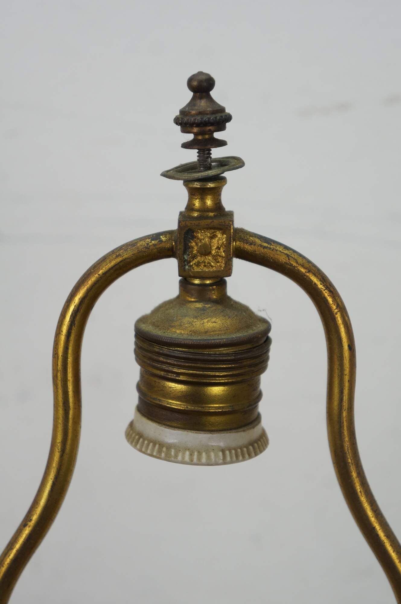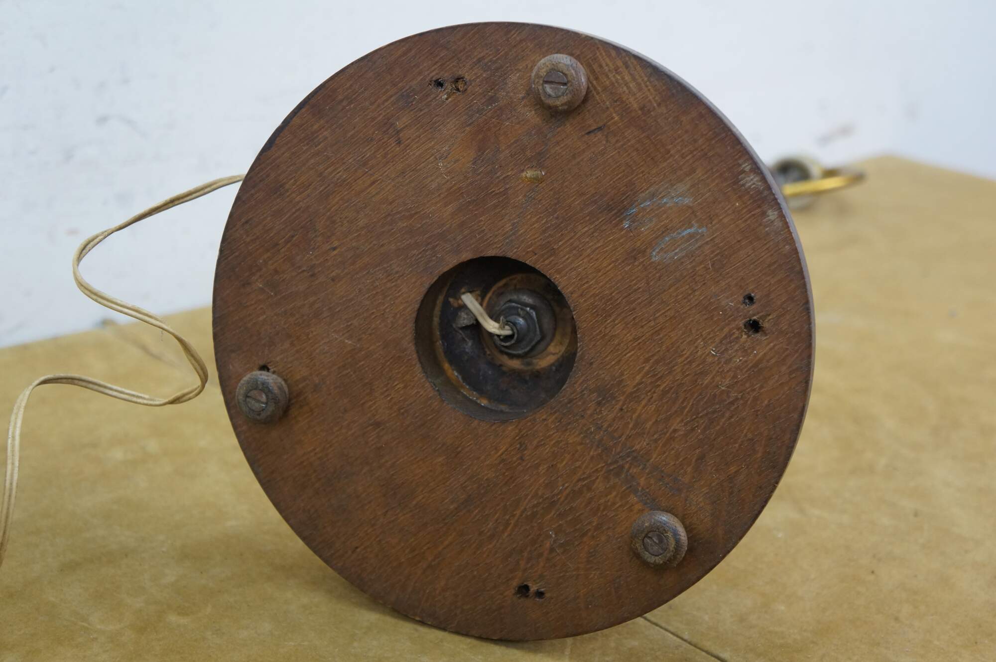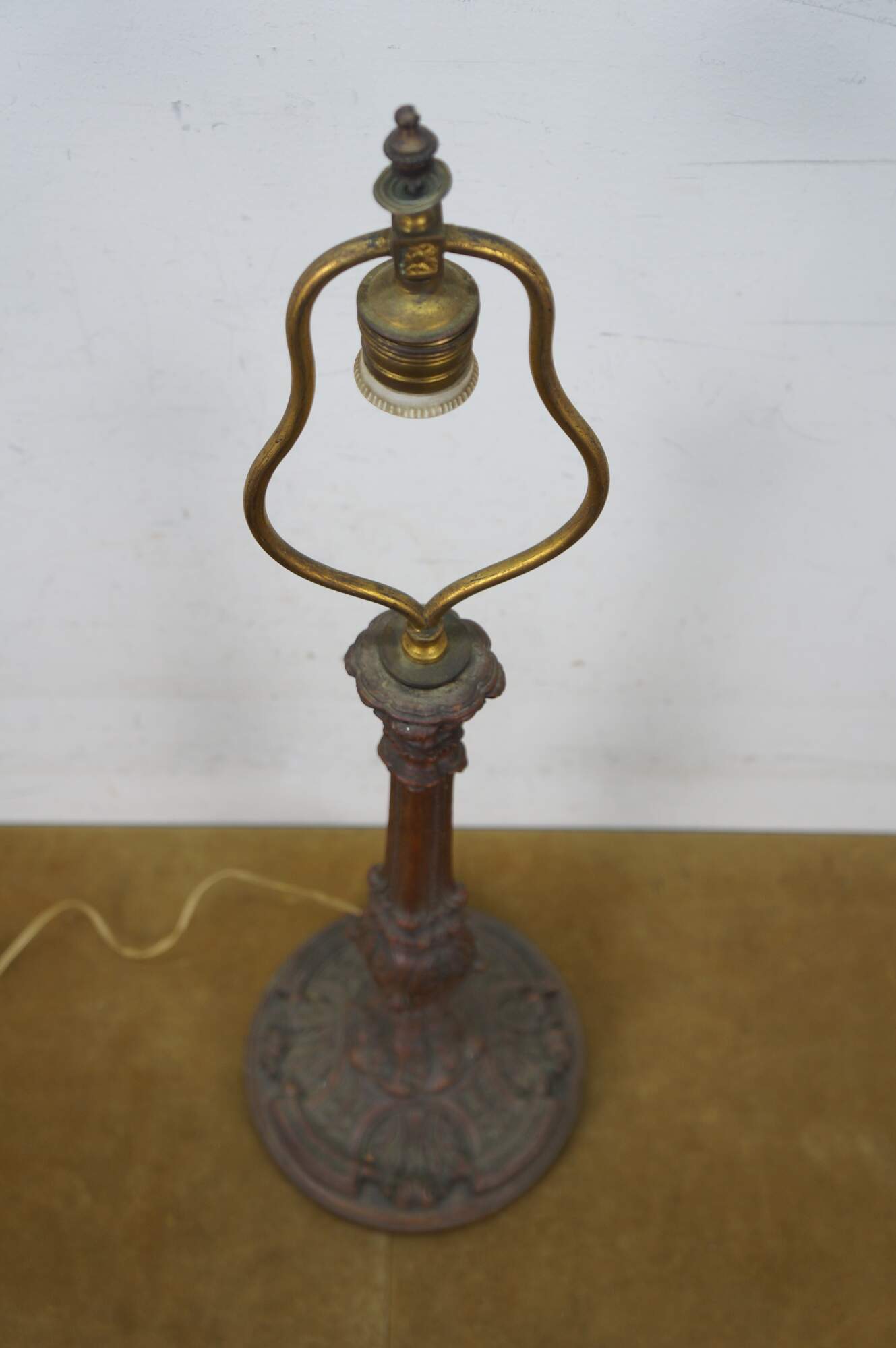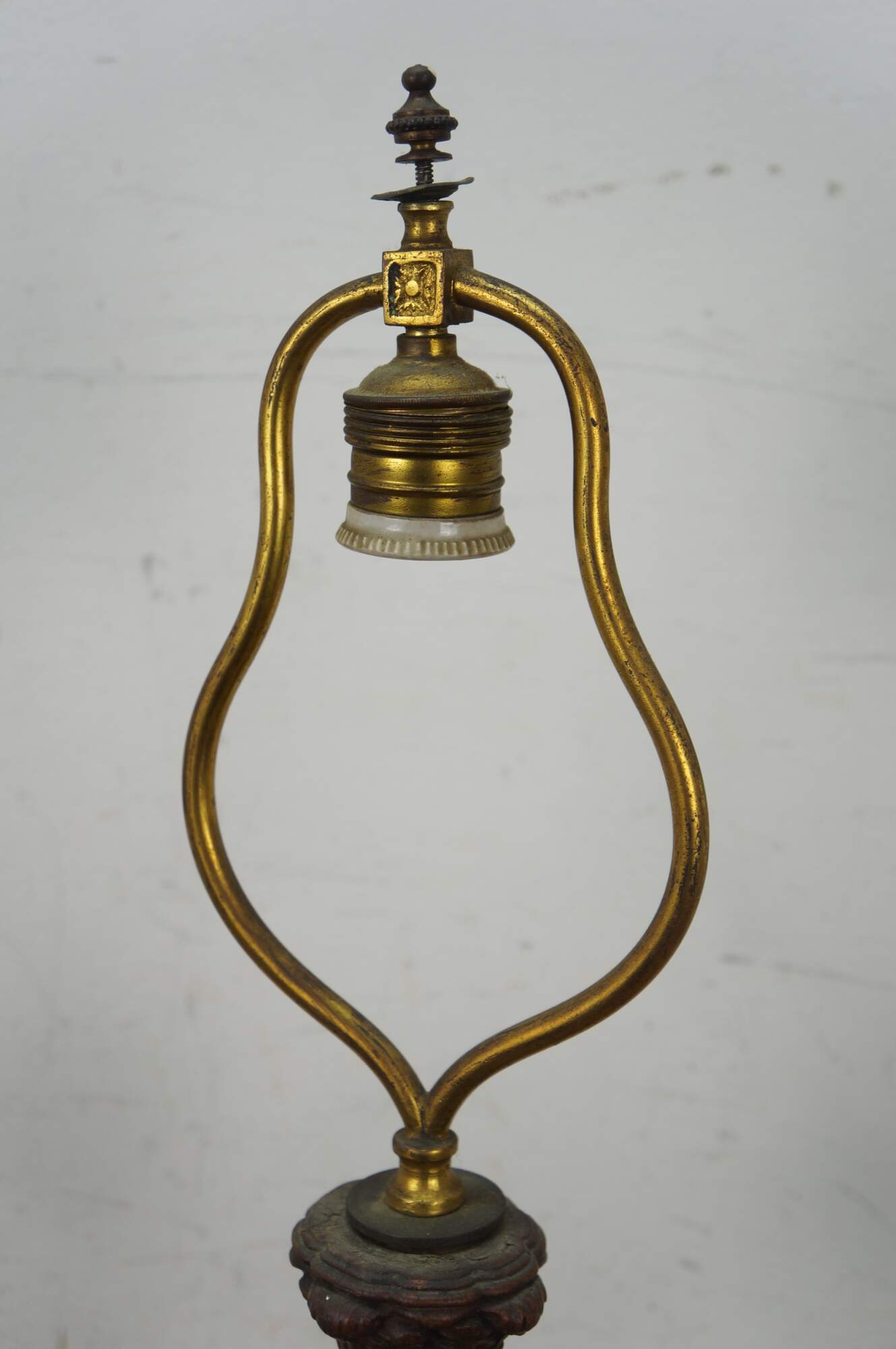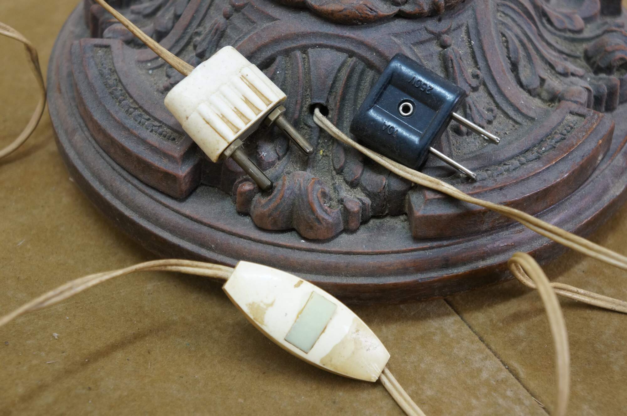 Vintage oak wood table lamp featuring ornately carved designs with a round base and baluster shaped candlestick column, accanted with scallops, beading and acanthus leaves. Attached gilt brass harp. Includes finial.