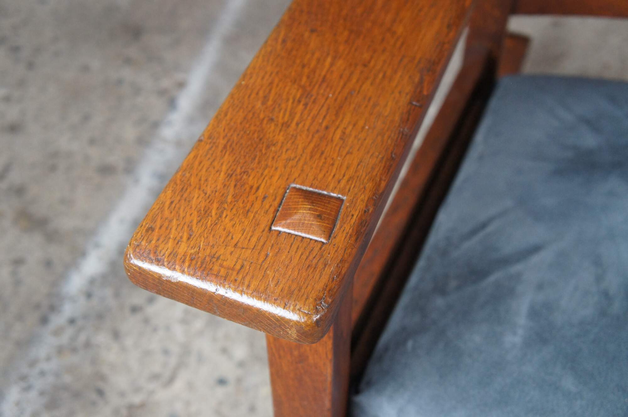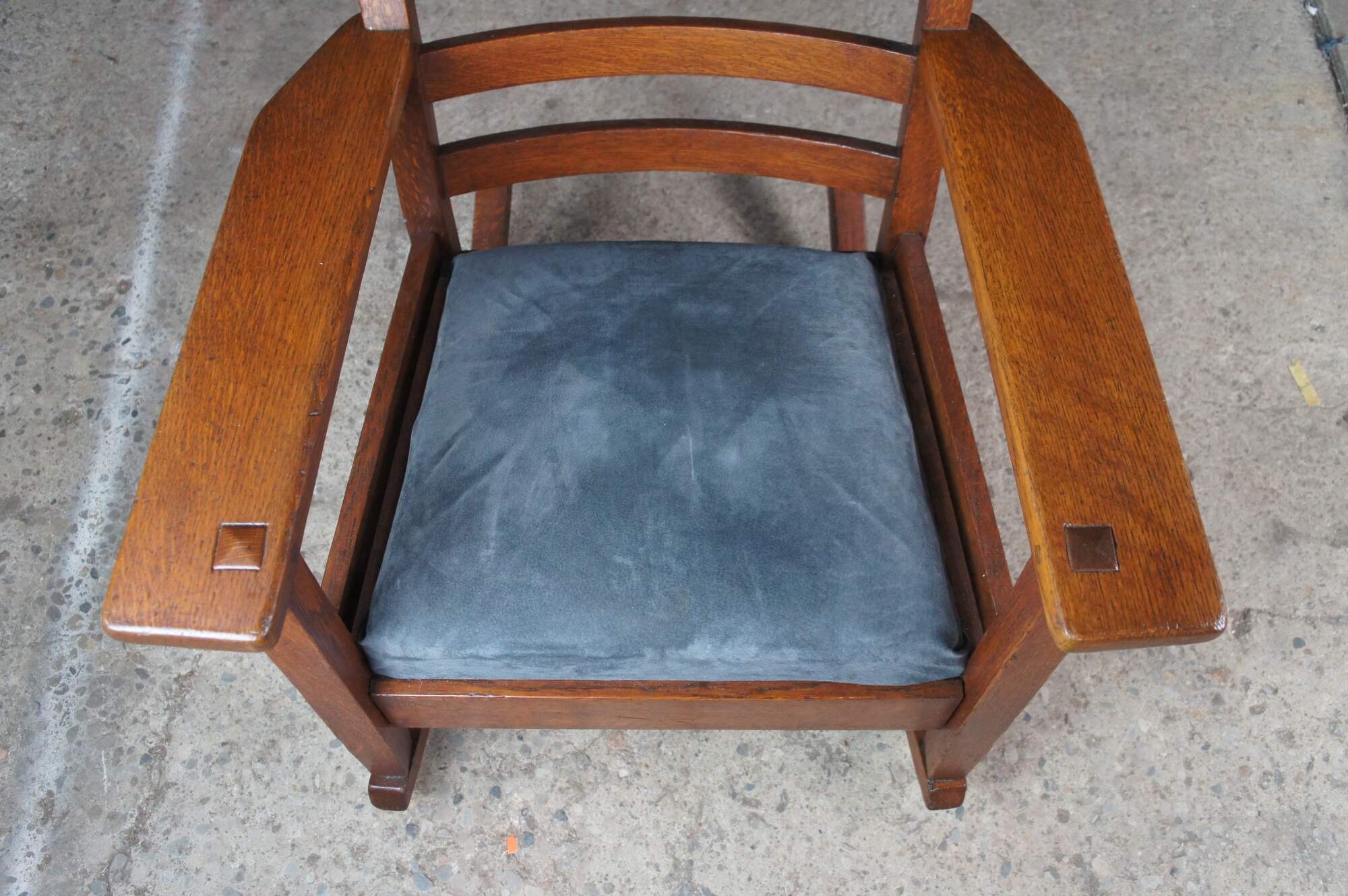 This beautiful example is made from quartersawn oak with a ladderback, large arms with through tenons and a suede seat.