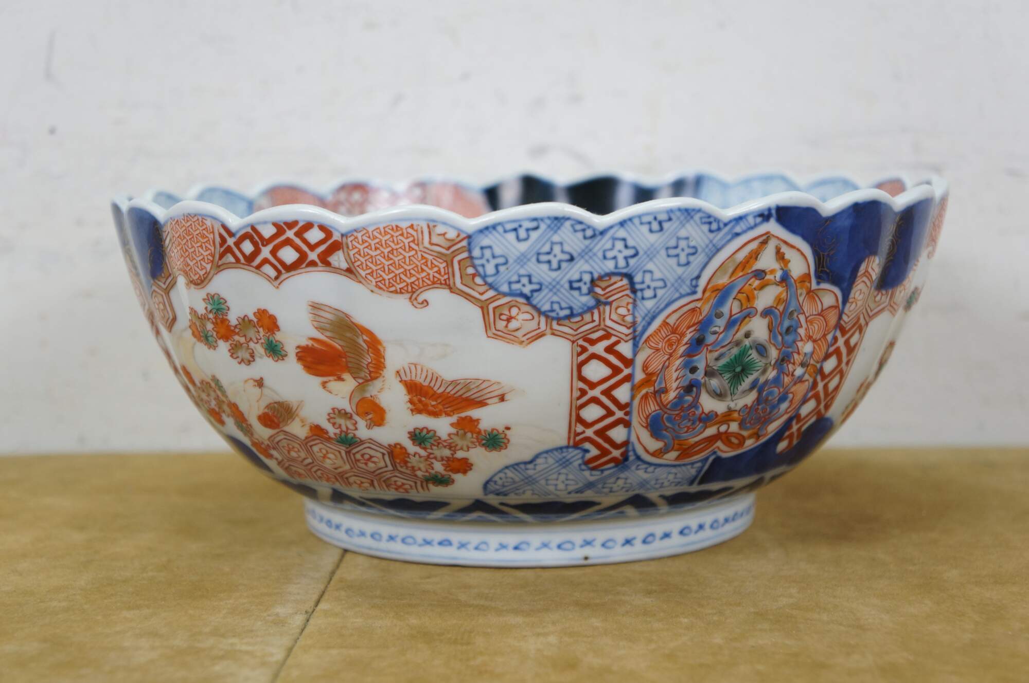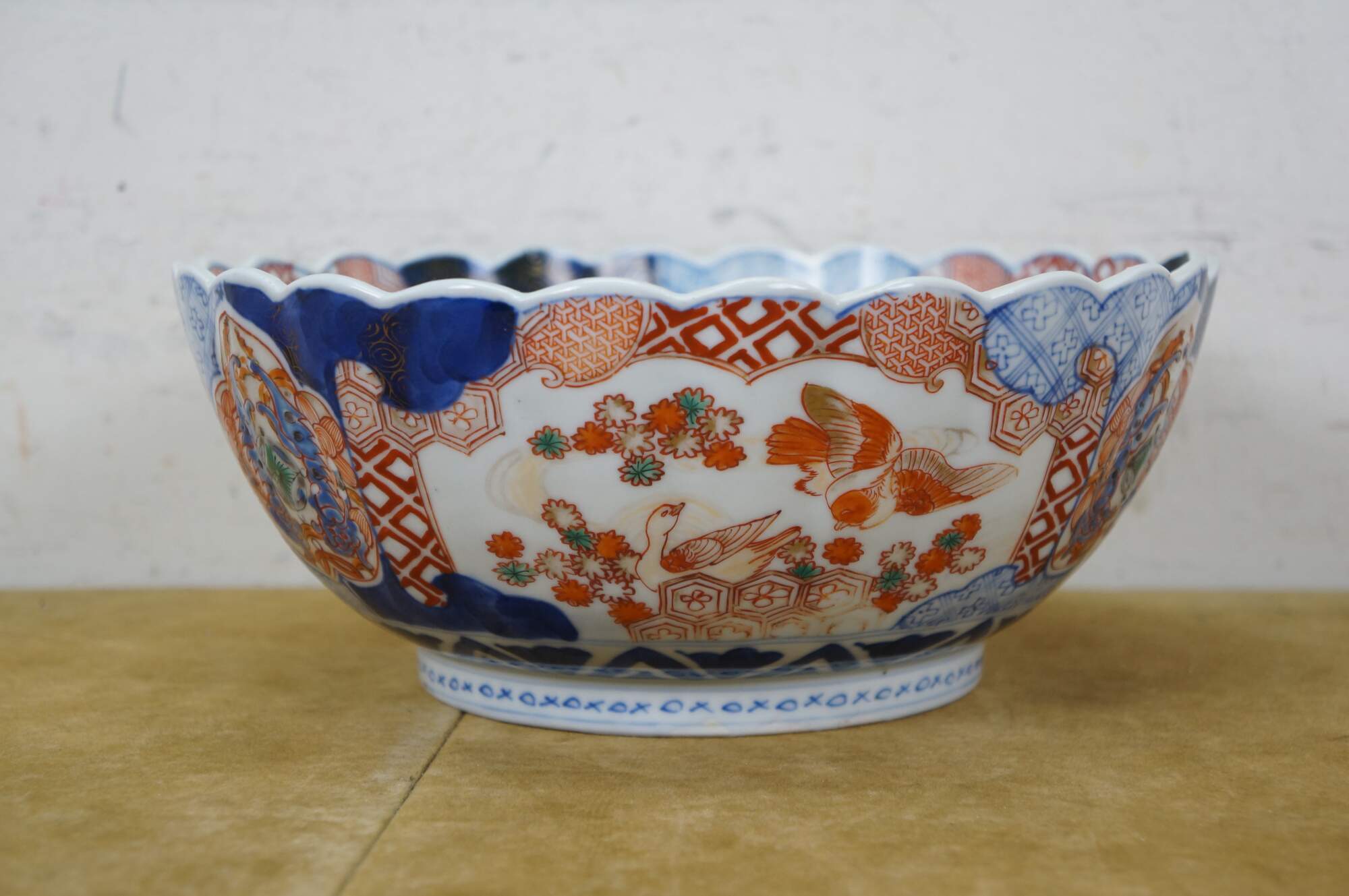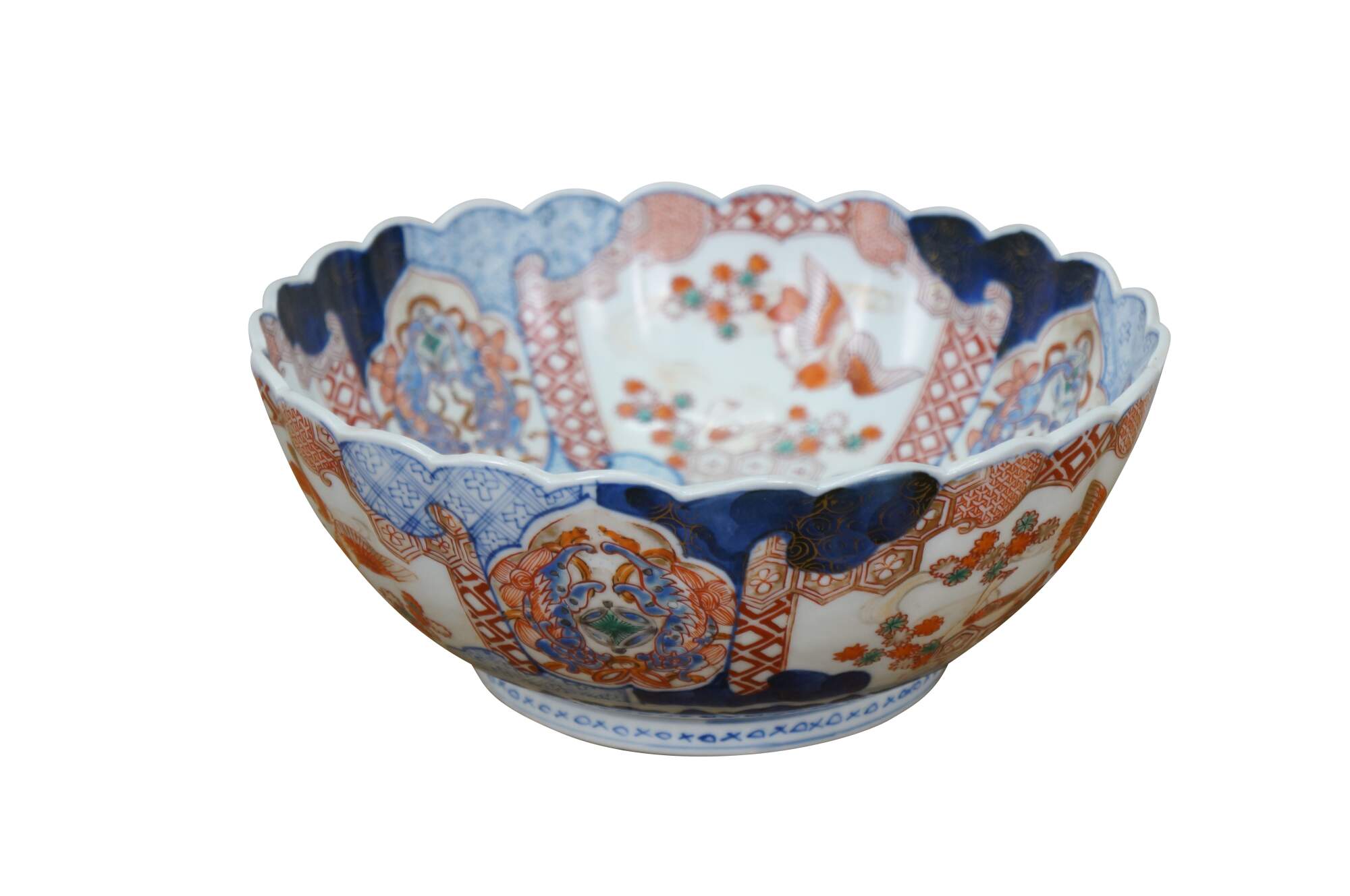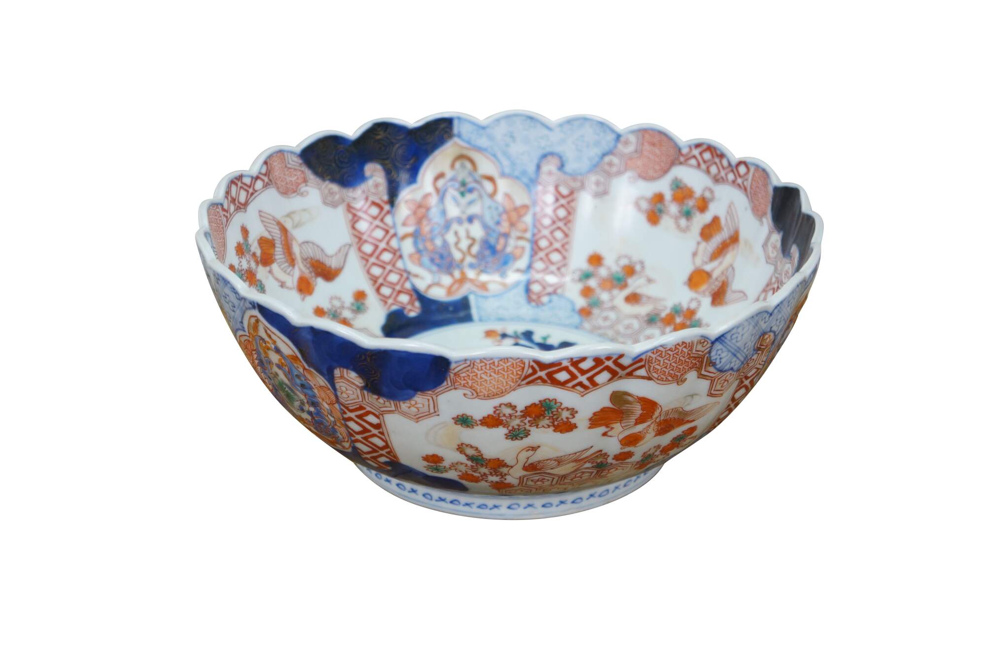 Antique Japanese imari porcelain fruit / serving bowl - round form with scalloped edge, decorated in blue, orange and green with Mandarin ducks nesting in a garden, pairs of blue guardian lions, and a bouquet of flowers in a vase at the center.
