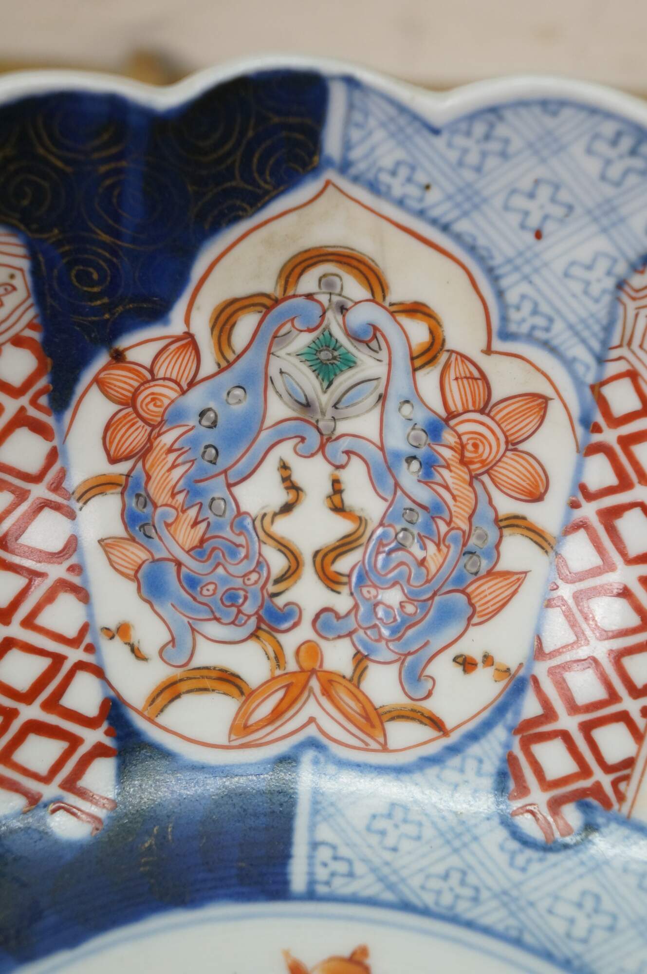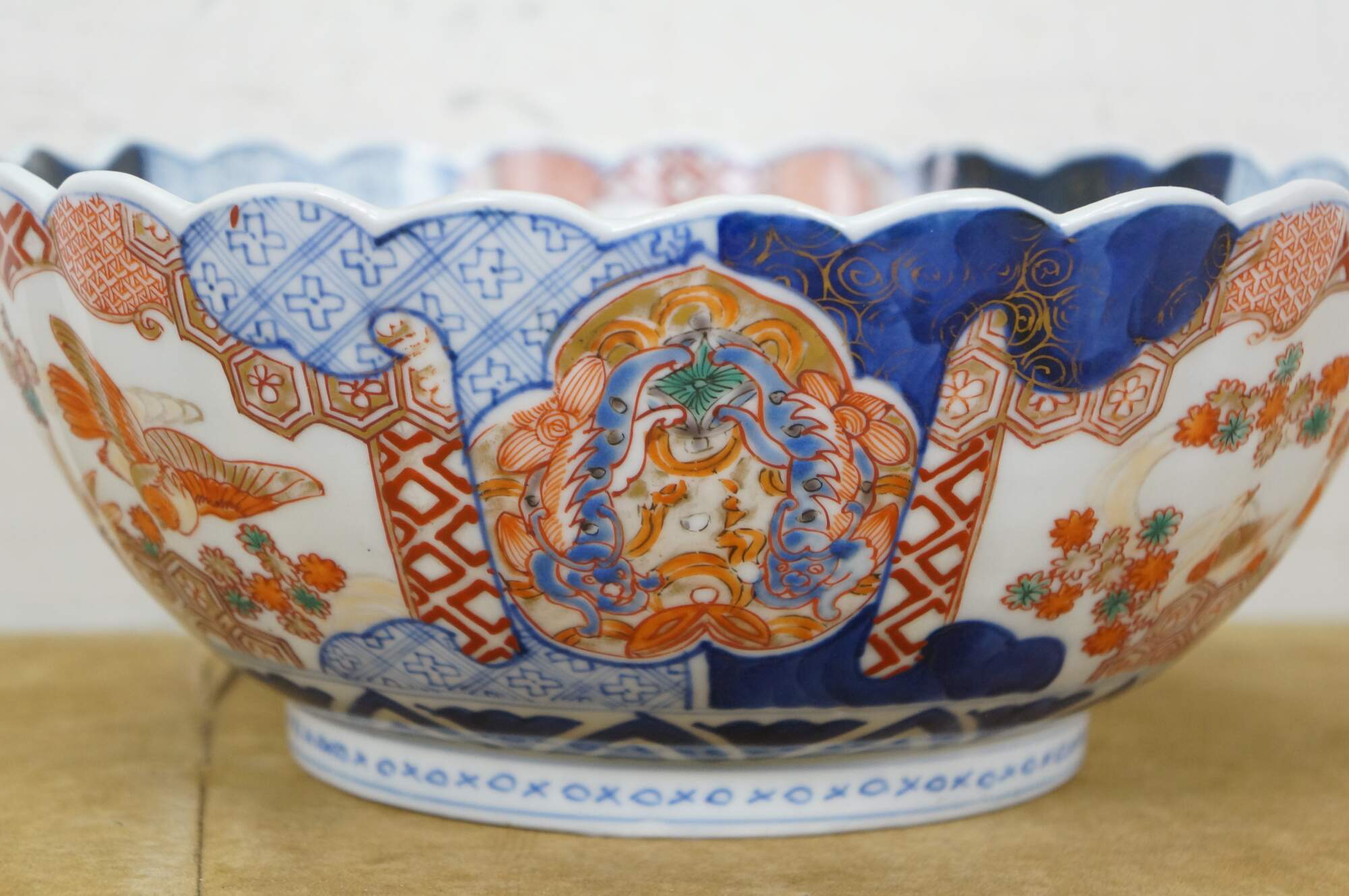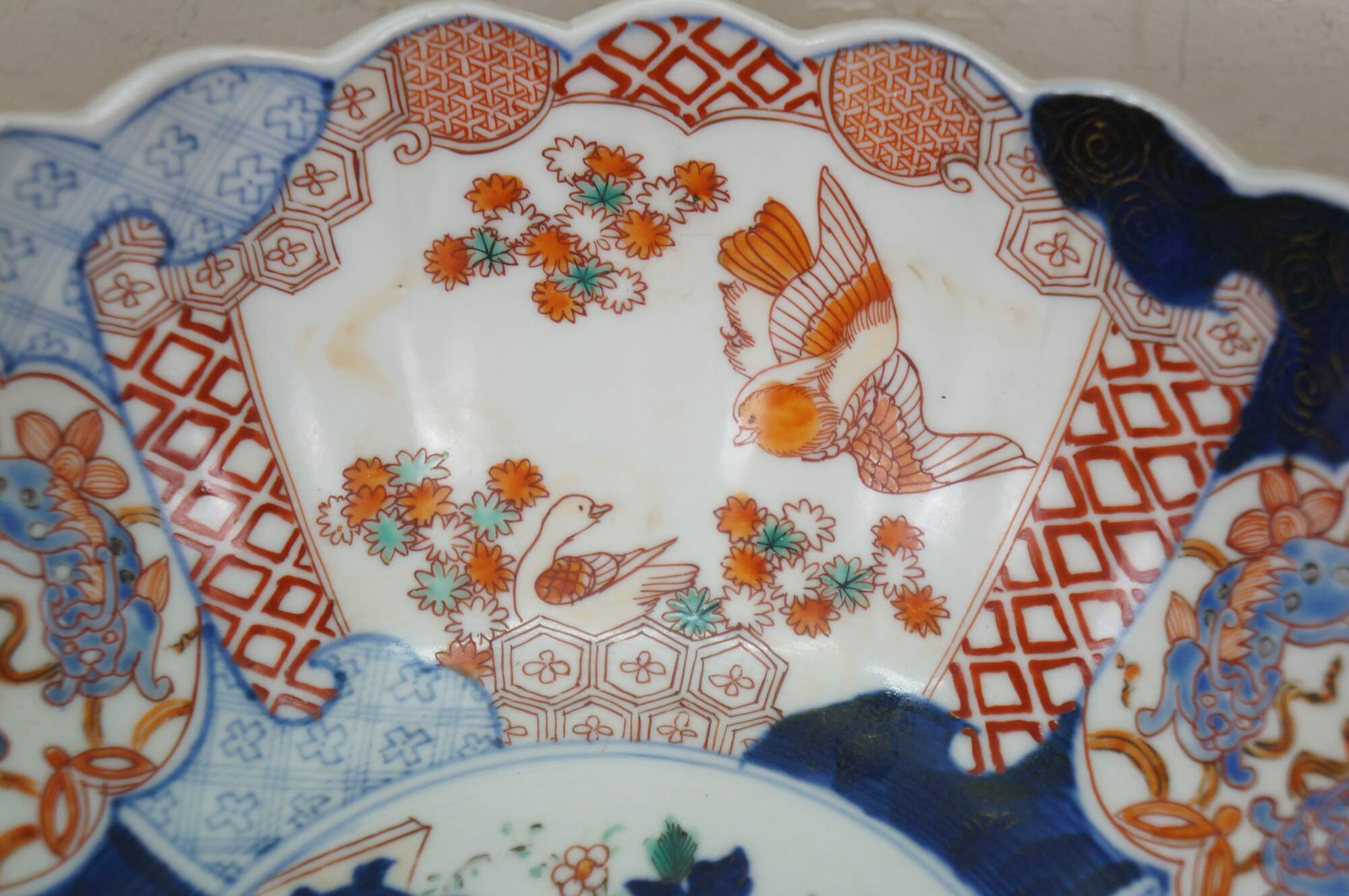 Antique Japanese imari porcelain fruit / serving bowl - round form with scalloped edge, decorated in blue, orange and green with Mandarin ducks nesting in a garden, pairs of blue guardian lions, and a bouquet of flowers in a vase at the center.