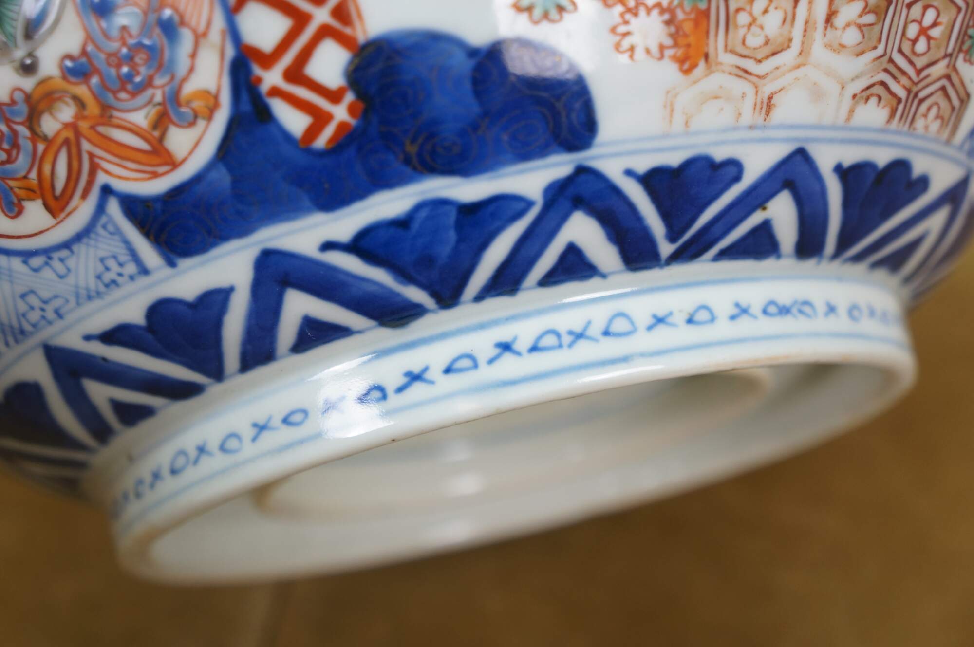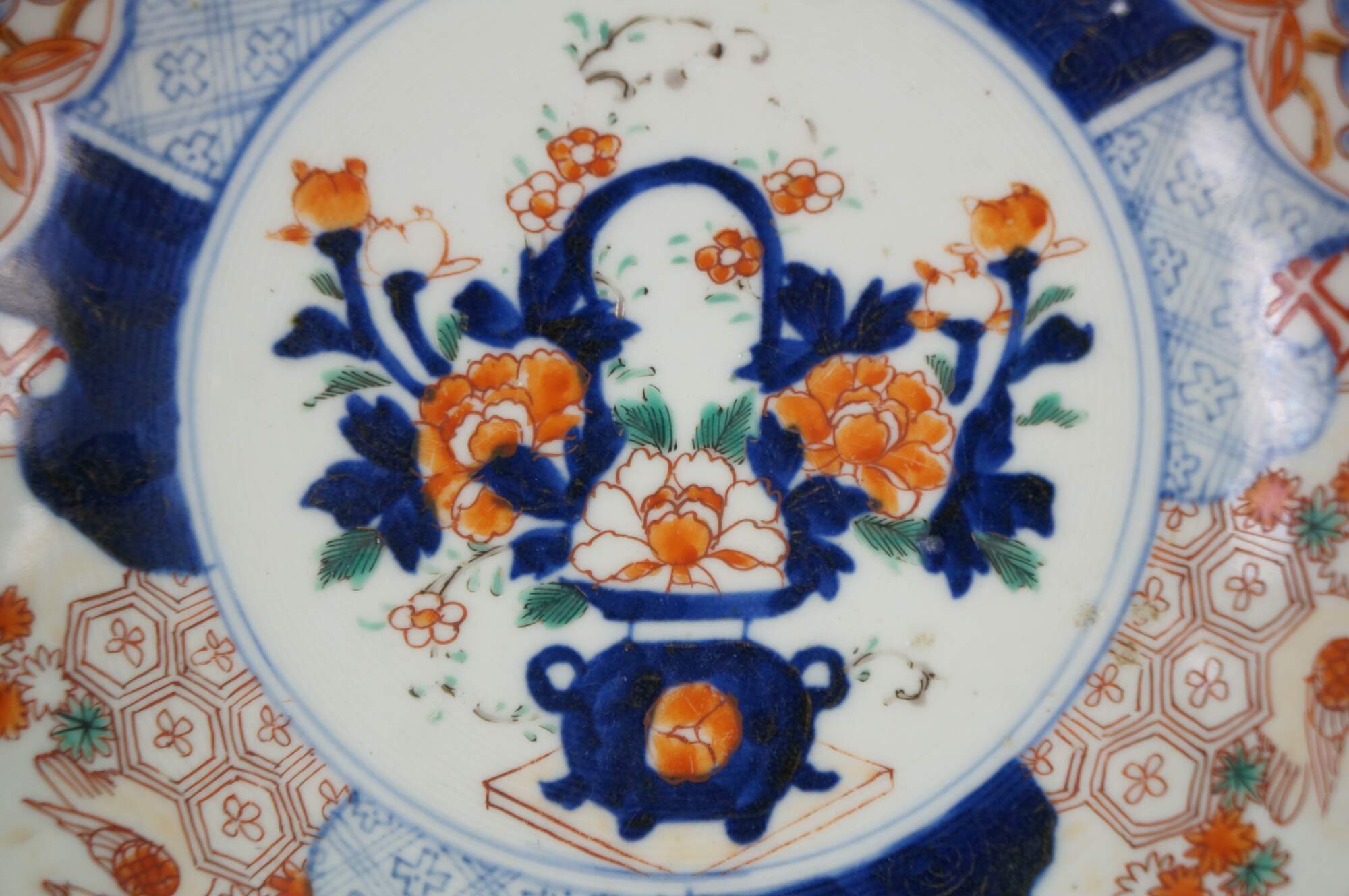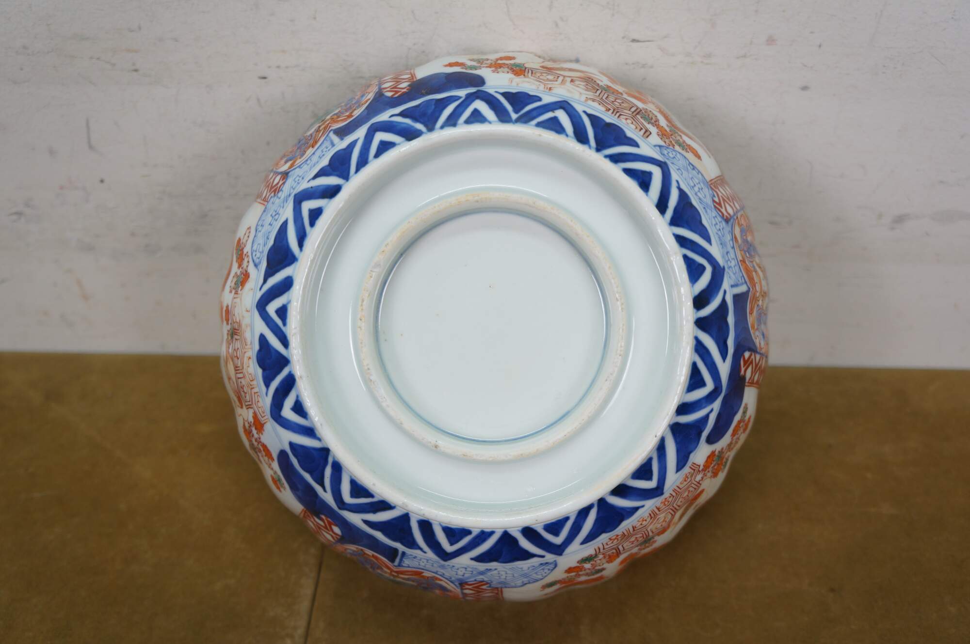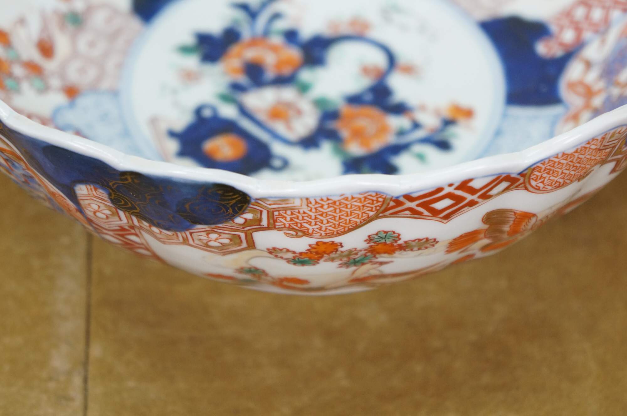 Antique Japanese imari porcelain fruit / serving bowl - round form with scalloped edge, decorated in blue, orange and green with Mandarin ducks nesting in a garden, pairs of blue guardian lions, and a bouquet of flowers in a vase at the center.