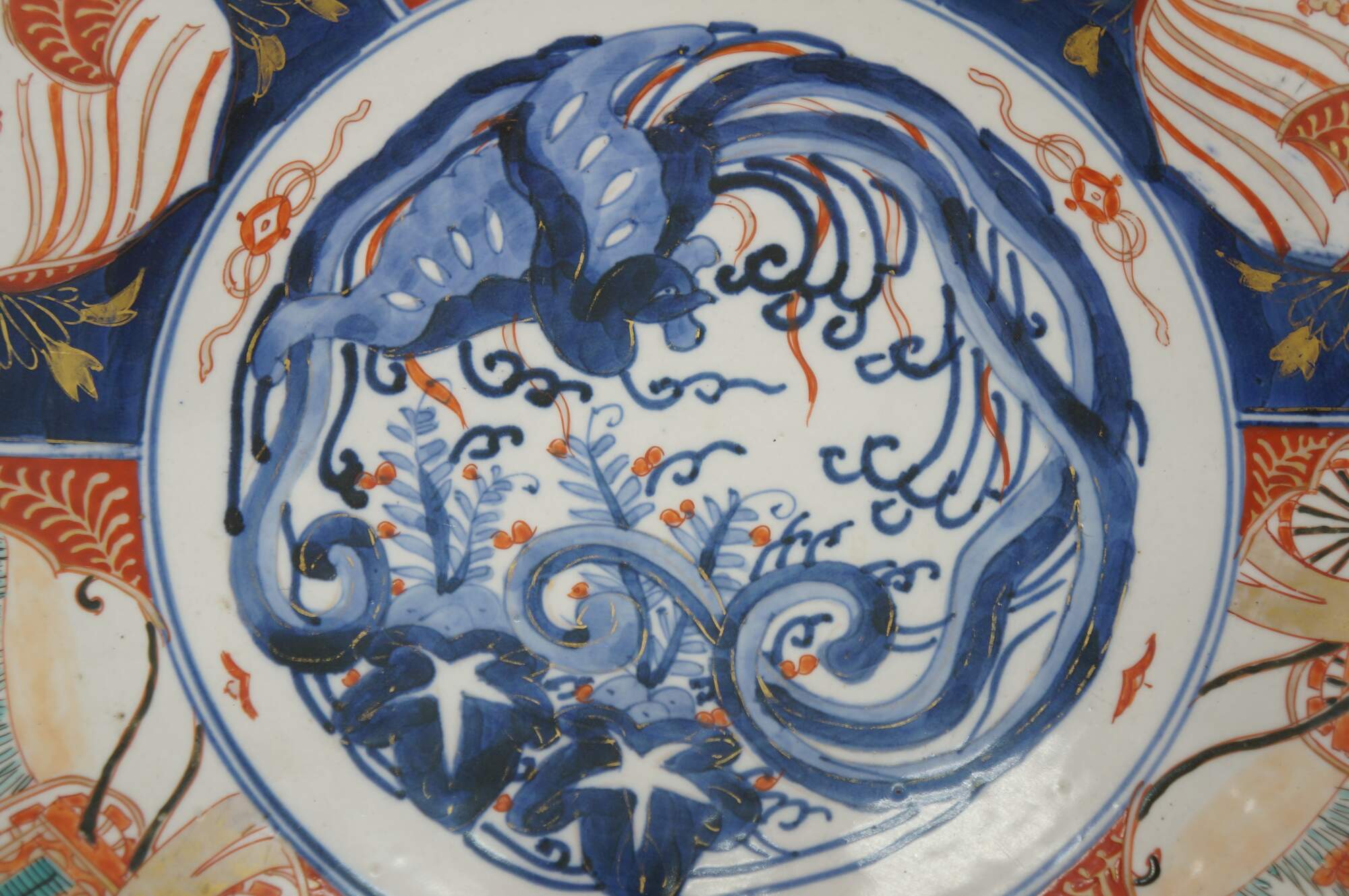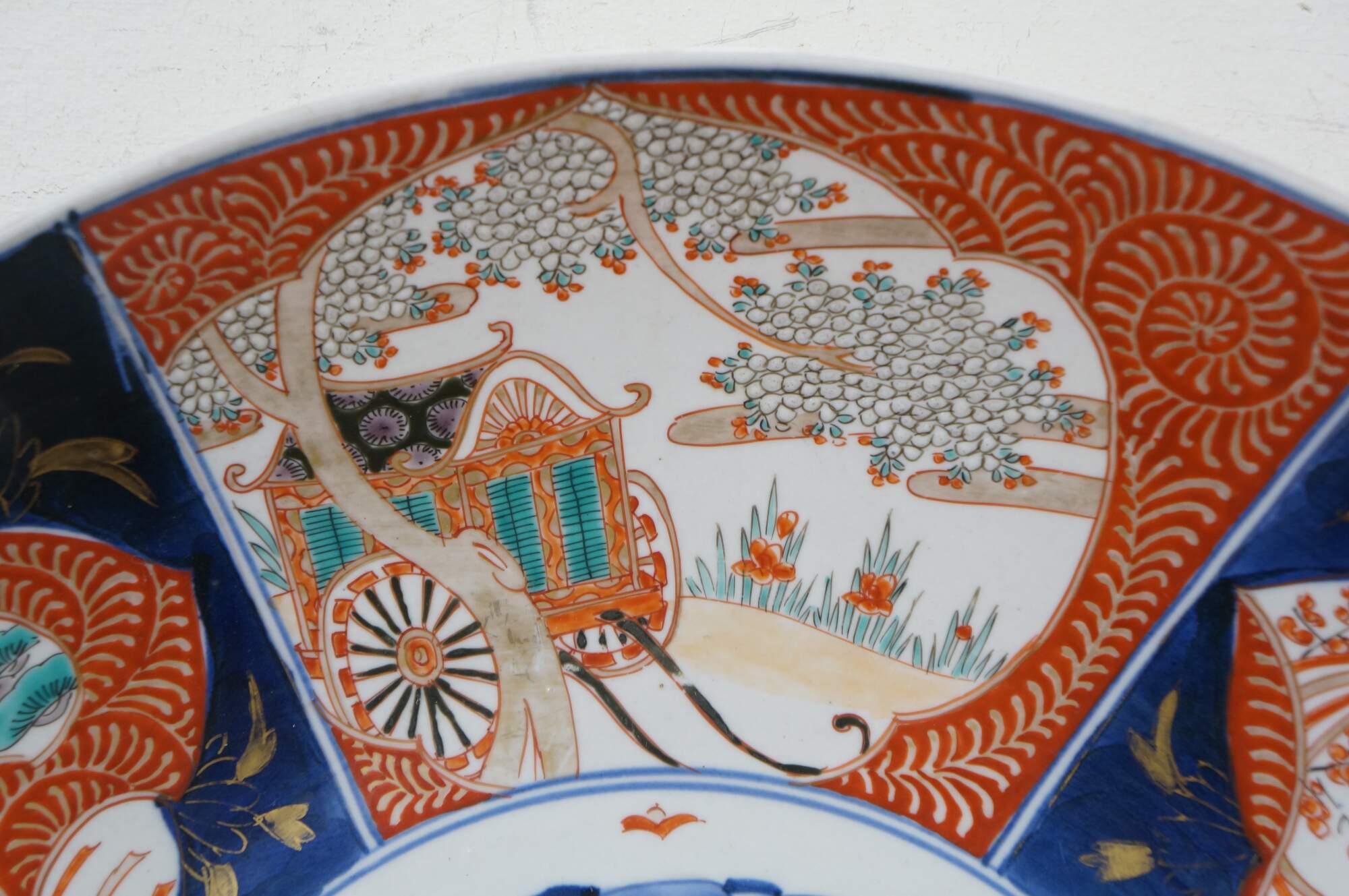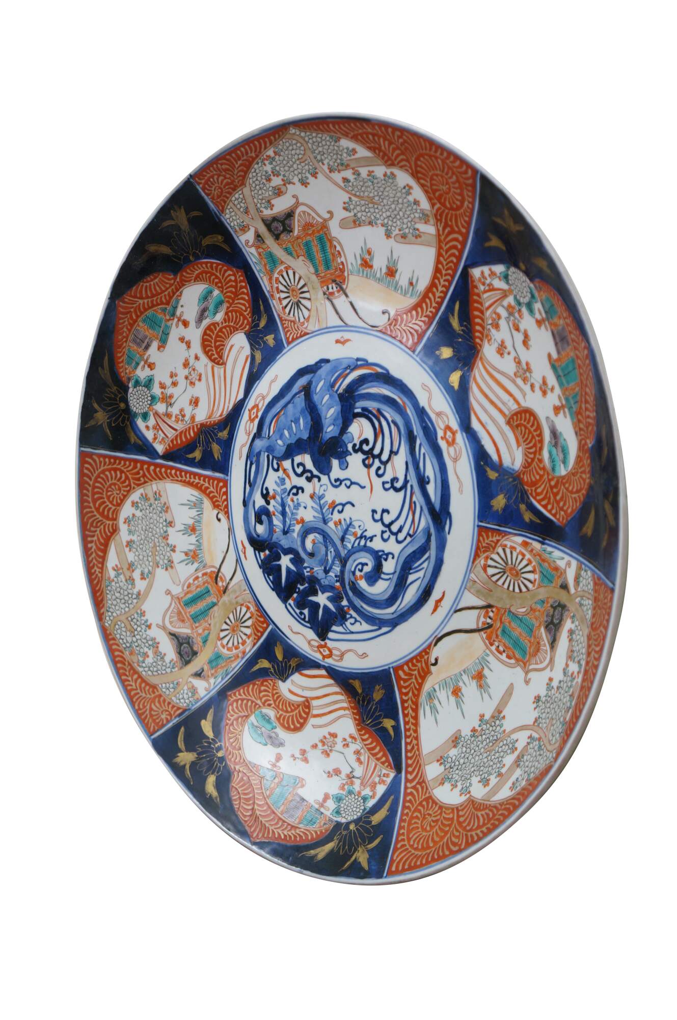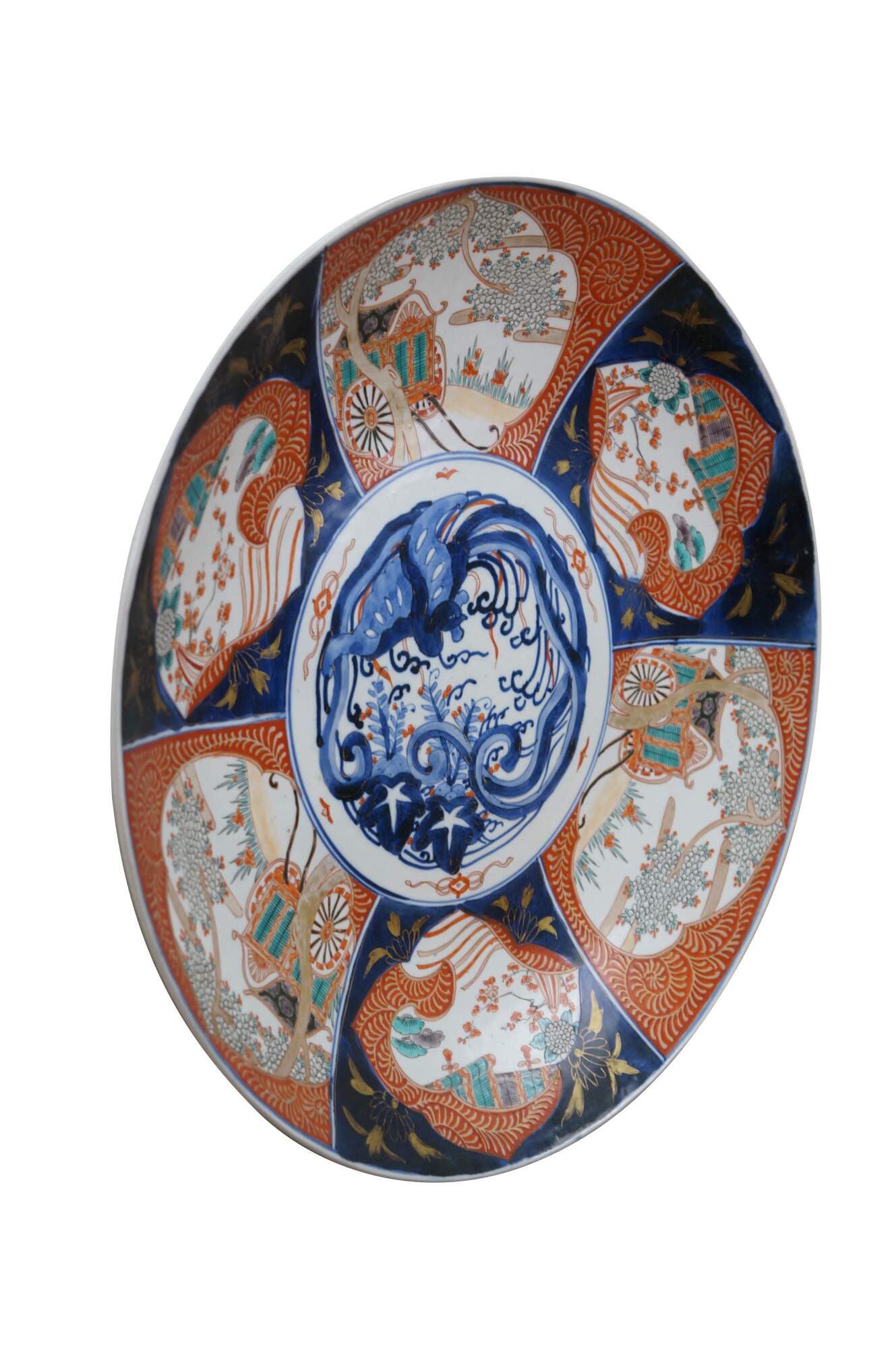 Antique Japanese imari porcelain platter / charger, decorated in blue, orange, green and gold with alternating panels of a hand drawn carriage / rickshaw and flower trimmed window screens, around a central motif of a flying phoenix / dragon.