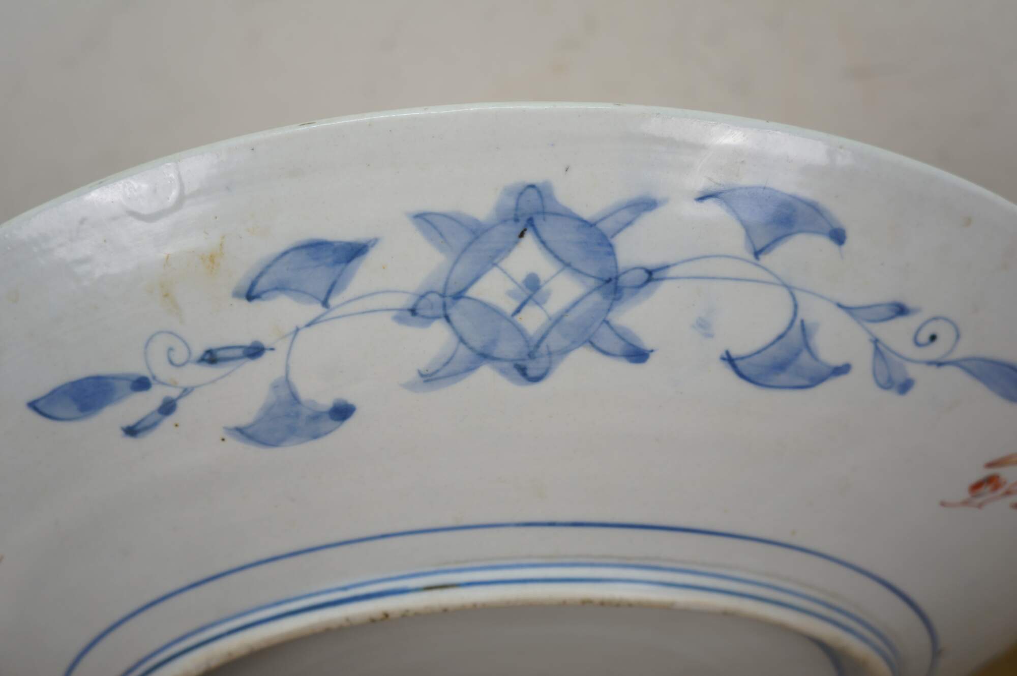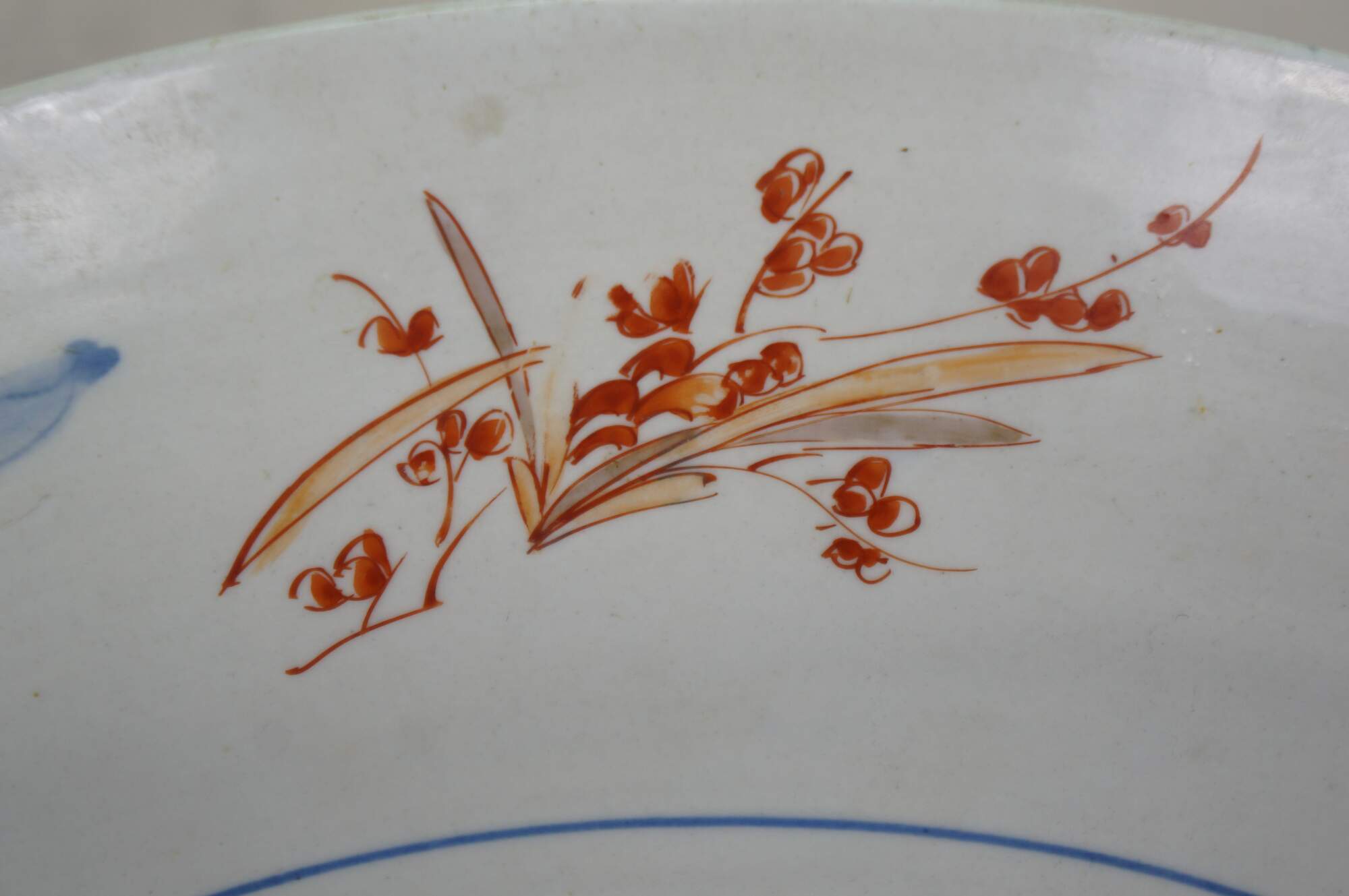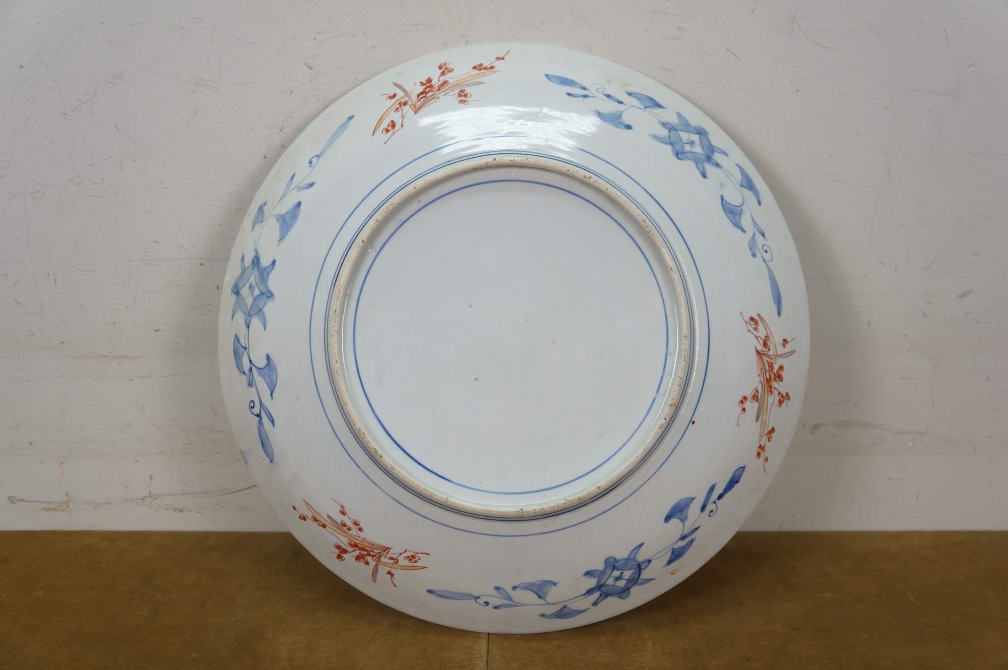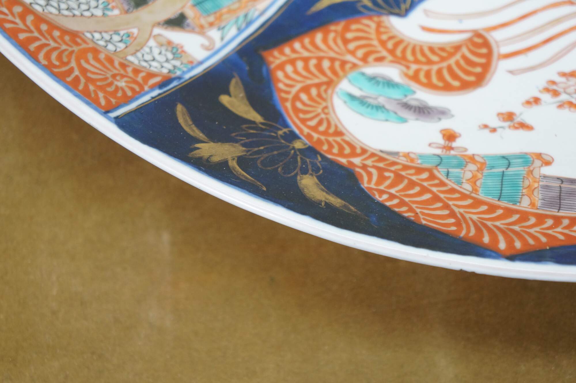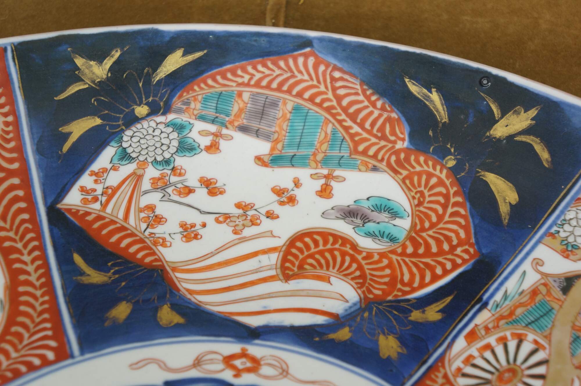 Antique Japanese imari porcelain platter / charger, decorated in blue, orange, green and gold with alternating panels of a hand drawn carriage / rickshaw and flower trimmed window screens, around a central motif of a flying phoenix / dragon.
