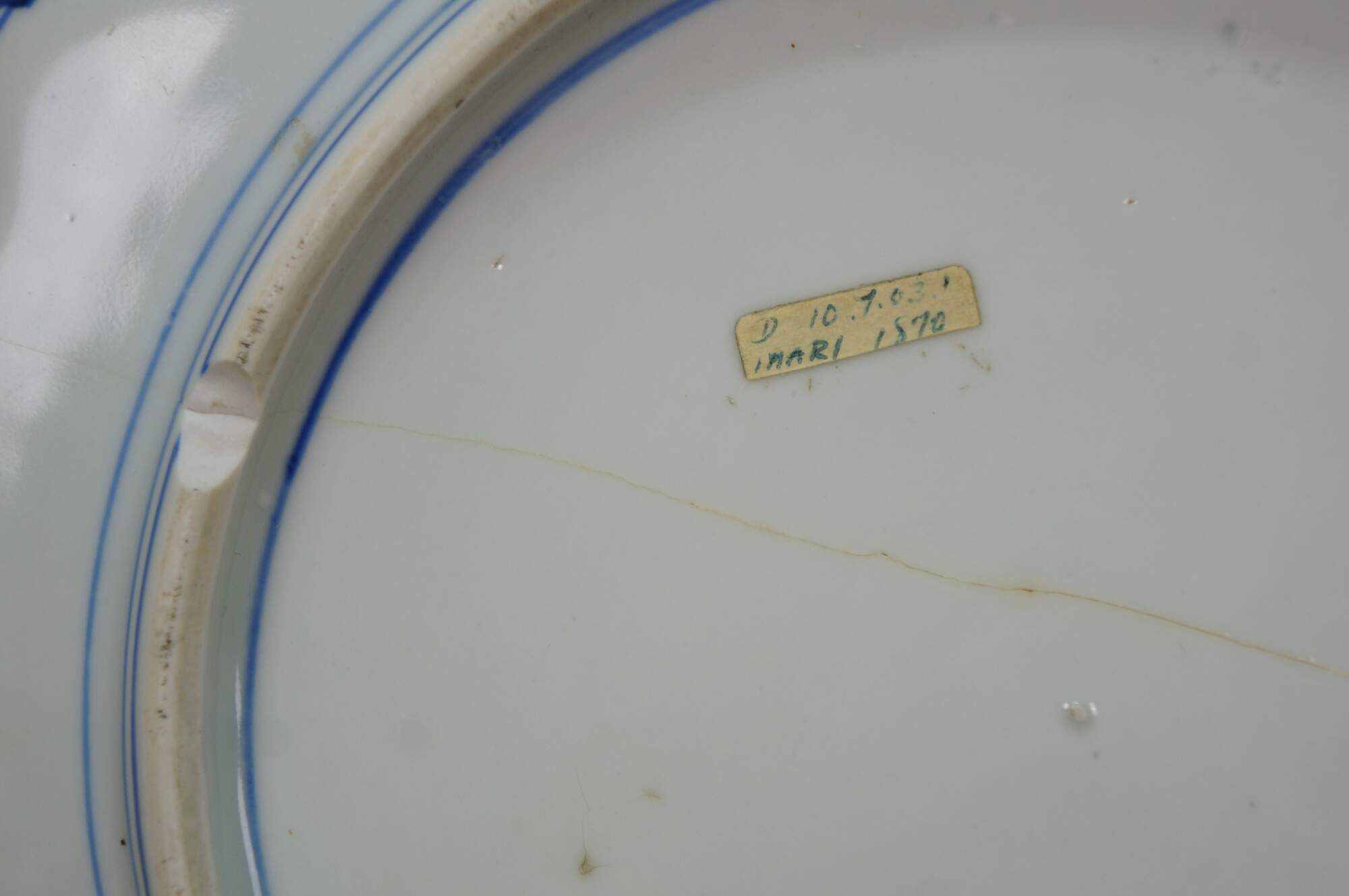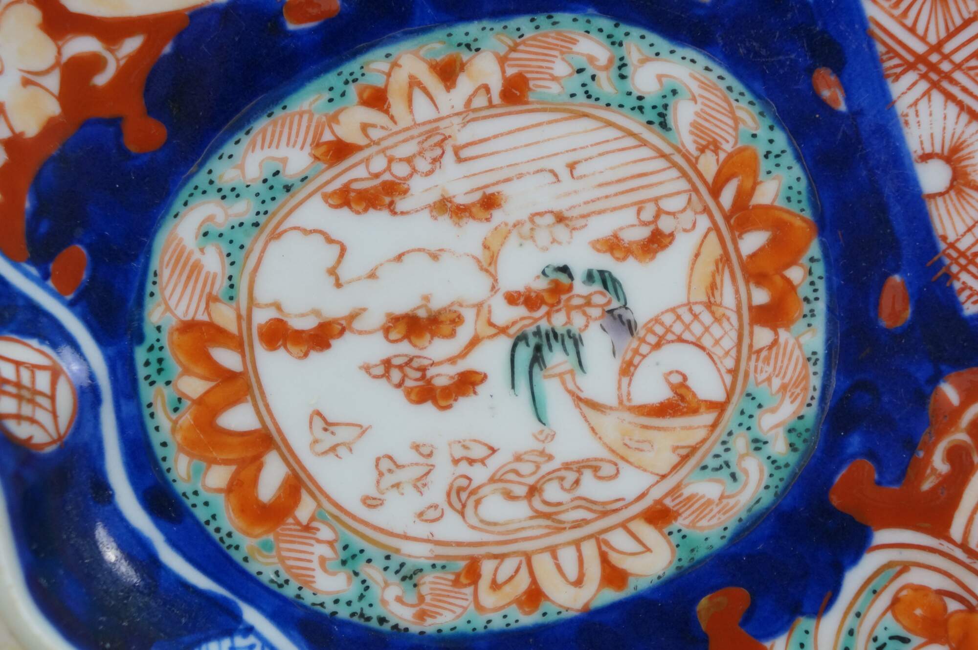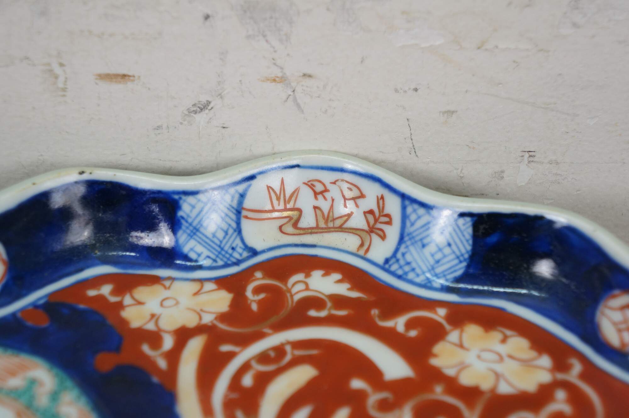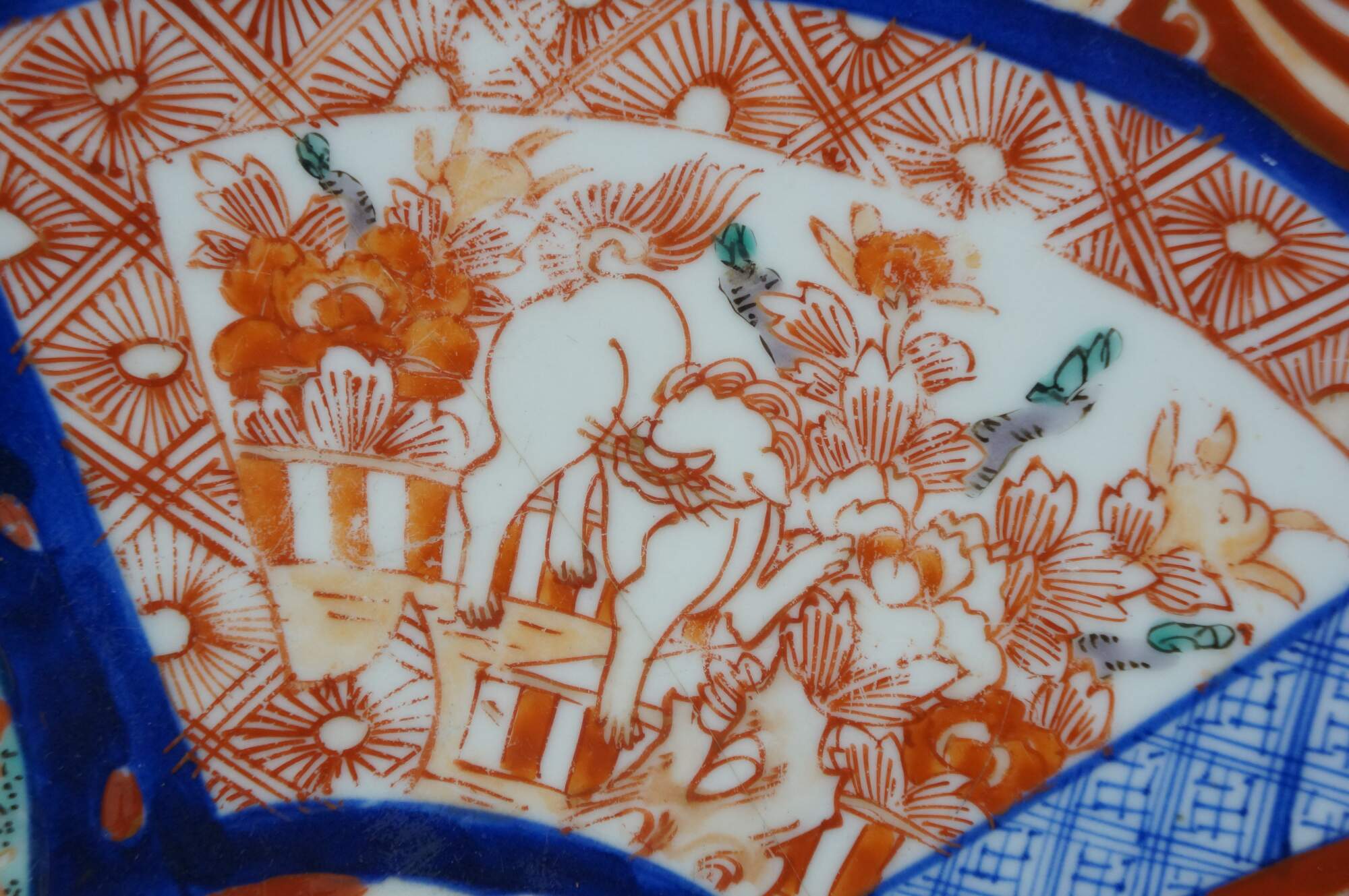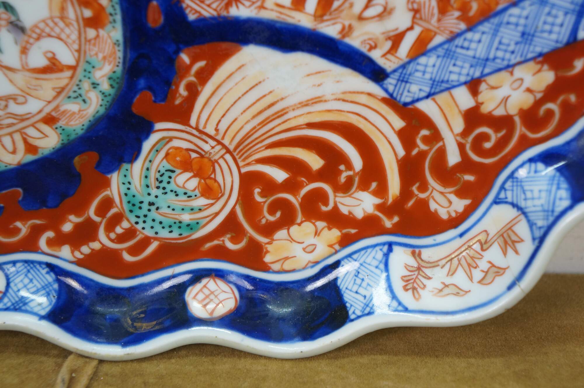 Antique Japanese imari porcelain serving platter / dish with a raised scalloped edge, decorated in orange, blue, and green with flowers, bauble with streaming ribbons, a figure in a boat on the water, and a foo dog in a garden.