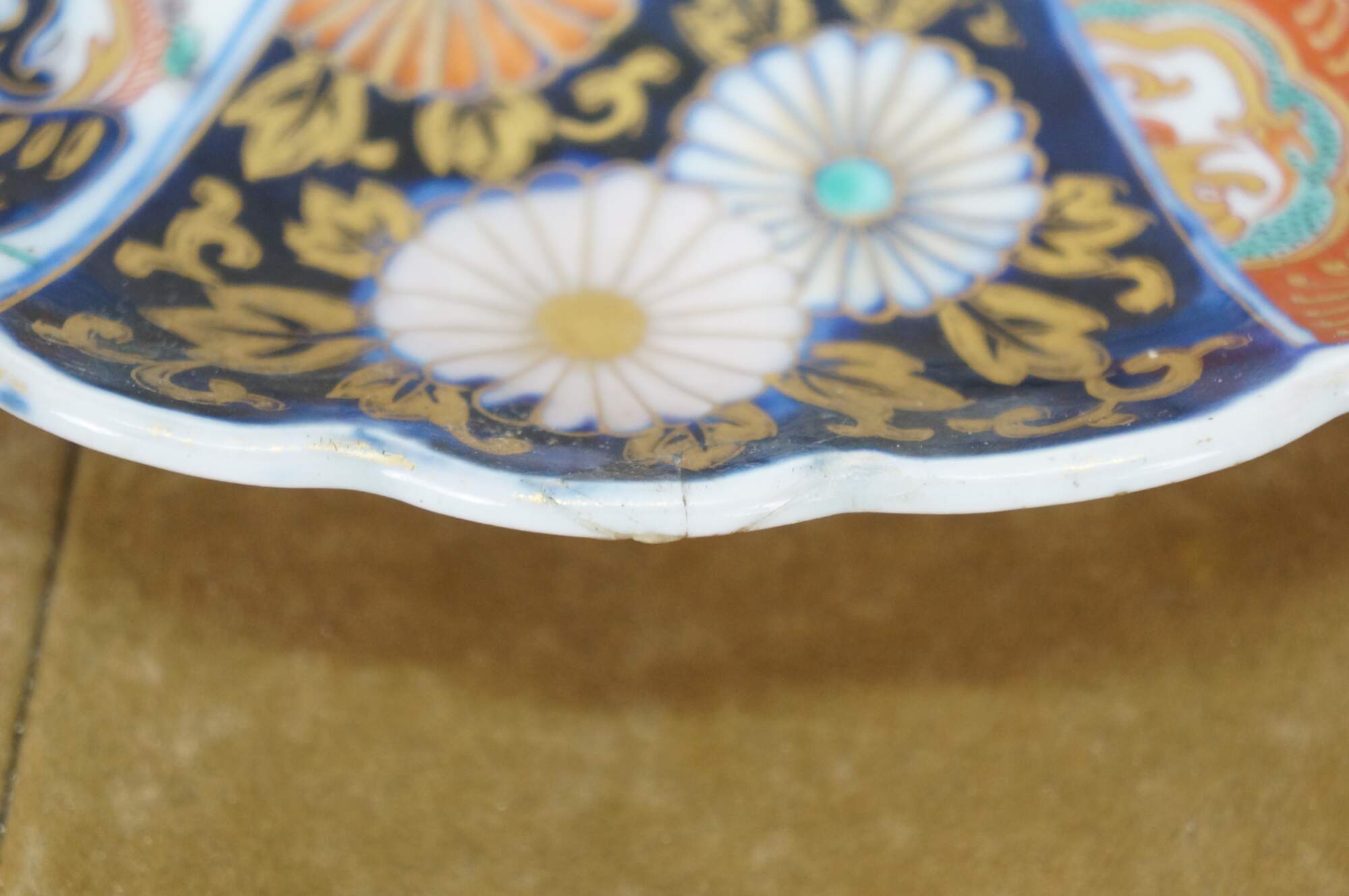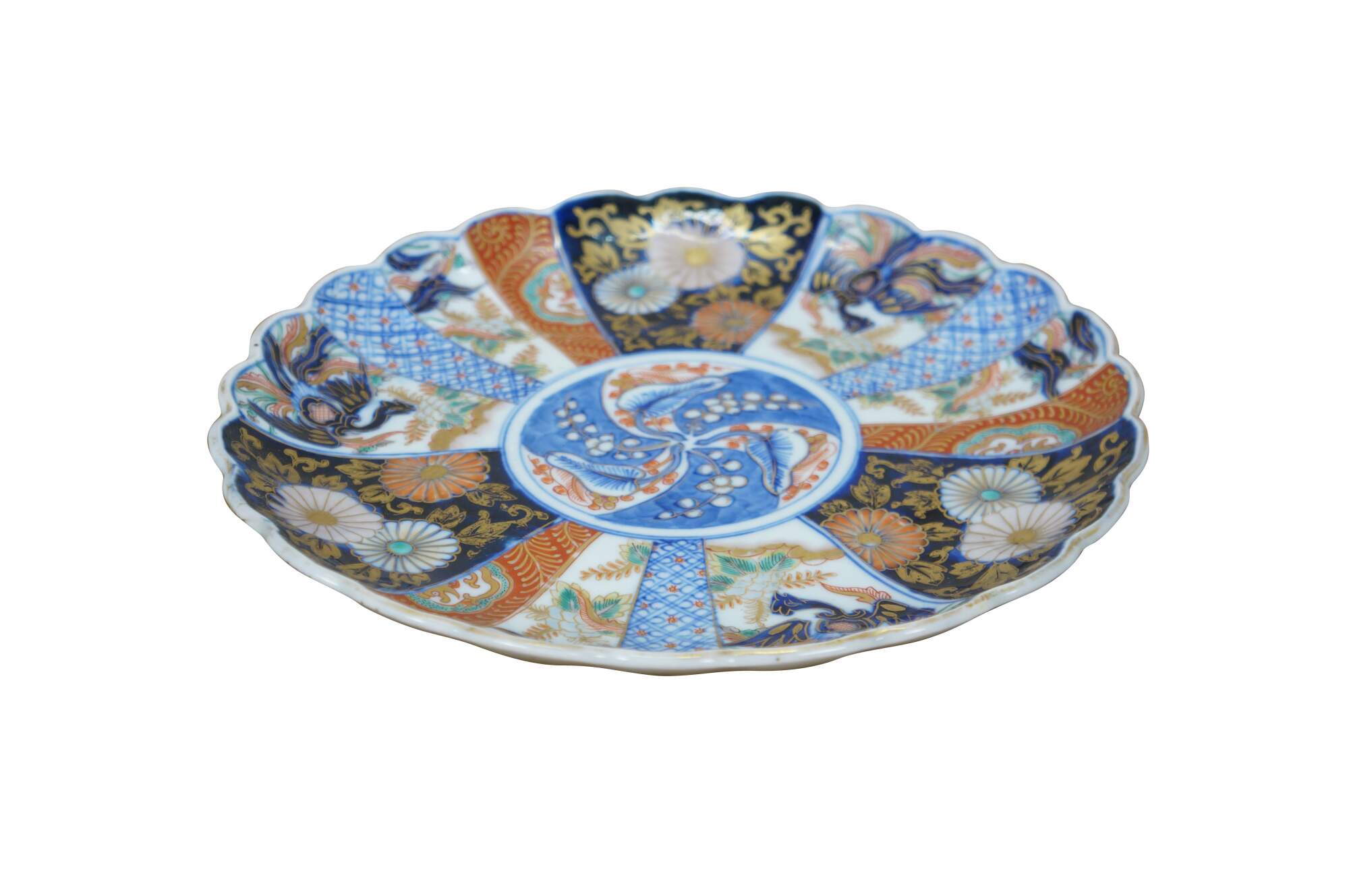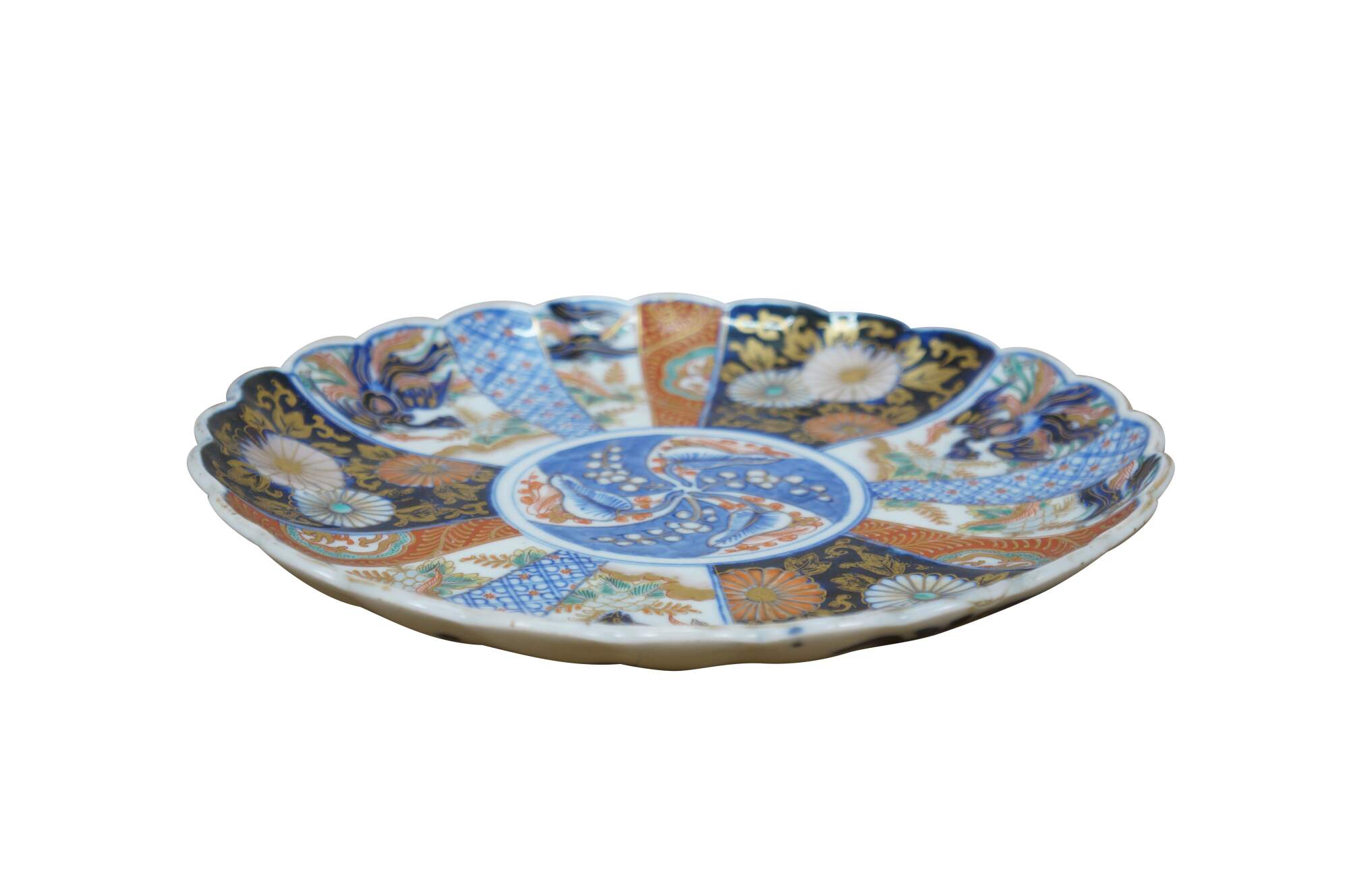 Antique Japanese imari porcelain serving plate / charger with scalloped edge, decorated in cobalt blue, orange, gold, and green with a central motif of berries and leaves, surrounded by panels of flowers, foliates, and flying phoenix bird.
