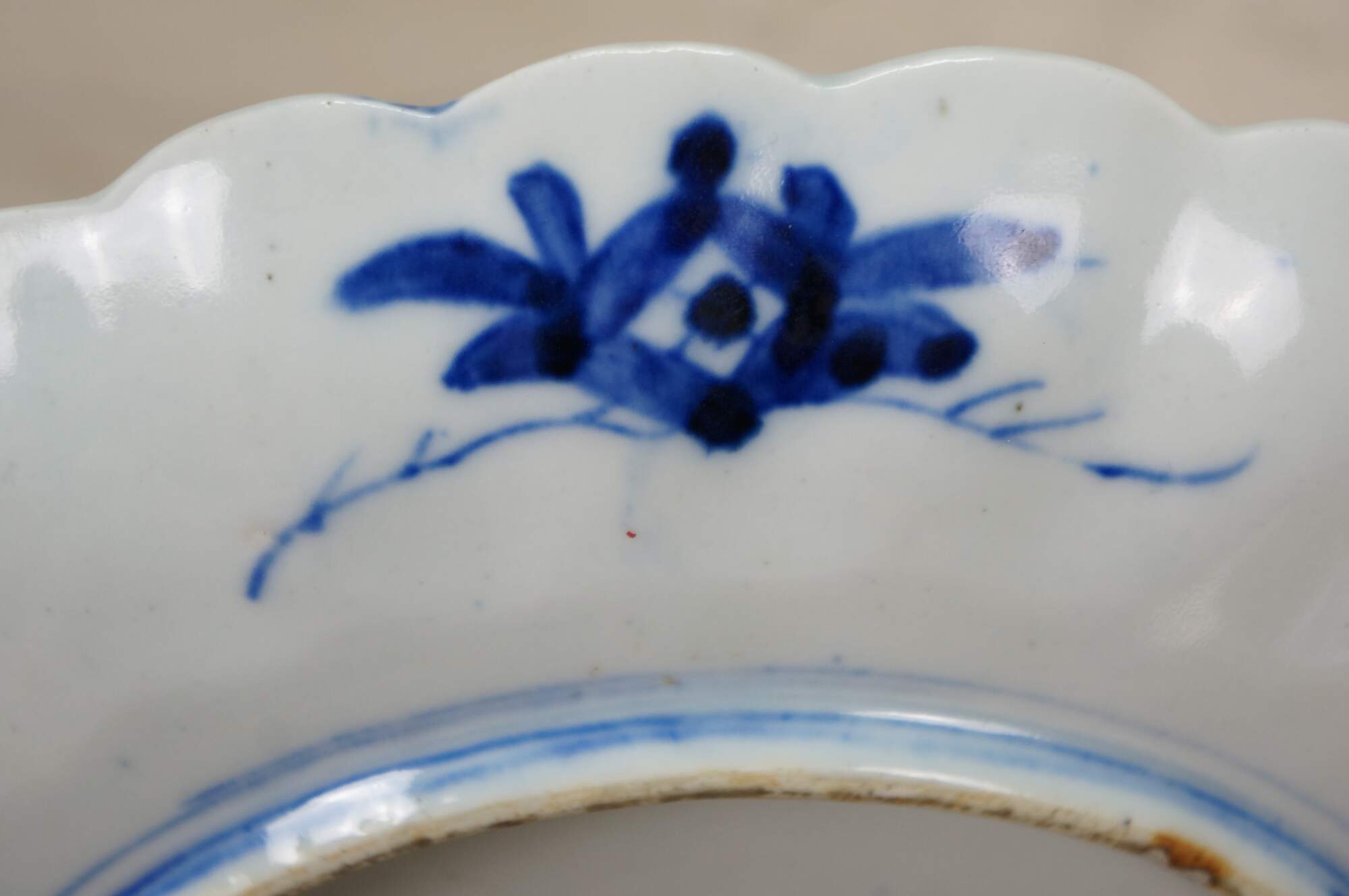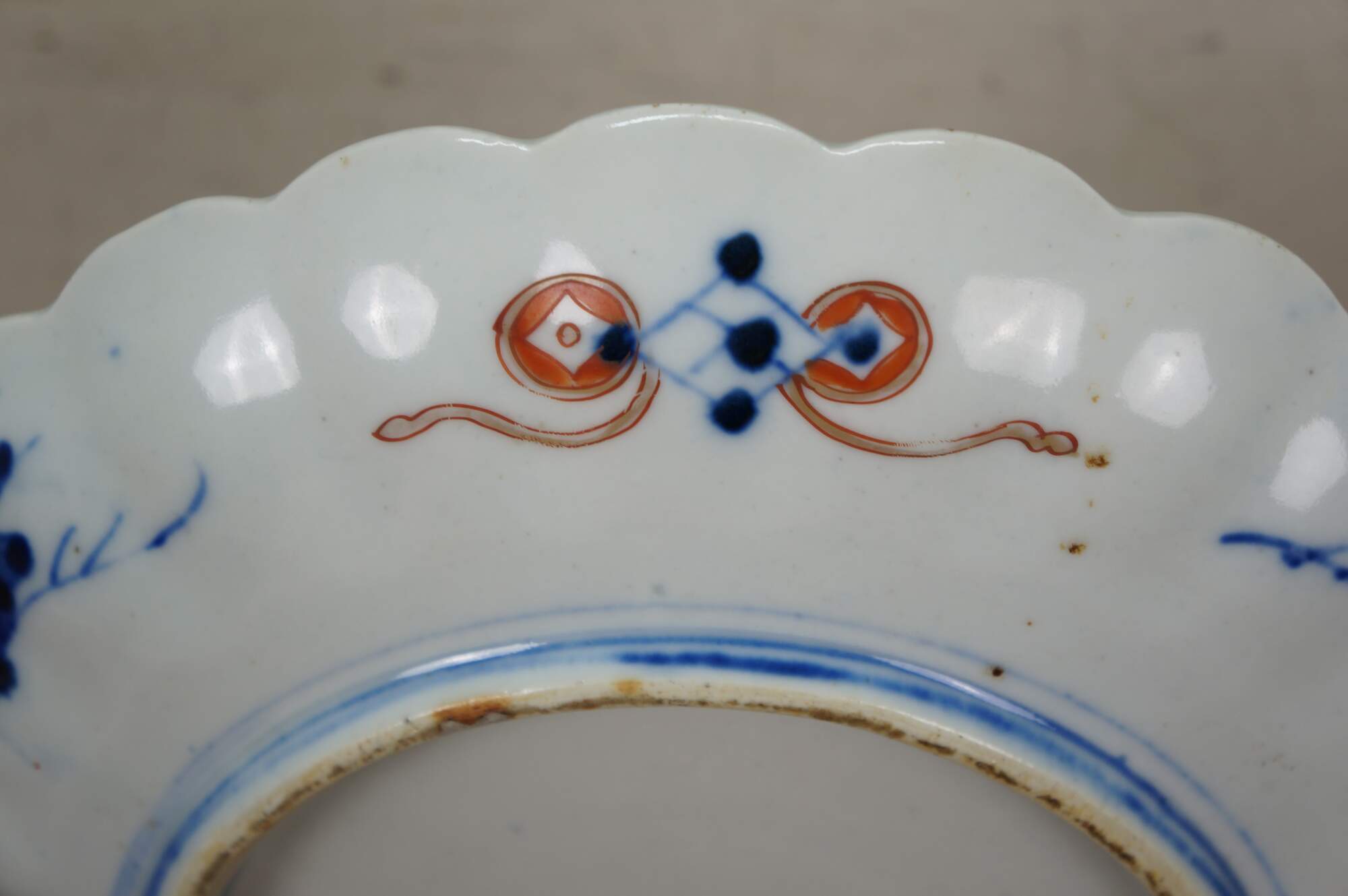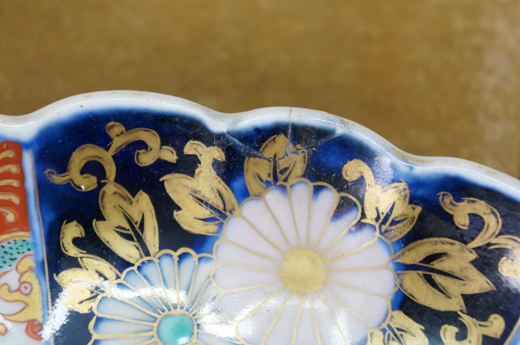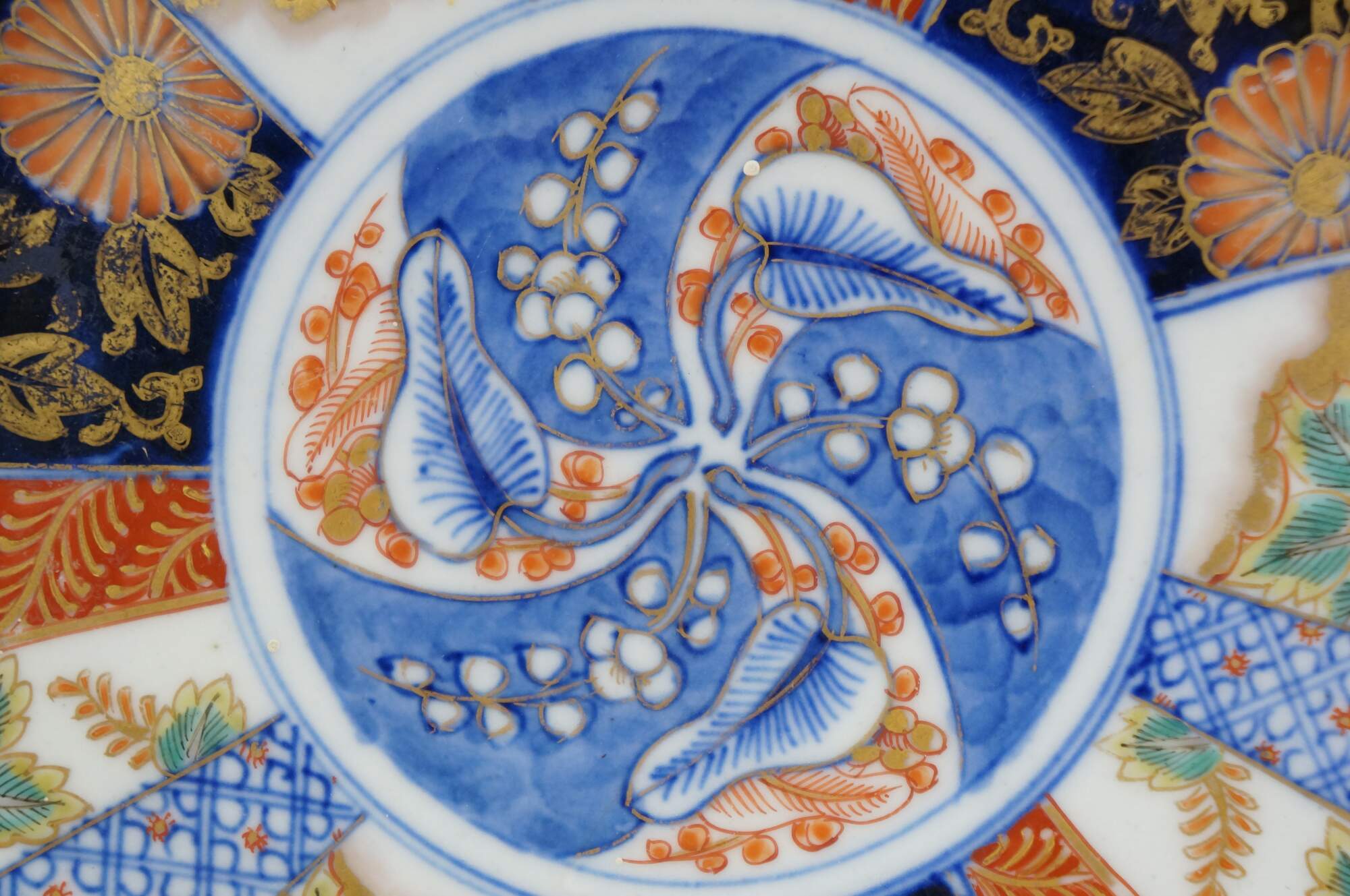 Antique Japanese imari porcelain serving plate / charger with scalloped edge, decorated in cobalt blue, orange, gold, and green with a central motif of berries and leaves, surrounded by panels of flowers, foliates, and flying phoenix bird.