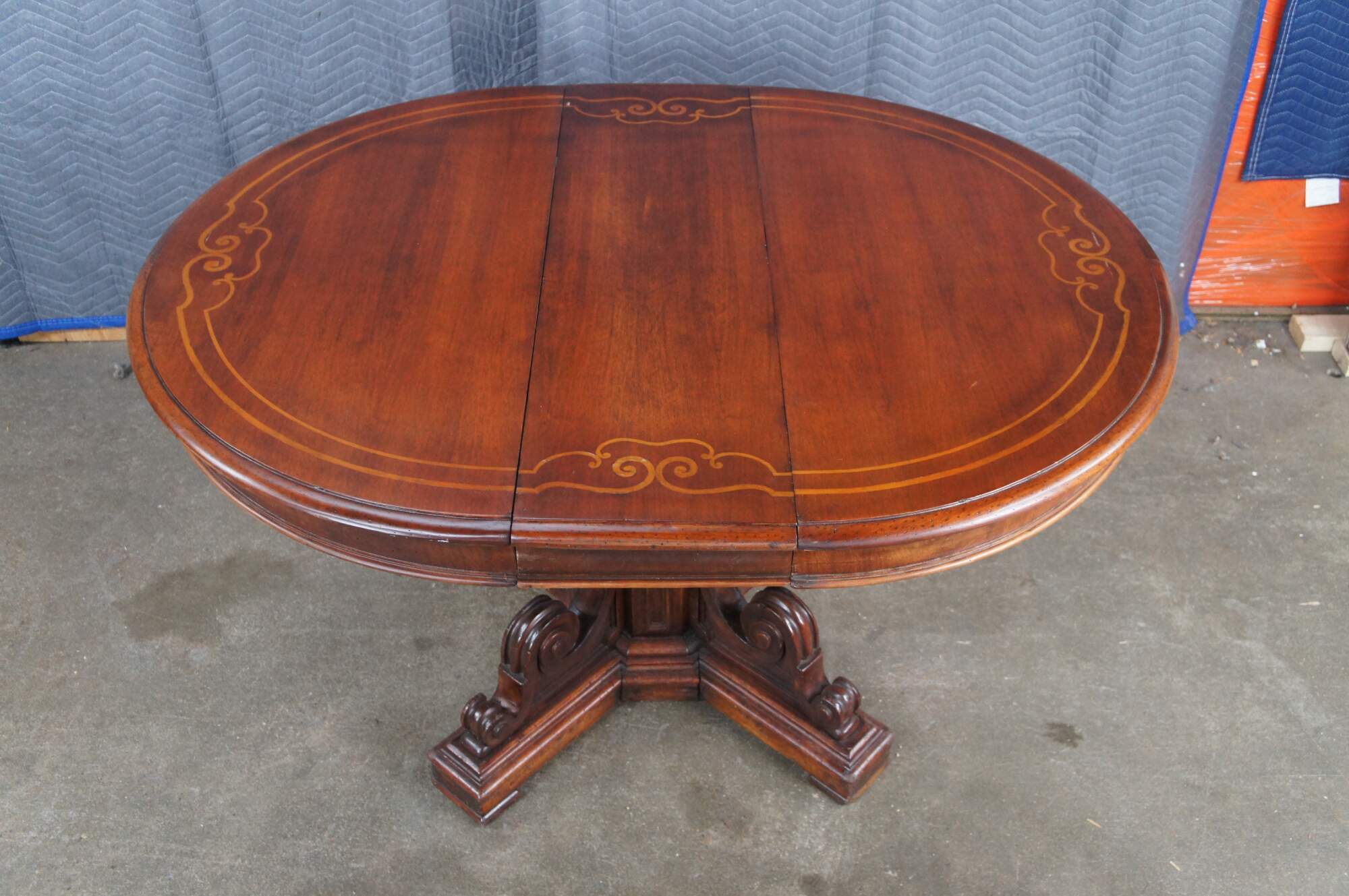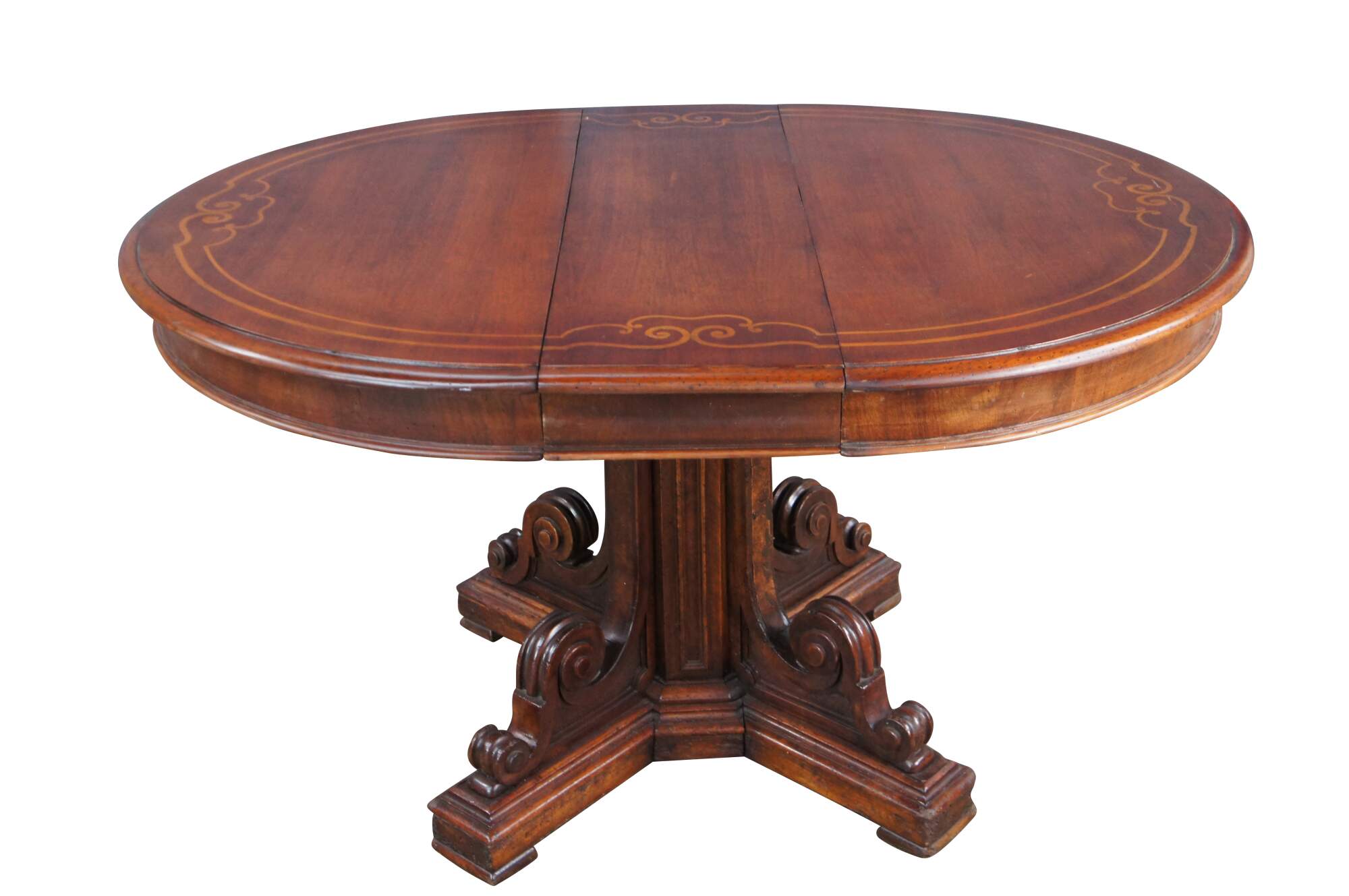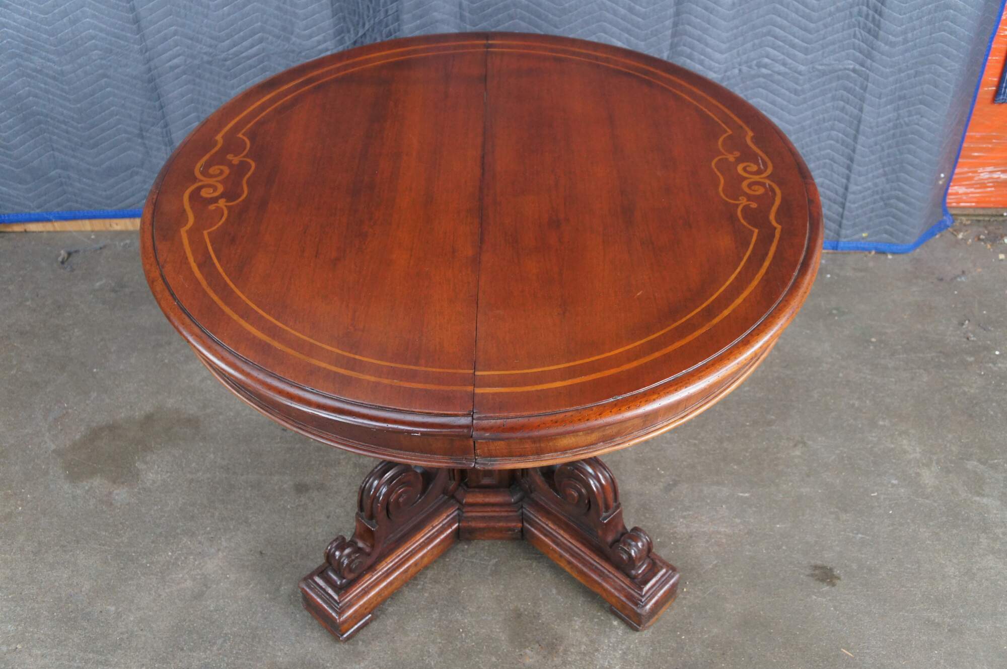 Antique Victorian extendable round to oval breakfast / entry / dining table. Made of mahogany featuring inlaid top supported by a corinthian pedestal column x form base with S scroll accents.