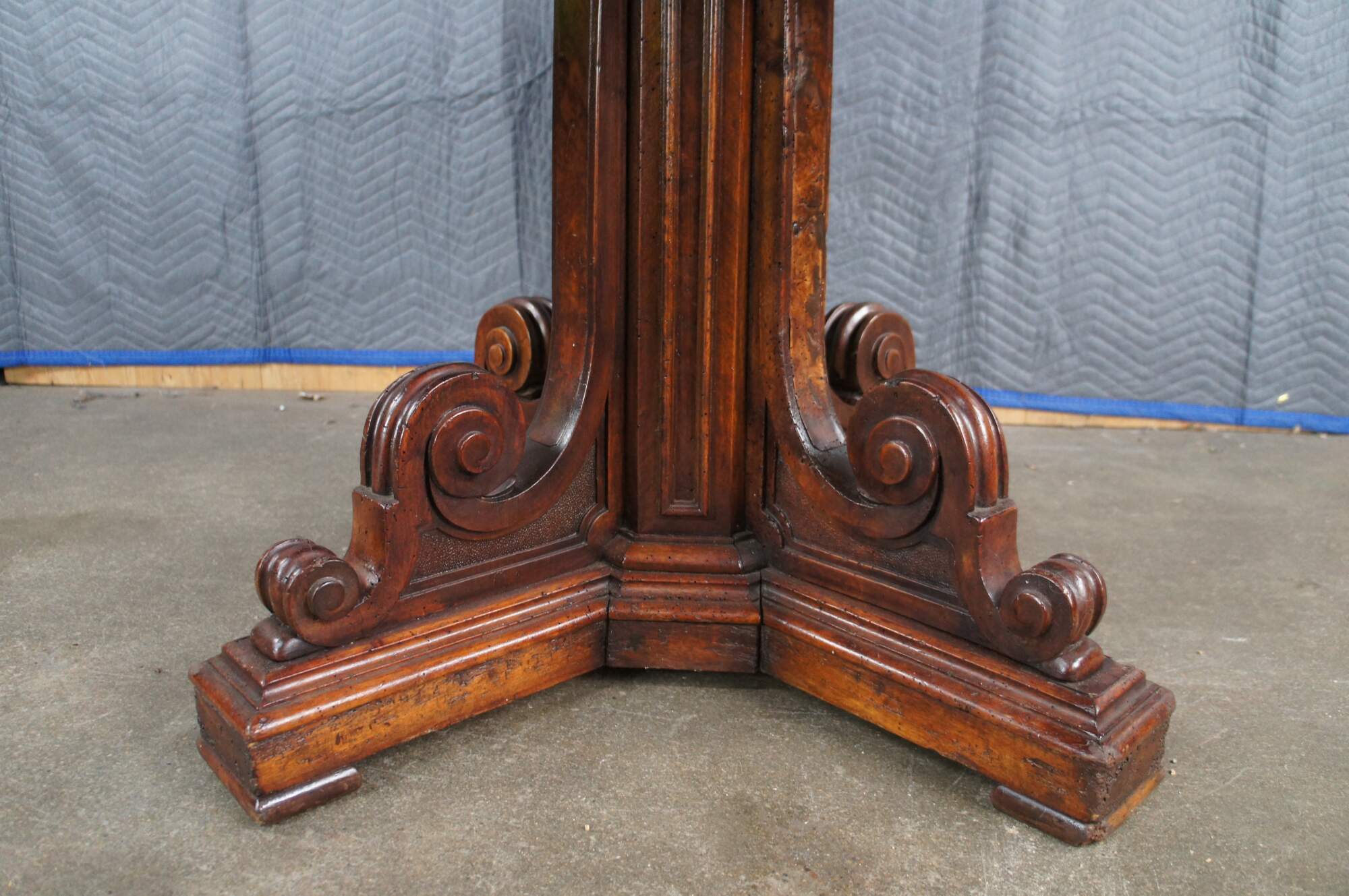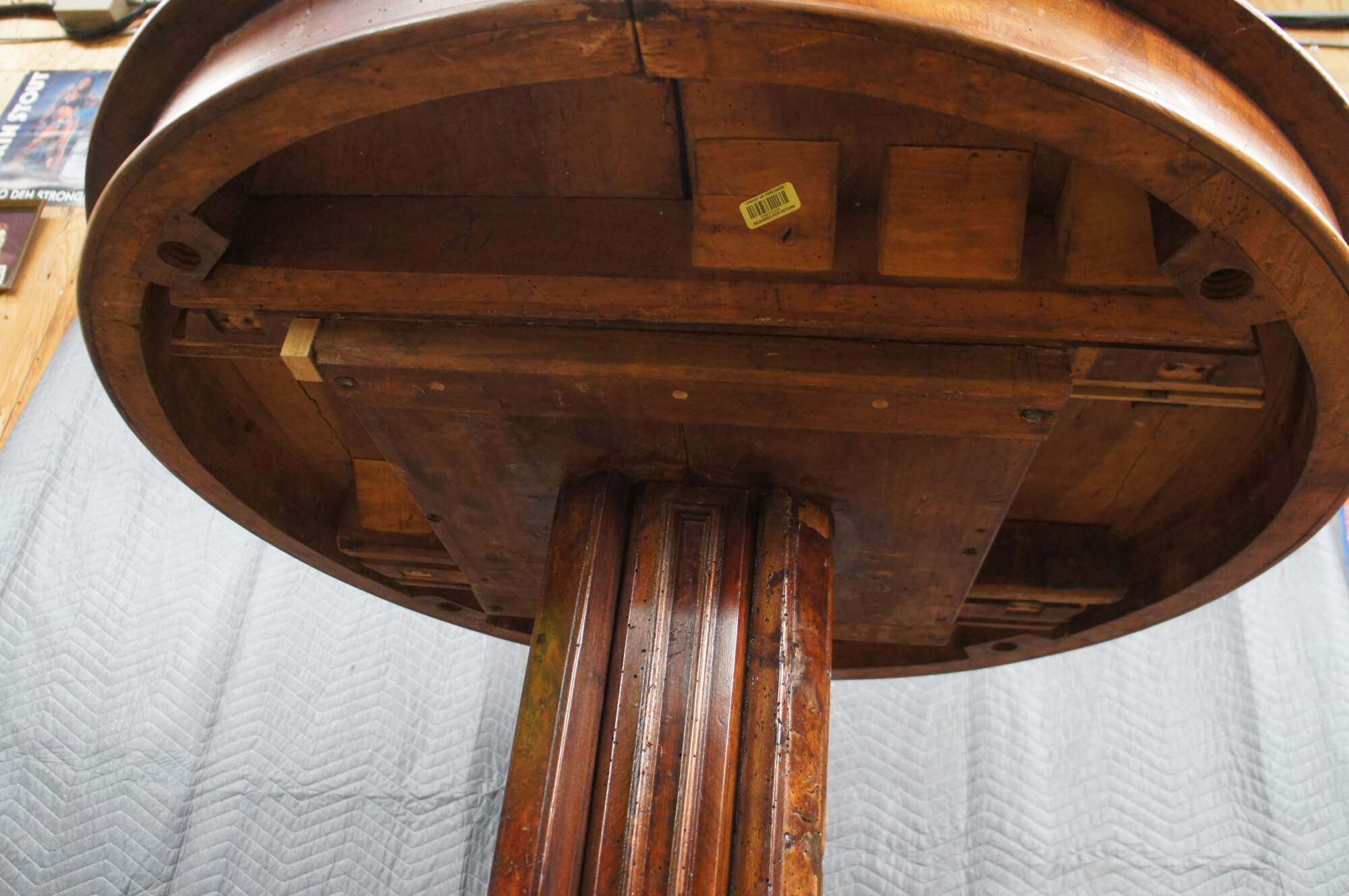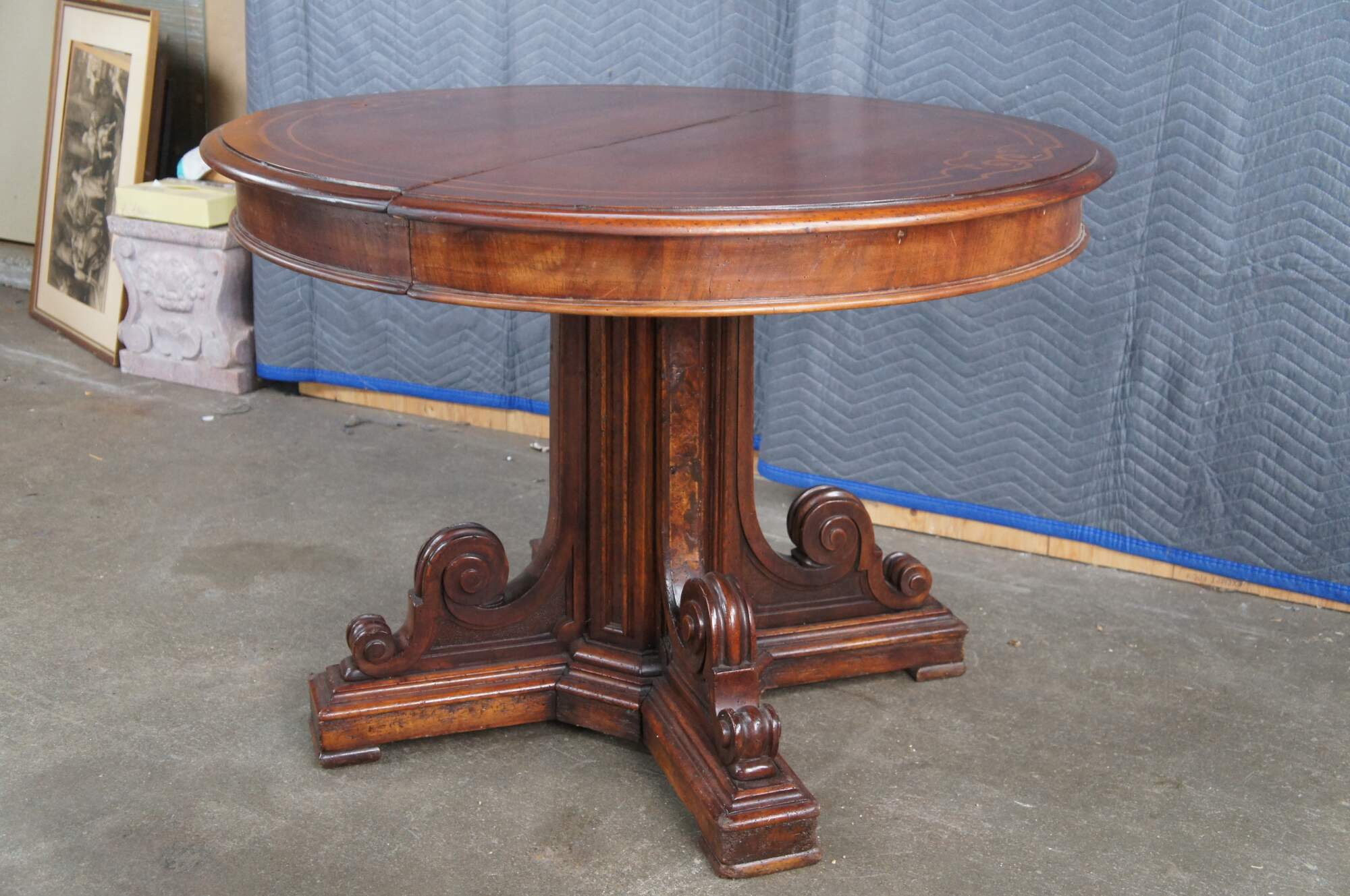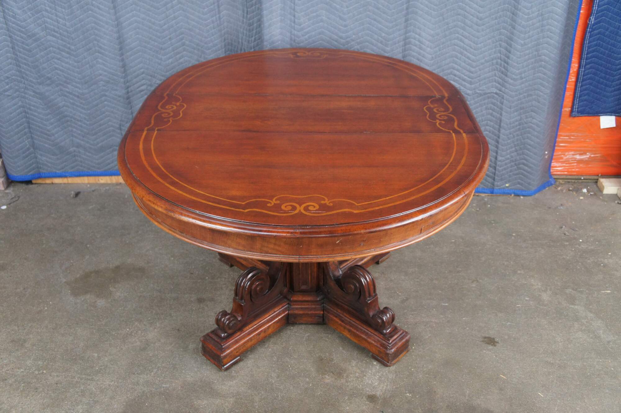 Antique Victorian extendable round to oval breakfast / entry / dining table. Made of mahogany featuring inlaid top supported by a corinthian pedestal column x form base with S scroll accents.