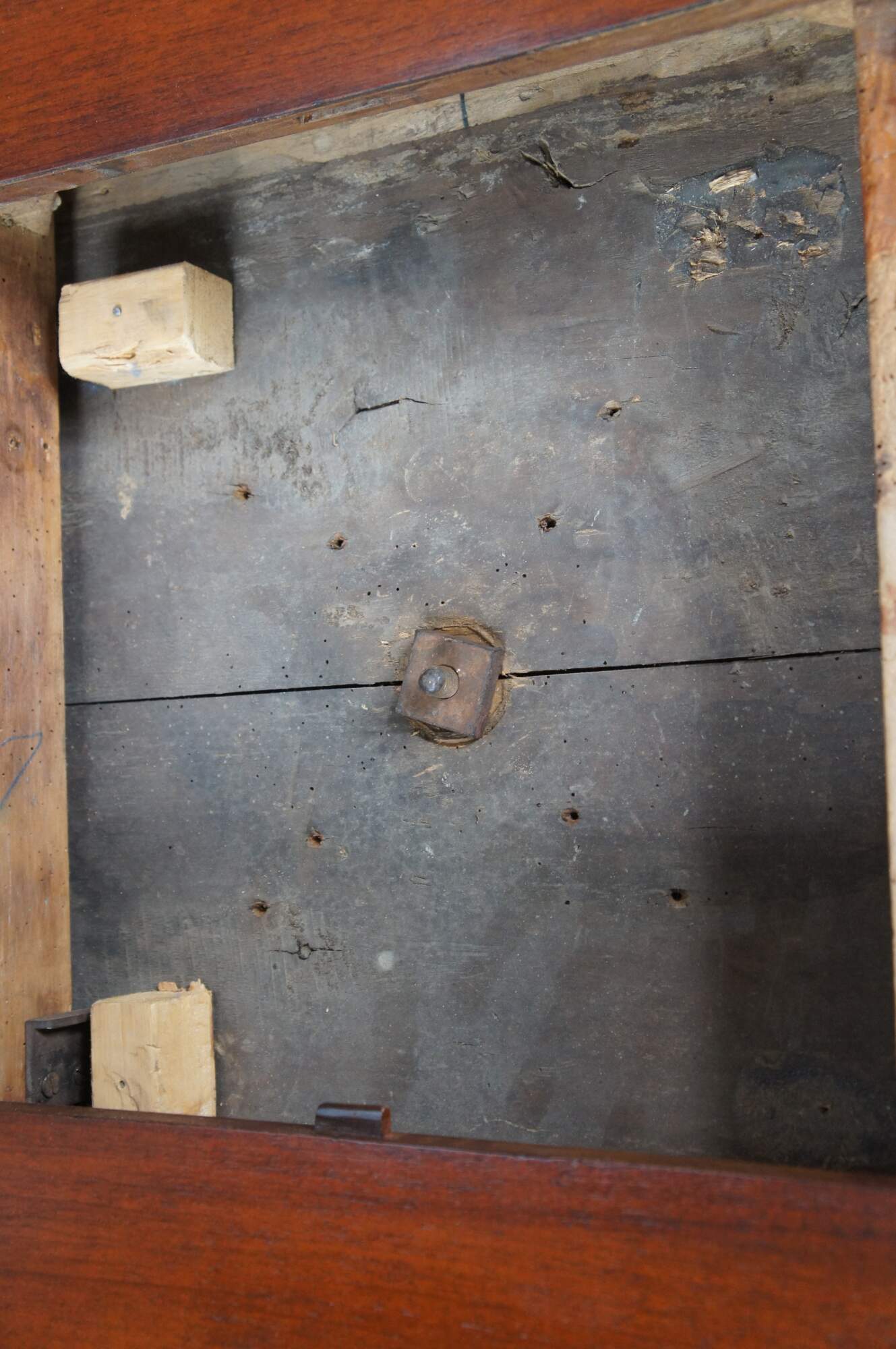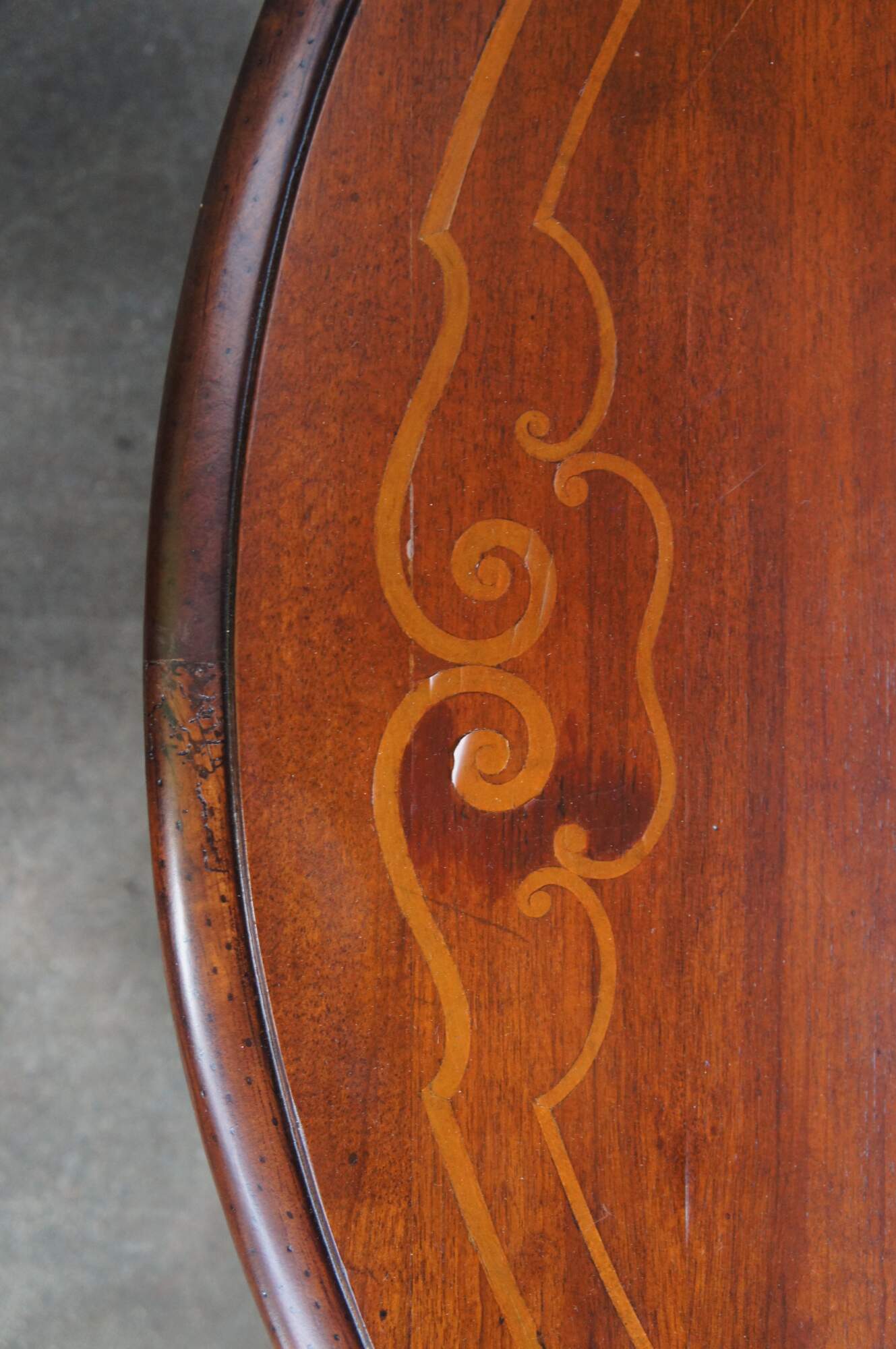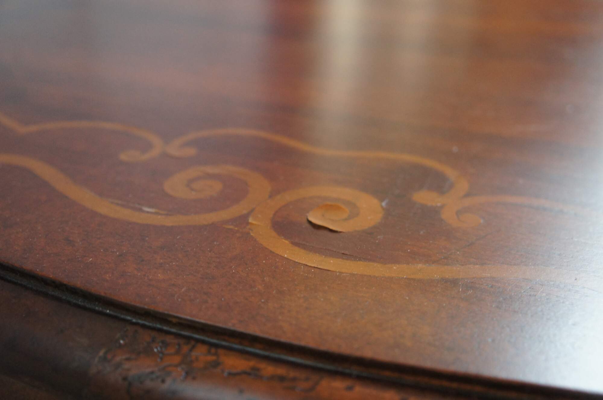 Structurally solid, wear and distressing from age and use, scuffing / marking / finish loss / veneer lifting from inlay, wormholes.