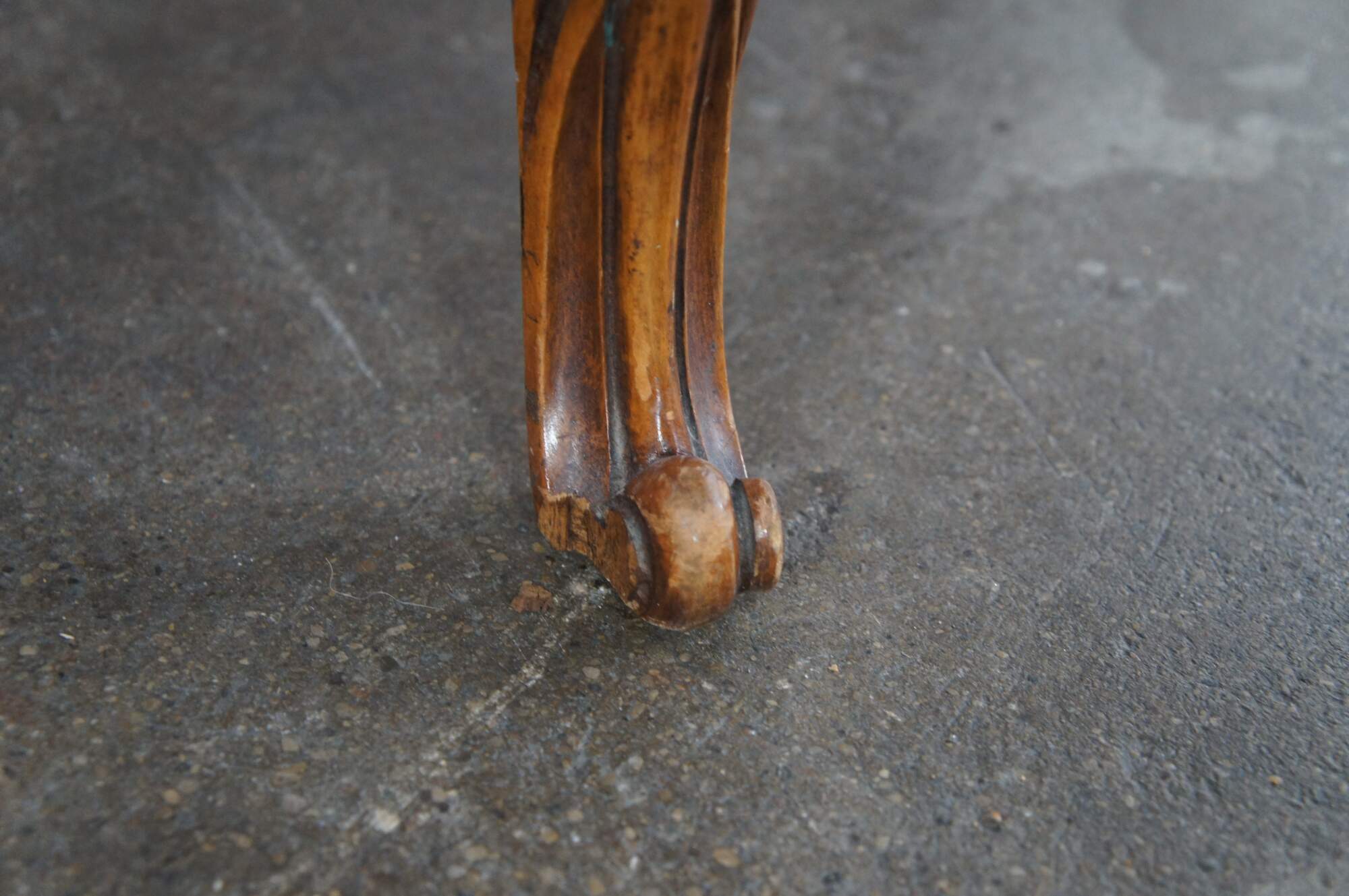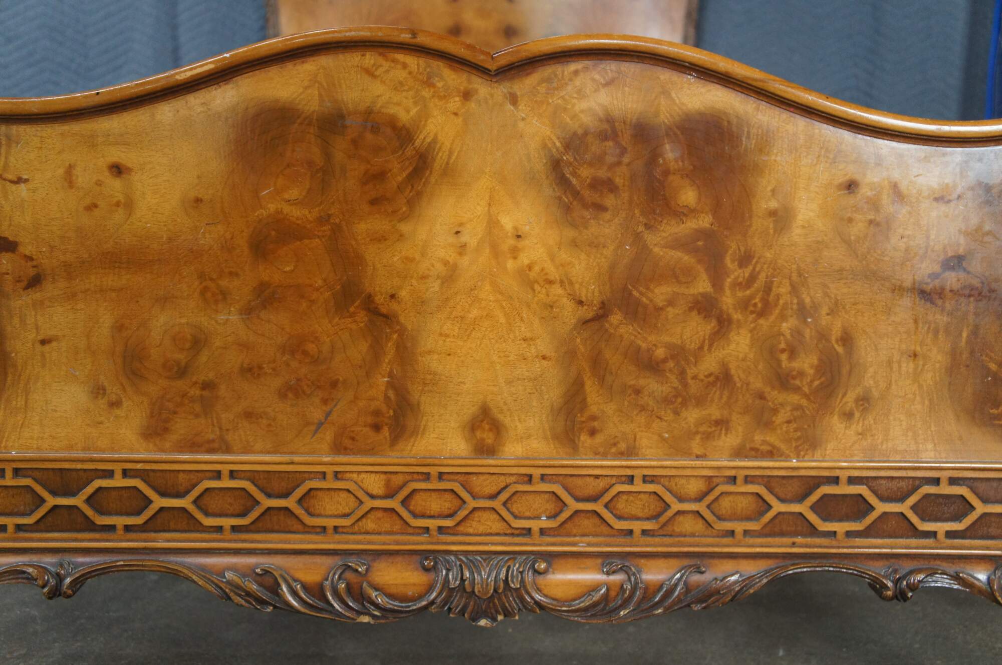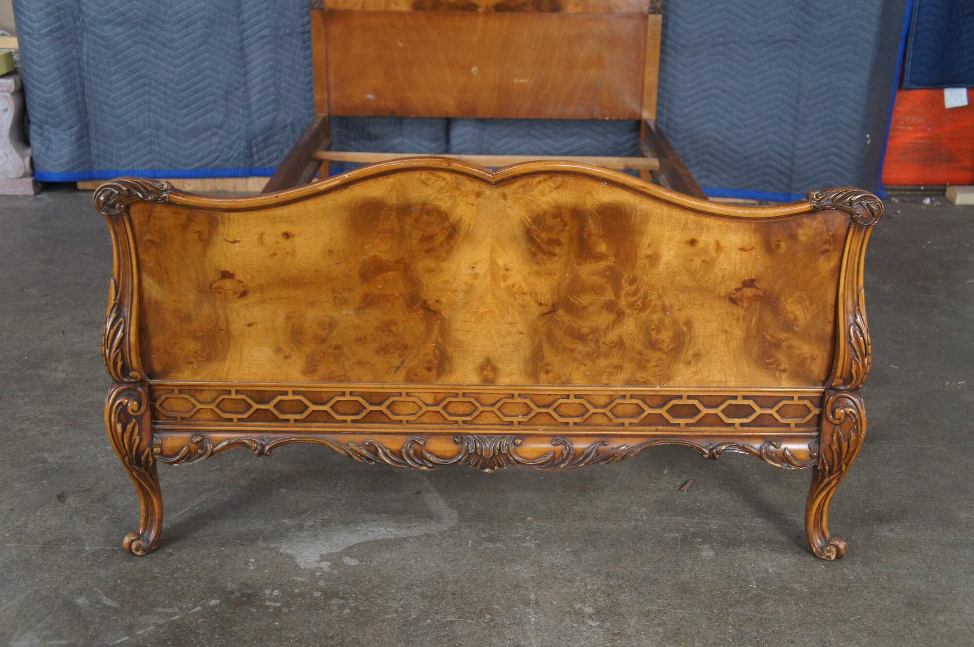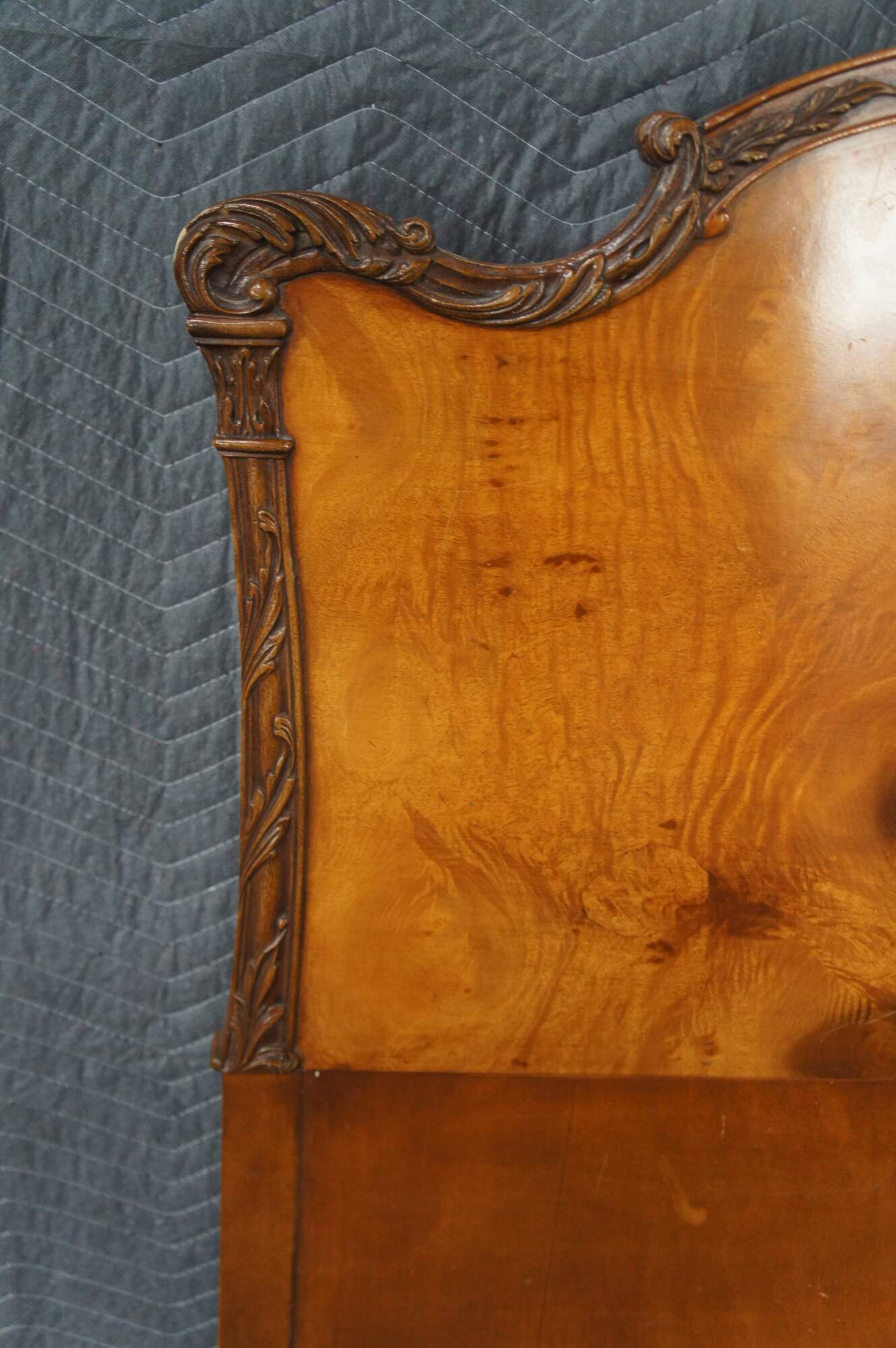 Antique French Louis XV style birdseye maple twin size bed featuring a serpentine design with carved scallop and floral / acanthus accents over cabriole legs.