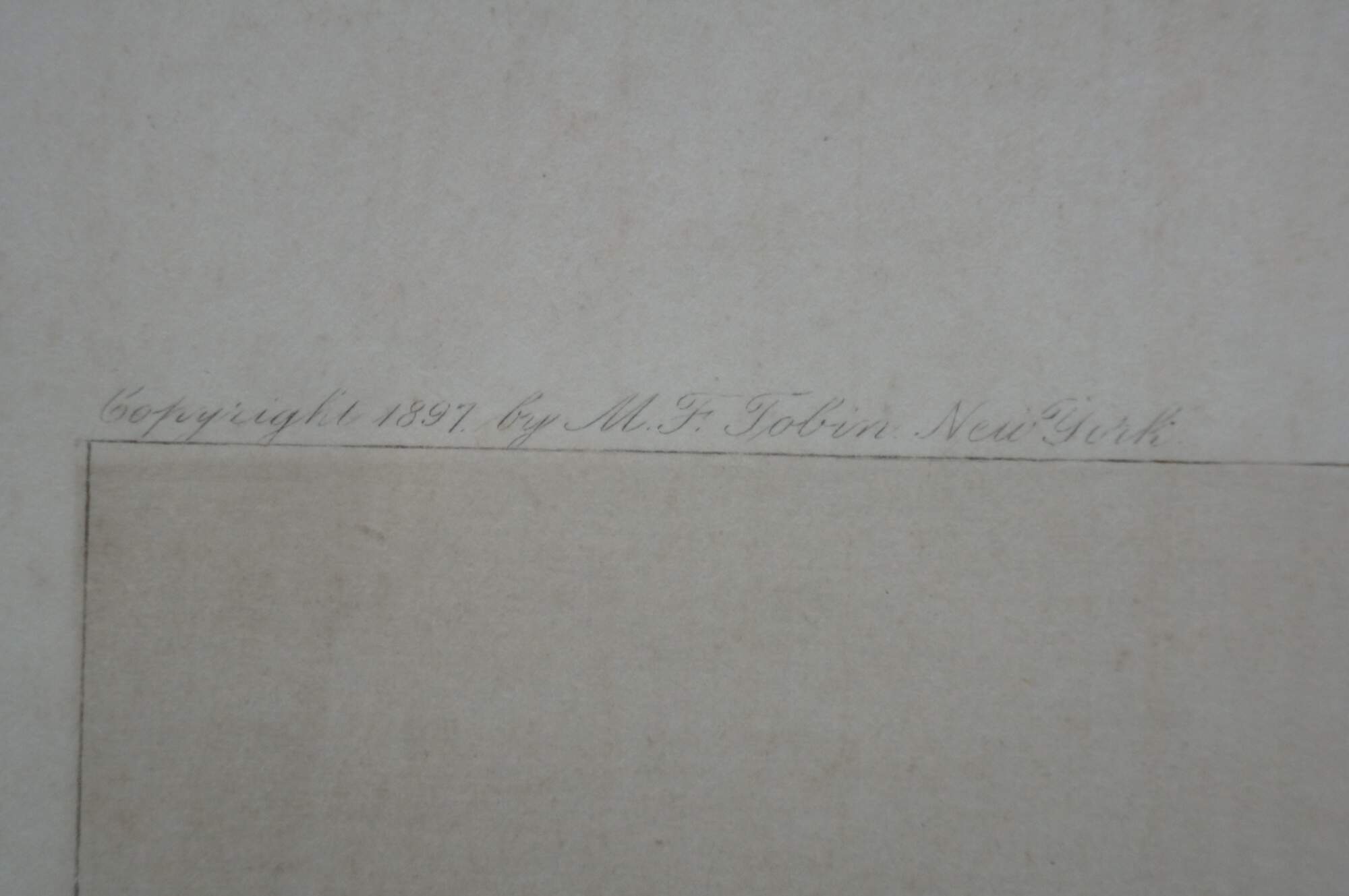 Late 19th century black and white etching of "The Birthplace of George Washington" by Louise Howland King. Landscape of a country cottage by a river. Title printed, lower left. Remarke of a saw (wall?), lower edge. Pencil signed, lower right. Copyright 1897 by MF Tobin, New York. Beveled oak frame with lightly carved detail; black mat.