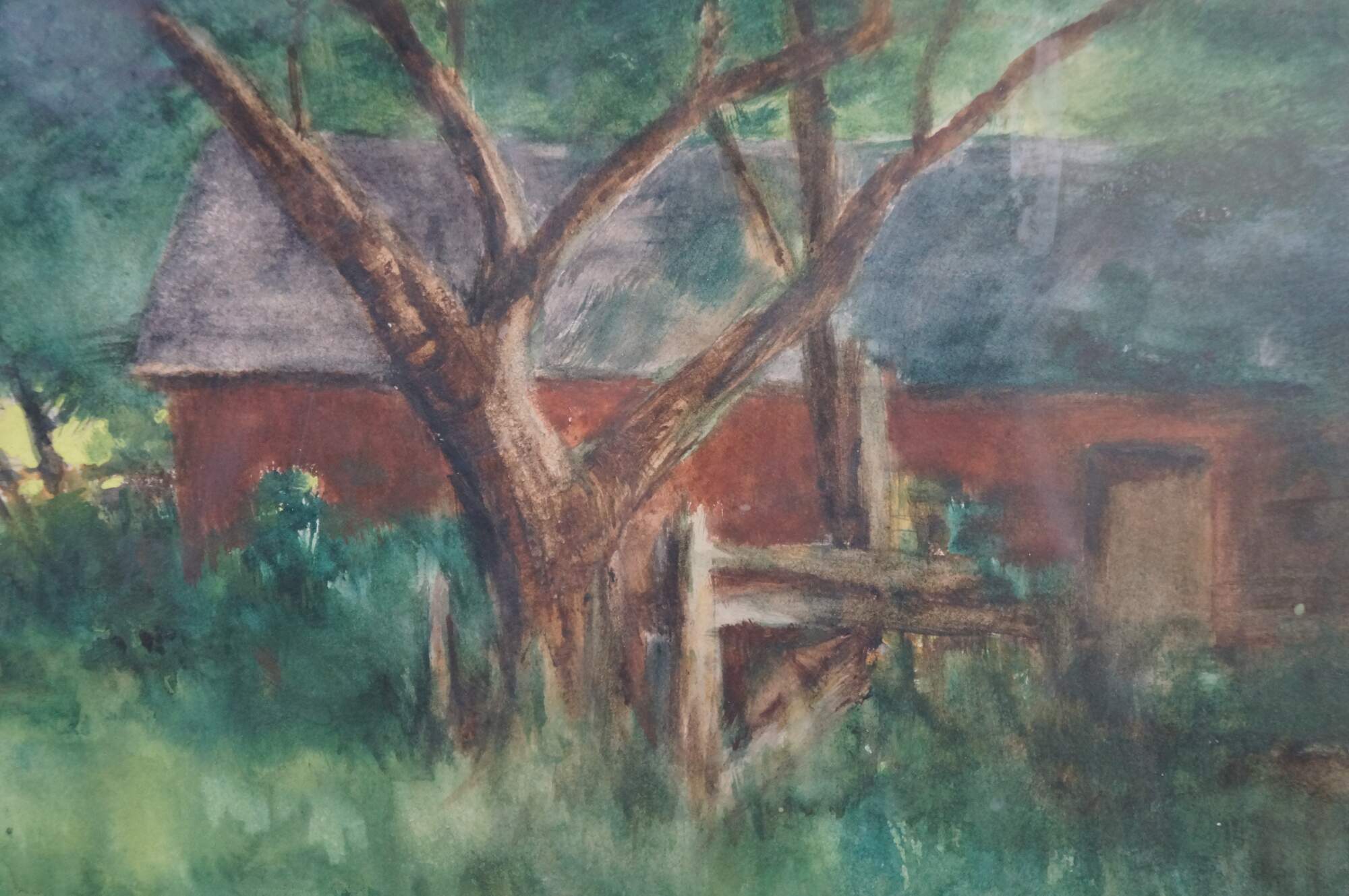 Late 19th to early 20th century watercolor painting by Edward Loyal Field. Landscape showing a country road going past a red barn in the trees. Signed, lower right. Beveled gilt wood frame; off white and white layered mat.