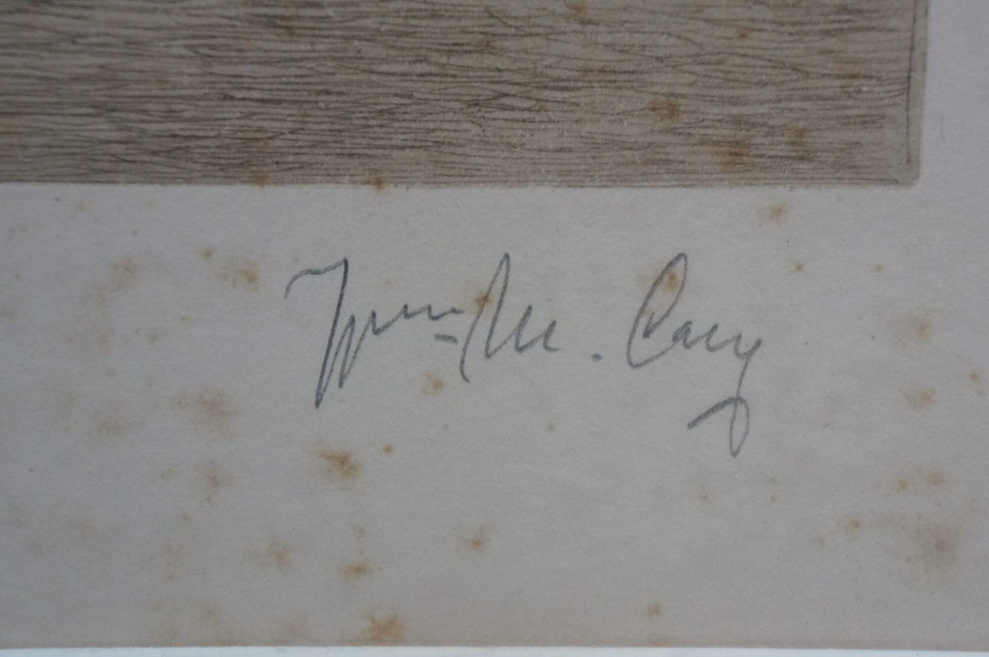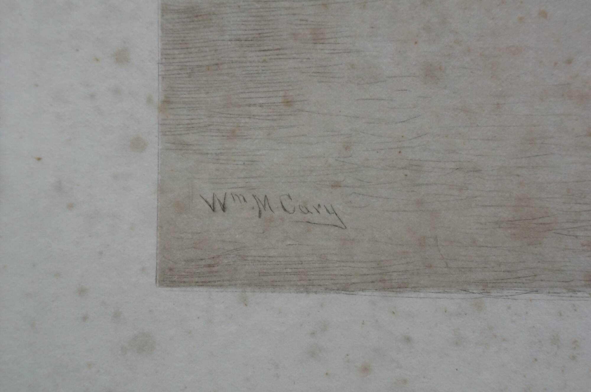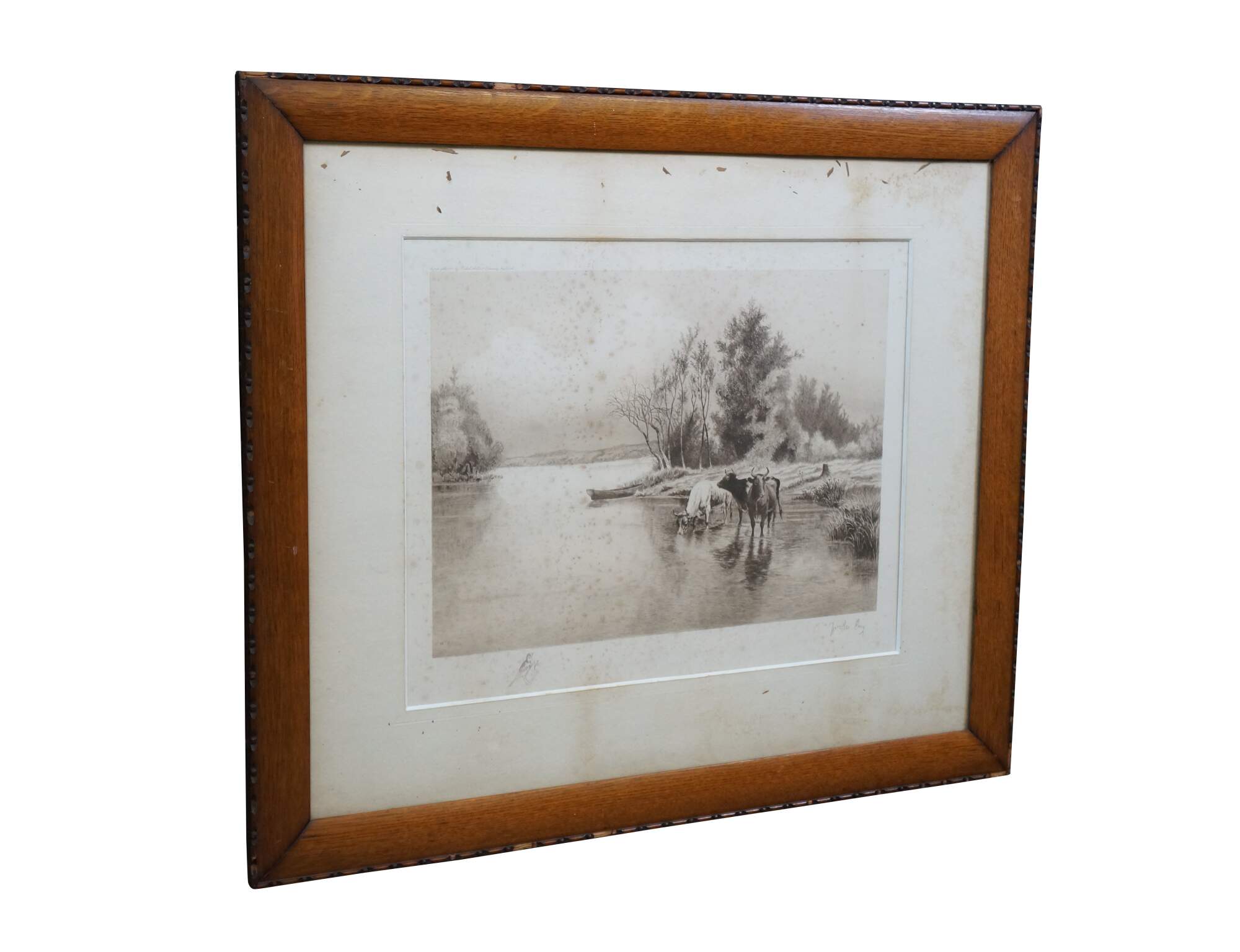 Late 19th century black and white etching by William de la Montagne Cary. Farmhouse landscape of bulls / cows and a boat at the edge of a river. Signed in plate Wm M Cary, lower left. Remarke of a bird, lower edge. Pencil signed, lower right. Copyright 1891 by Fishel, Adler & Schwartz, New York. Wood frame with carved beaded border; white mat.