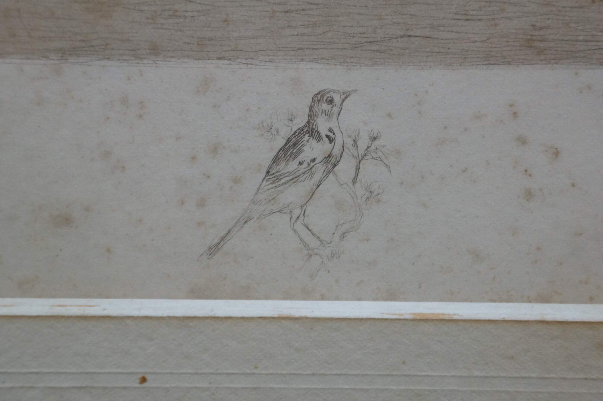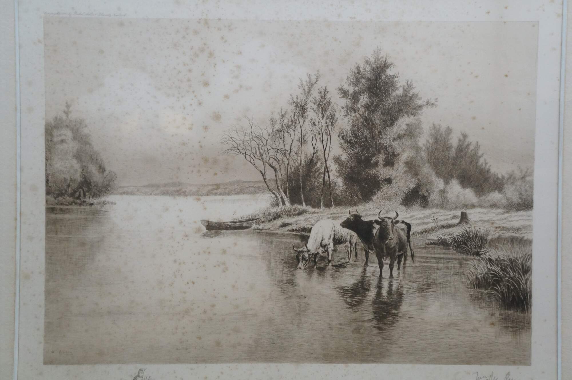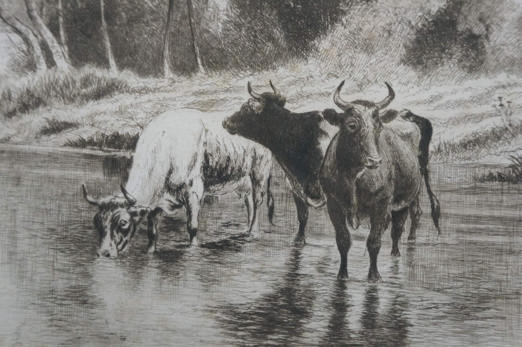 Late 19th century black and white etching by William de la Montagne Cary. Farmhouse landscape of bulls / cows and a boat at the edge of a river. Signed in plate Wm M Cary, lower left. Remarke of a bird, lower edge. Pencil signed, lower right. Copyright 1891 by Fishel, Adler & Schwartz, New York. Wood frame with carved beaded border; white mat.