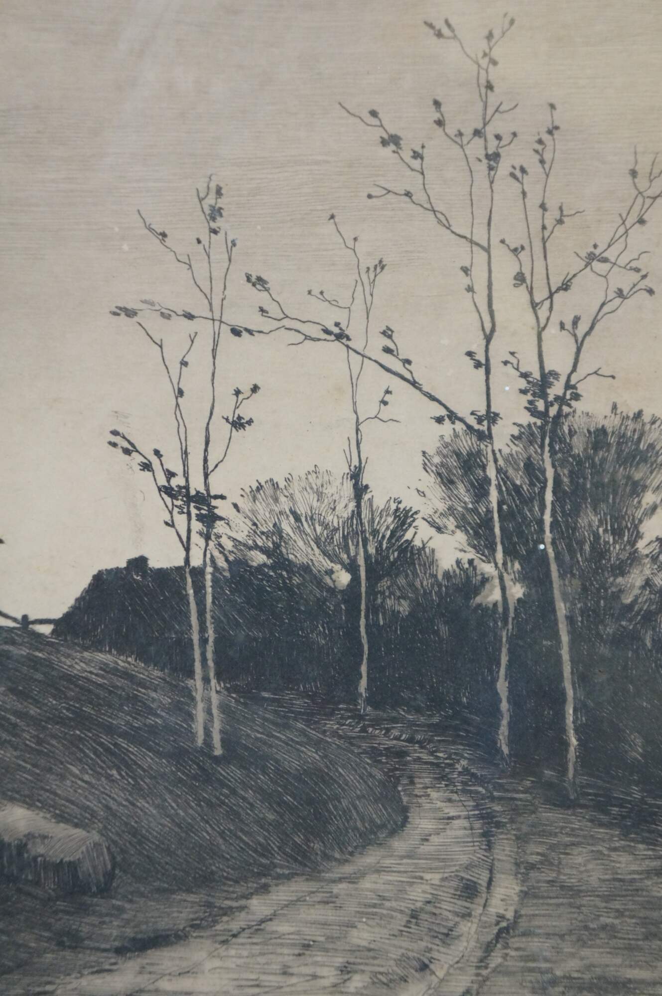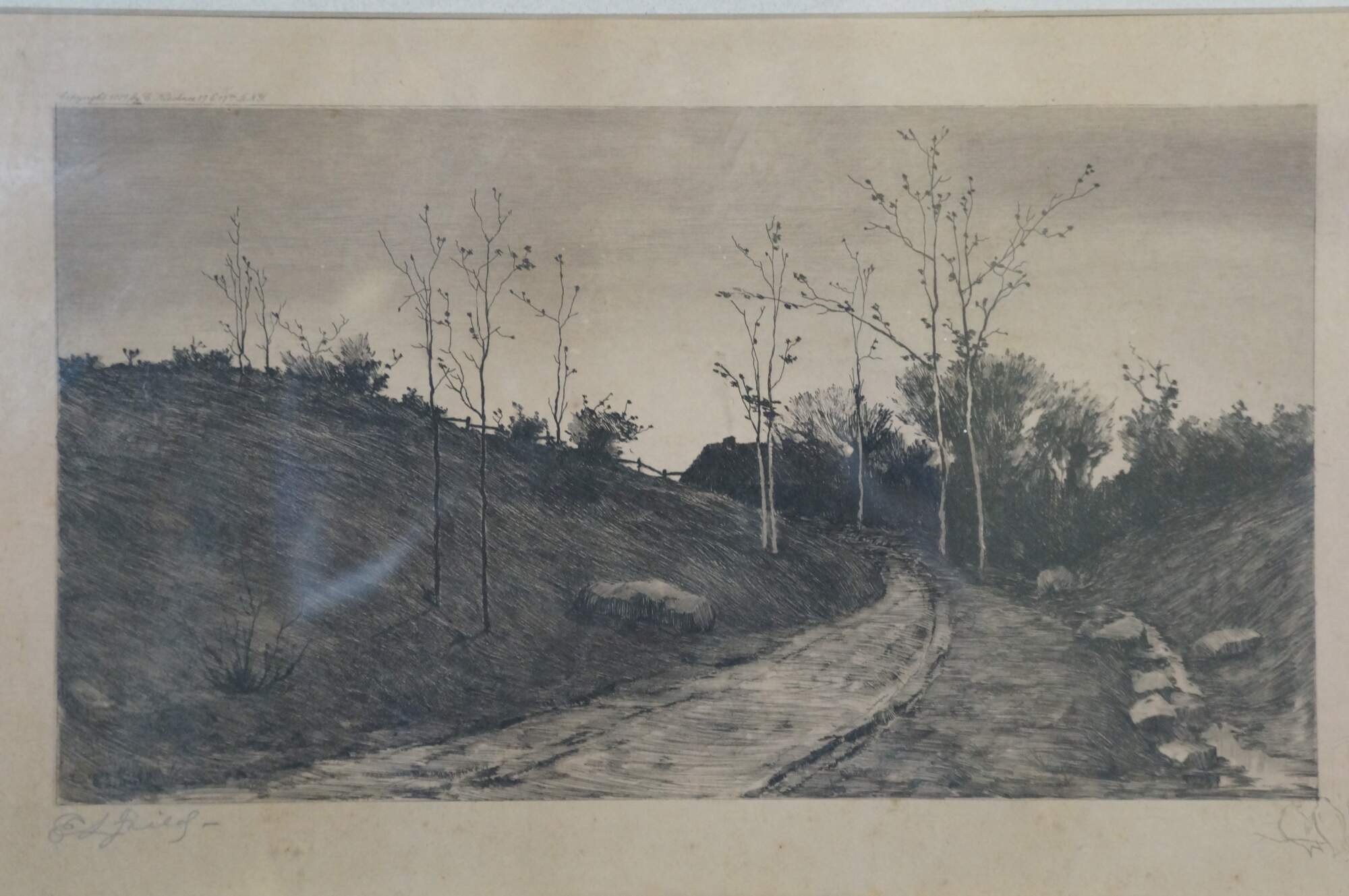 Late 19th century black and white etching by Edward Loyal Field. Landscape showing a country road curving around a hill. Signed in plate EL Field. Pencil signed, lower left. Remarked of birds on a chimney, lower right. Copyright 1887 by C. Klackner 17 E 17th St, NY. Beveled oak frame; white mat.