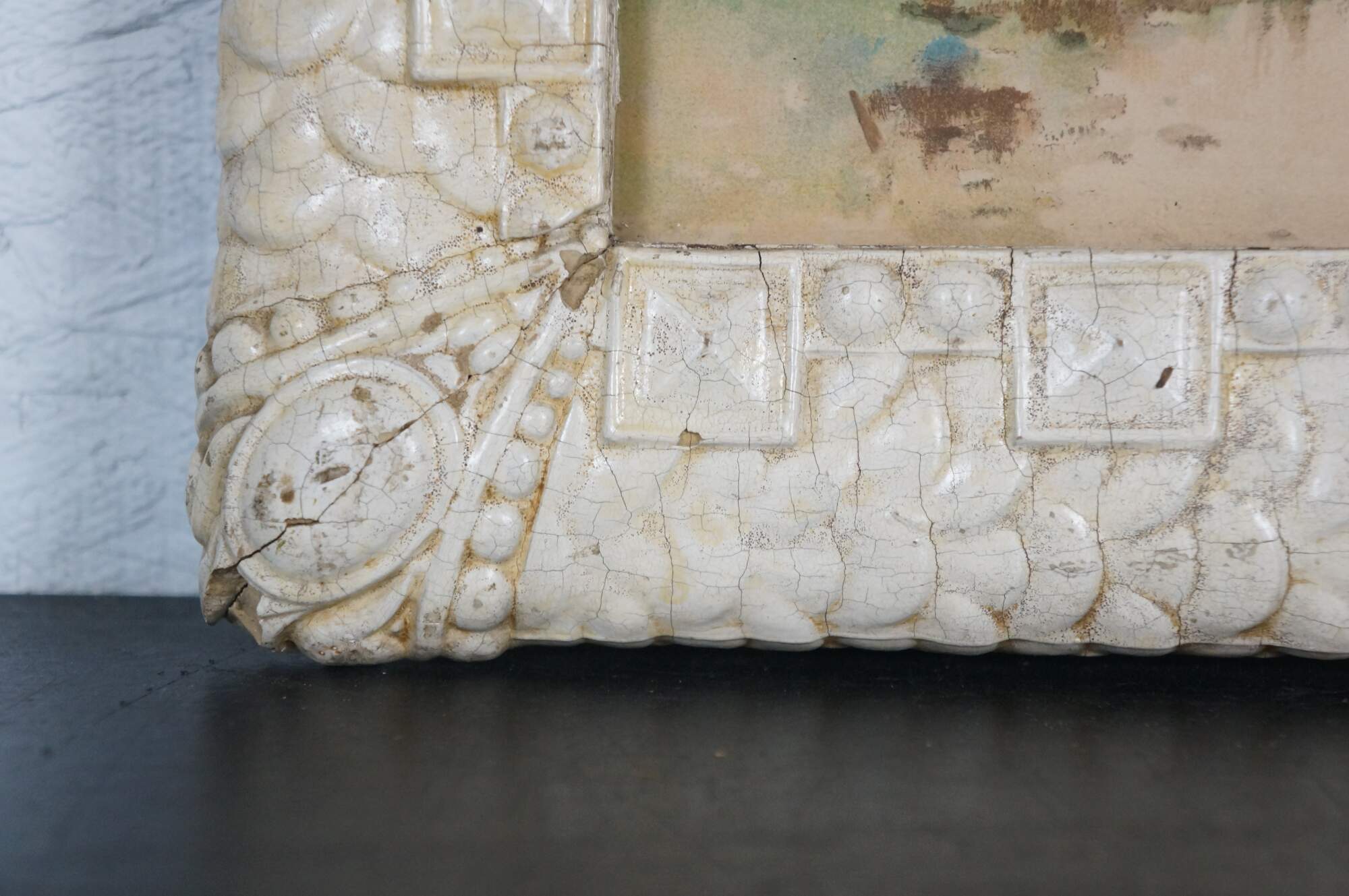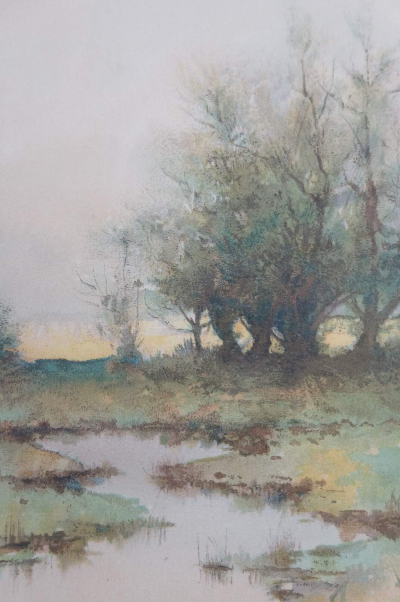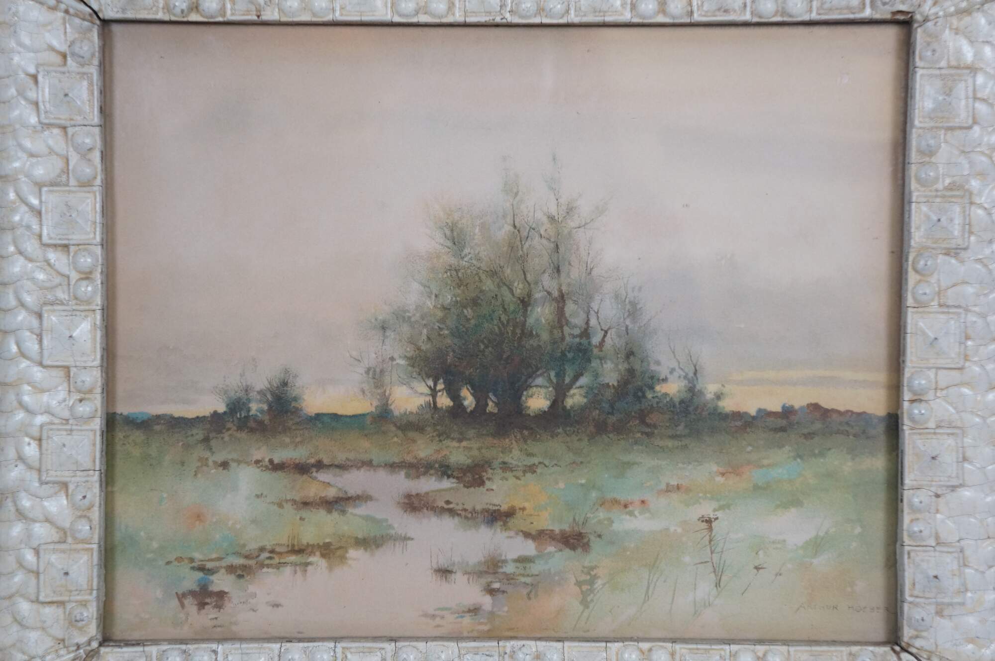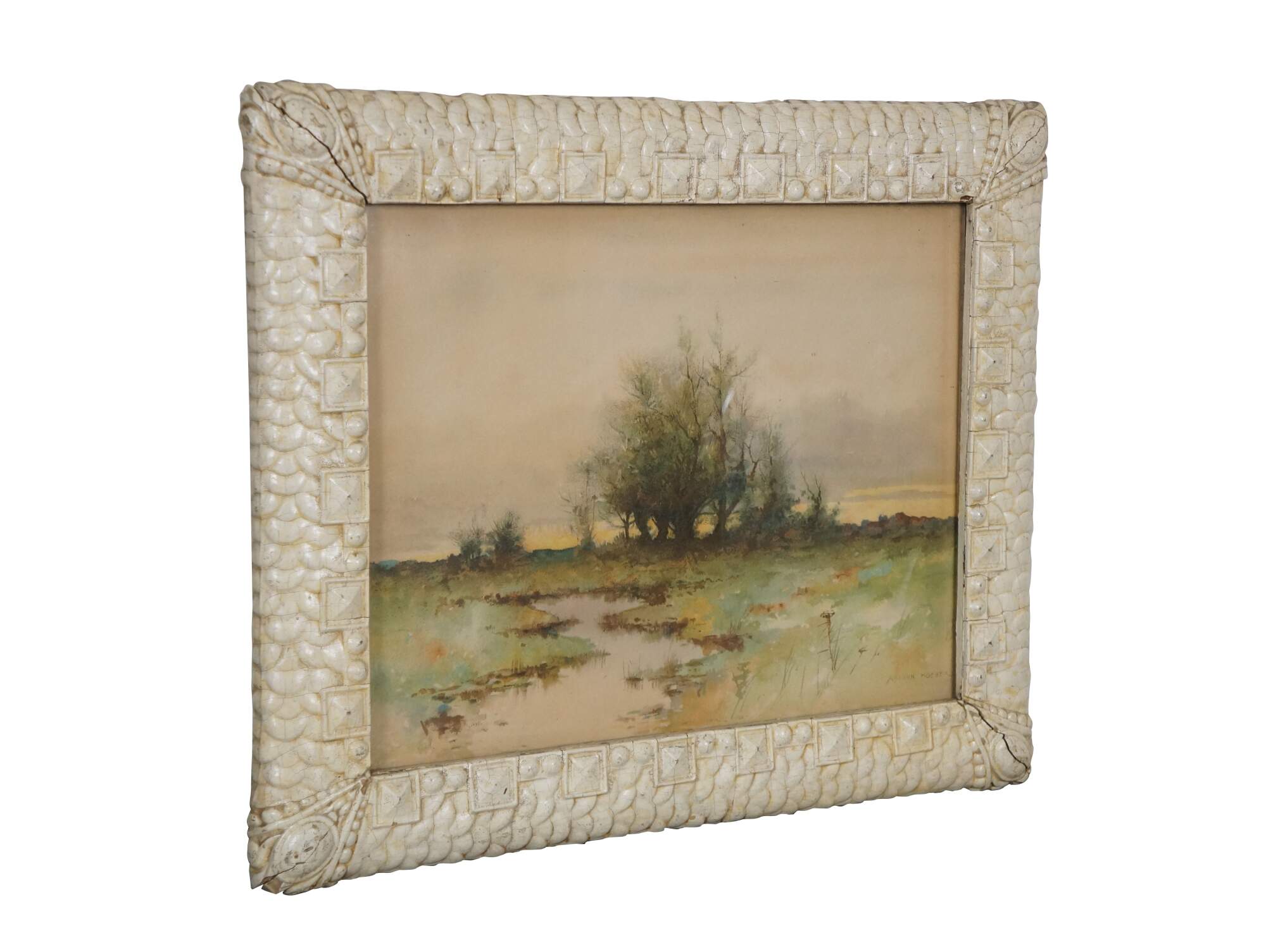 Late 19th to early 20th century color print after a watercolor painting by Arthur hoeber. Depicts a country landscape featuring a creek by a stand of trees. Signed in plate, lower right. White painted wood and gesso frame featuring a design of dense foliage studded with stones; no mat.