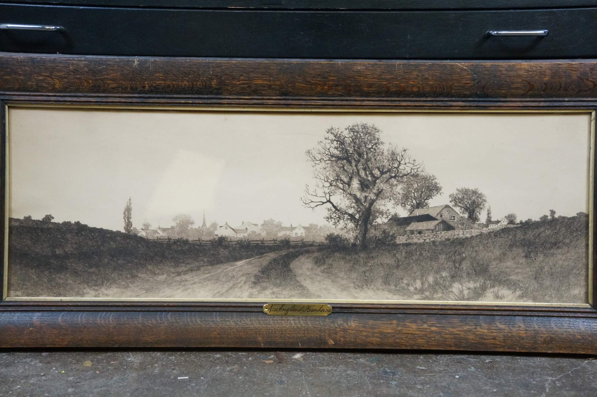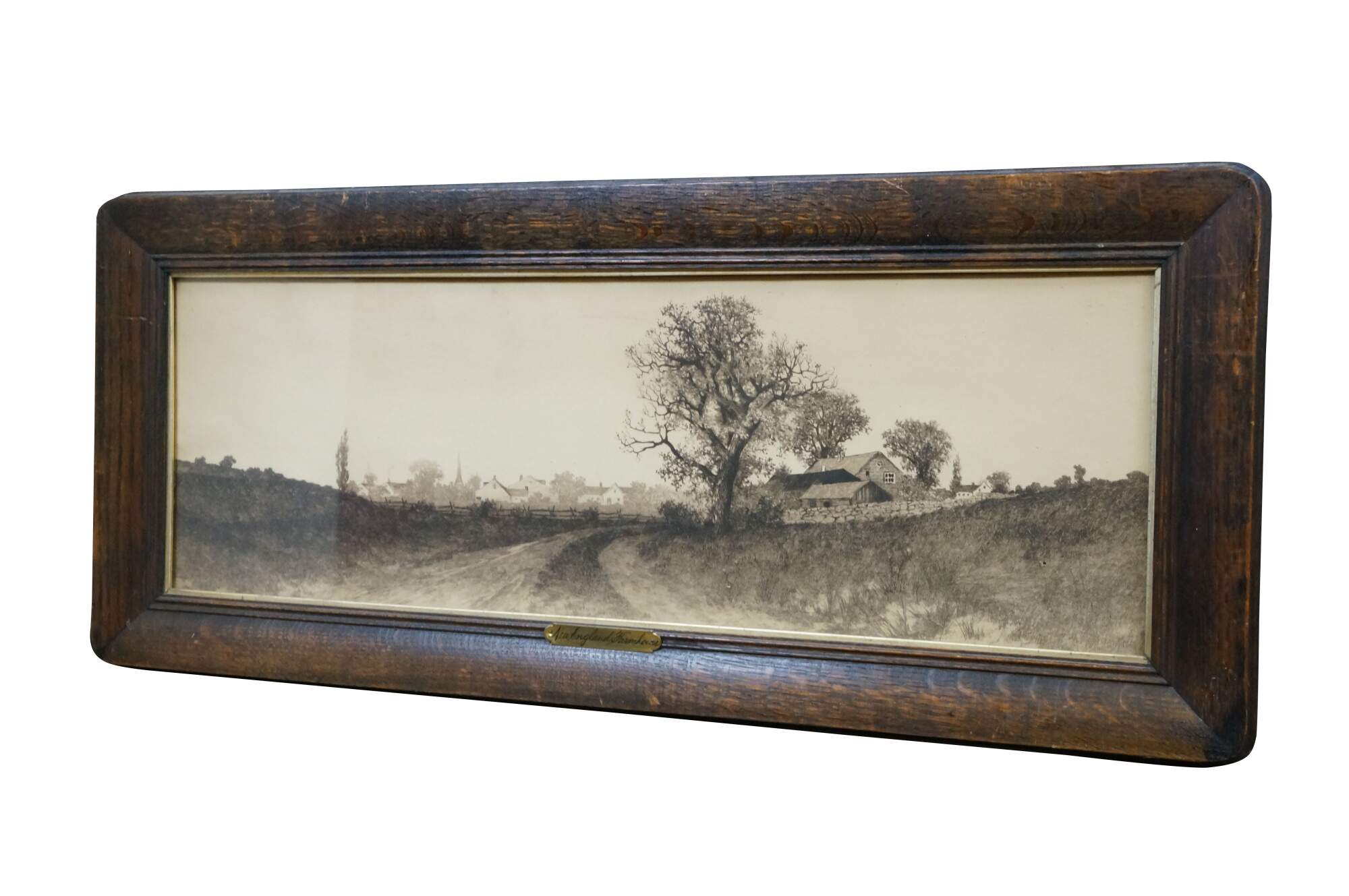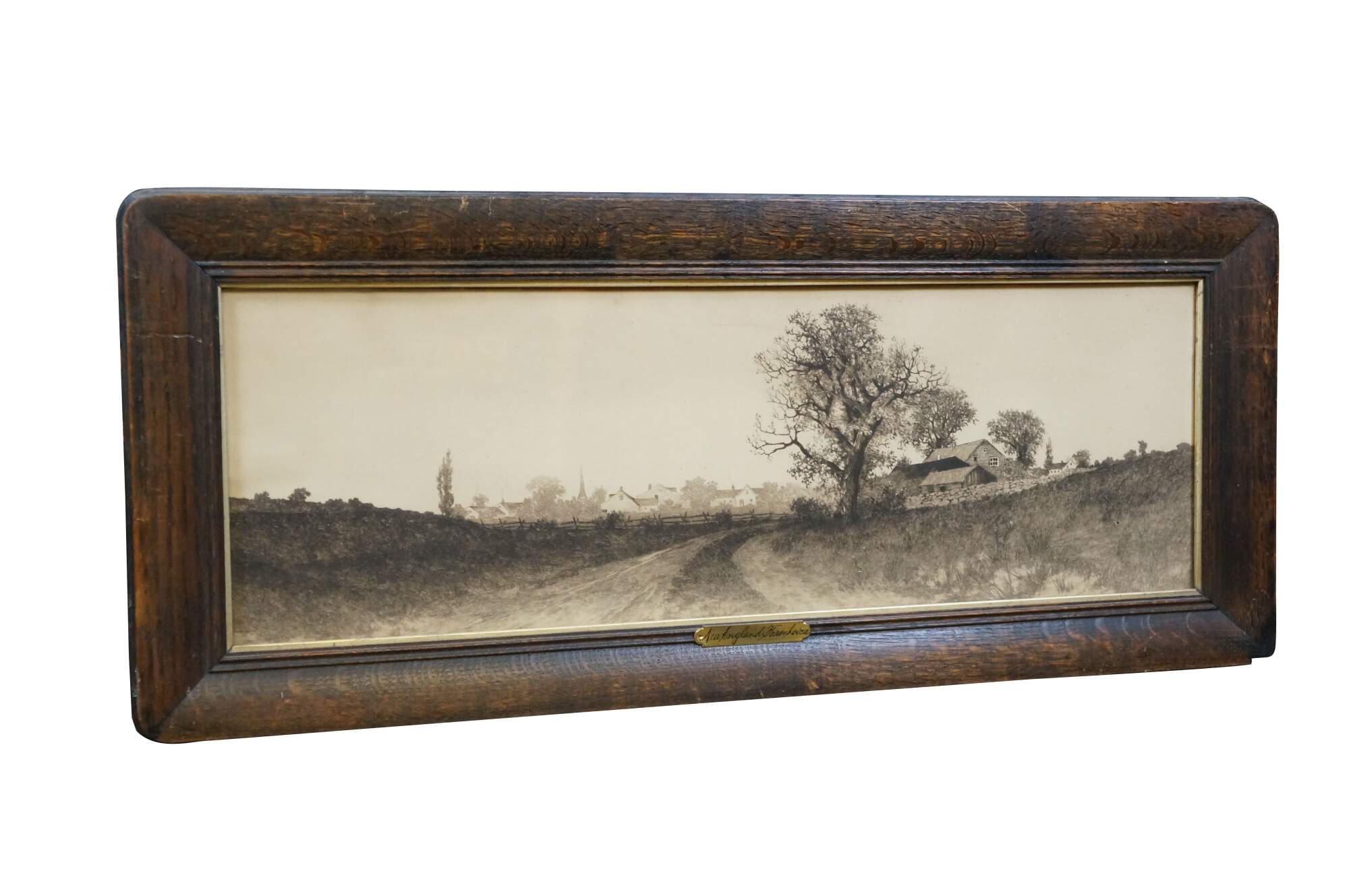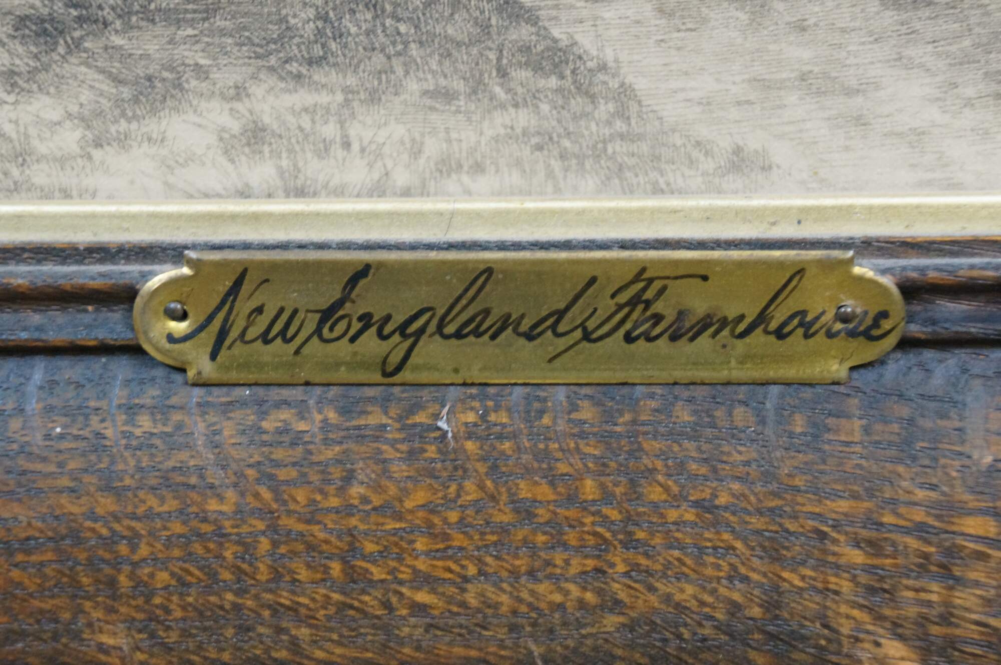Late 19th century black and white etching titled "New England Farmhouse" by Ernest Christian Rost. Panoramic landscape of a country road curving past a stone farmhouse, with a village in the distance. Beveled quartersawn oak frame with brass title plate; no mat.