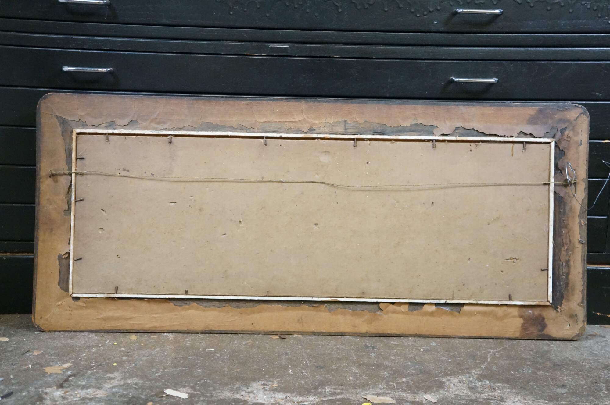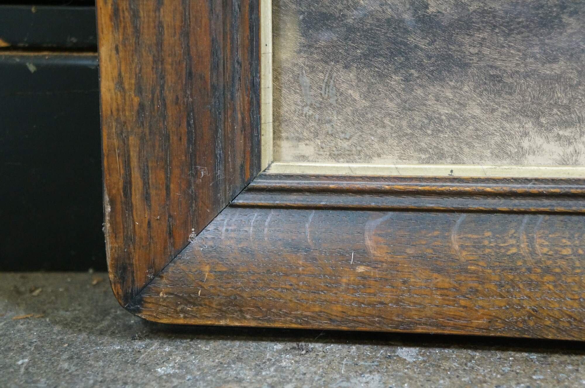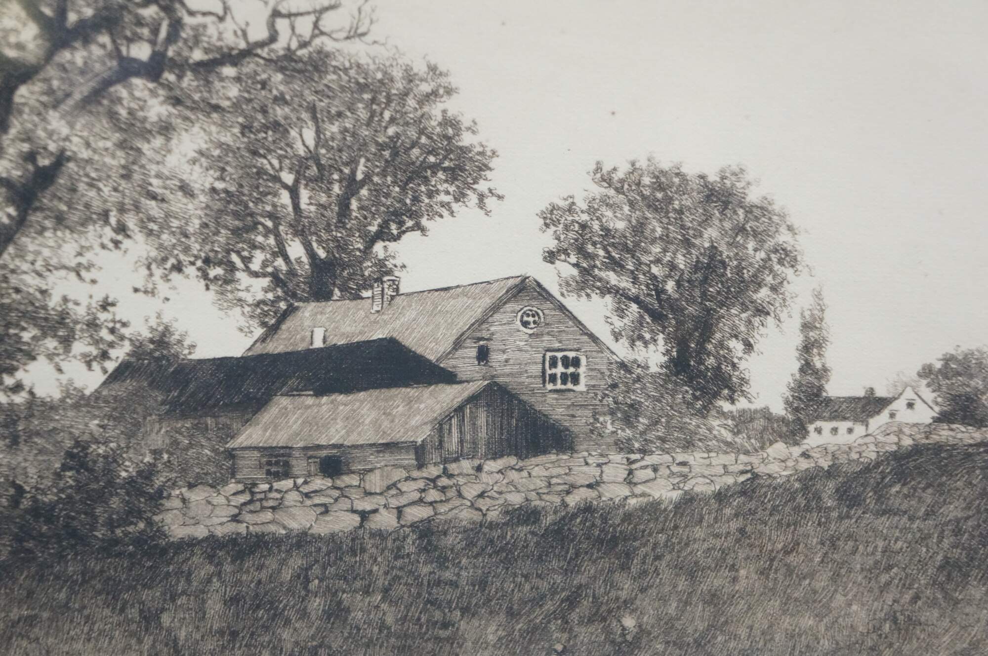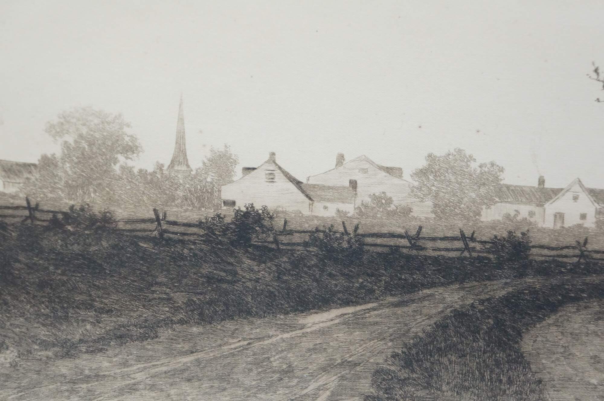Late 19th century black and white etching titled "New England Farmhouse" by Ernest Christian Rost. Panoramic landscape of a country road curving past a stone farmhouse, with a village in the distance. Beveled quartersawn oak frame with brass title plate; no mat.
