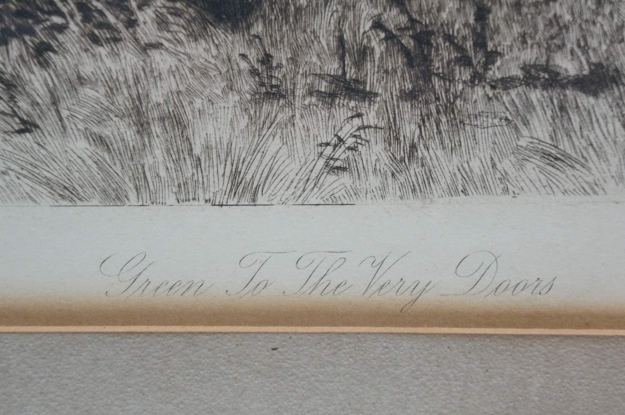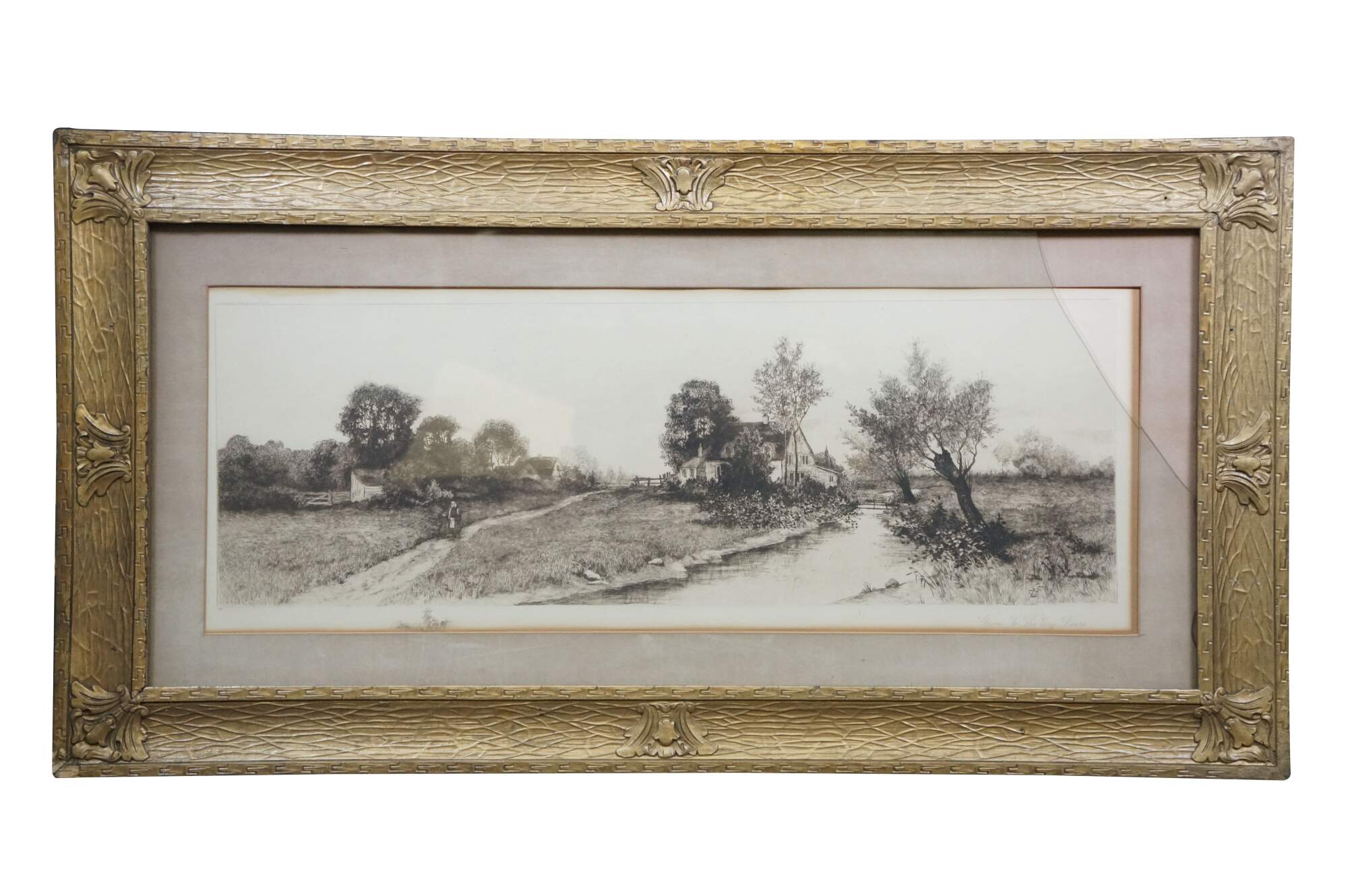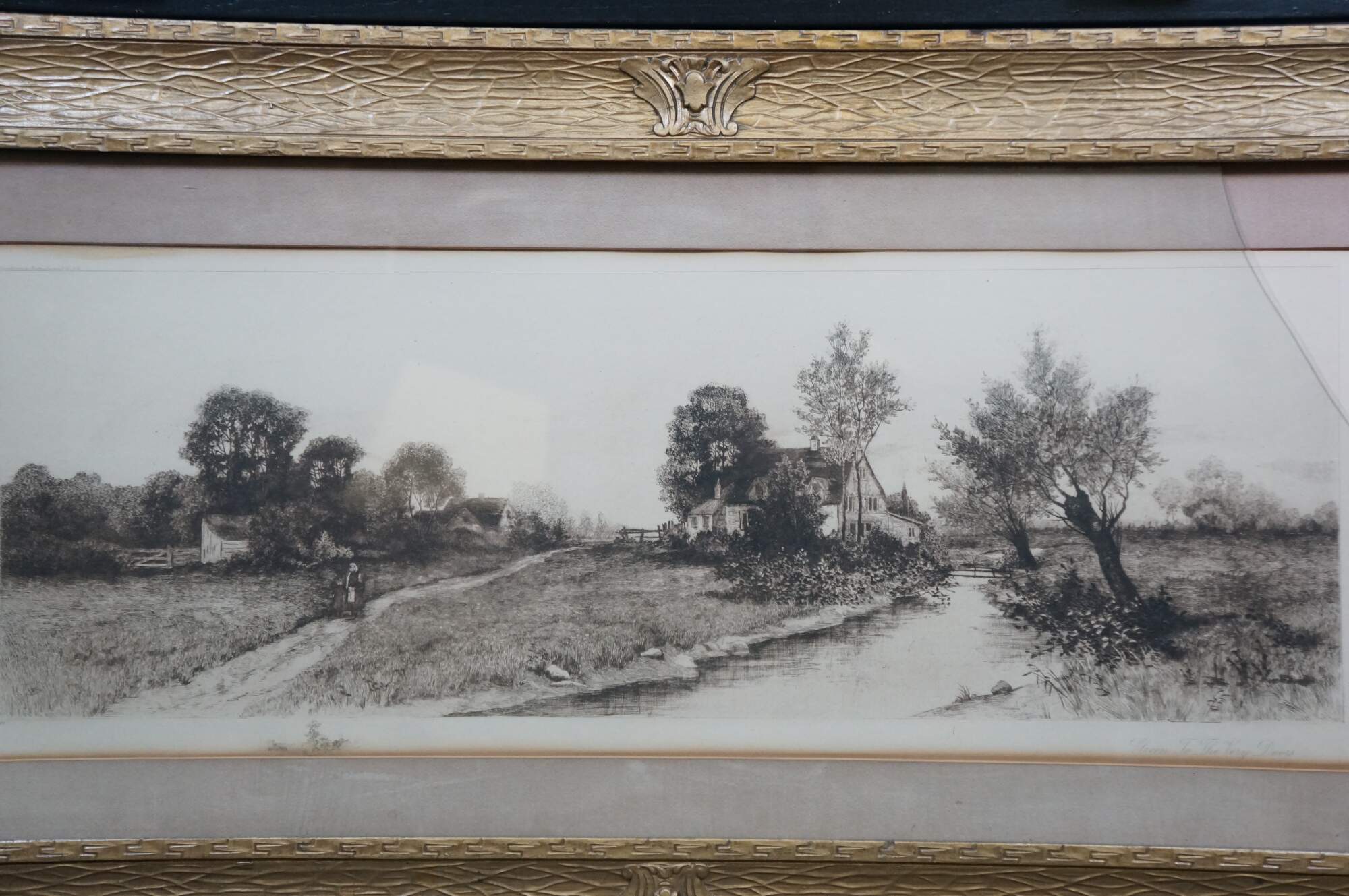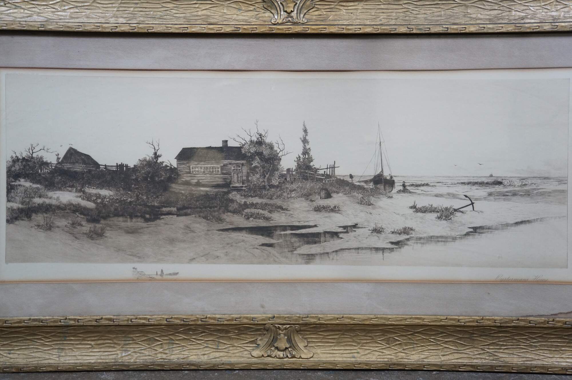 Pair of late 19th century black and white etchings by George William Bohde (American, 1870-1939). One titled "Green to the Very Doors" (printed, lower edge). A panoramic country landscape showing a pair of figures walking down a road, near a house at the edge of a small river. Remarke of a landscape, lower edge. Numbered 202, left corner. The other titled "Oystermans Home" (printed, lower edge). Numbered 201, left corner. Both Copyrighted 1891 by Radtke, Lauckner & Co, NY. Carved gilt wood frames with acanthus leaf corners; white mat.