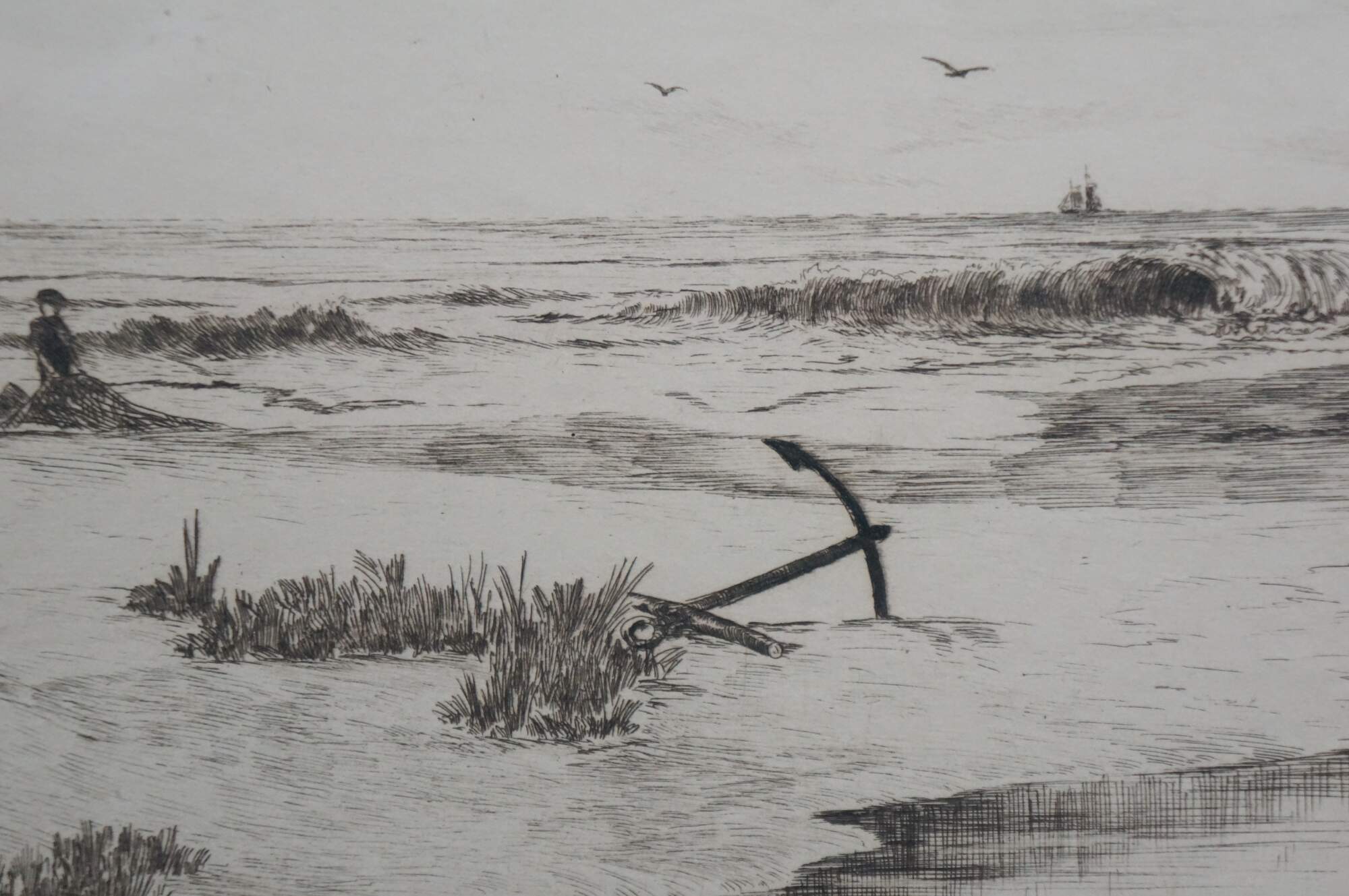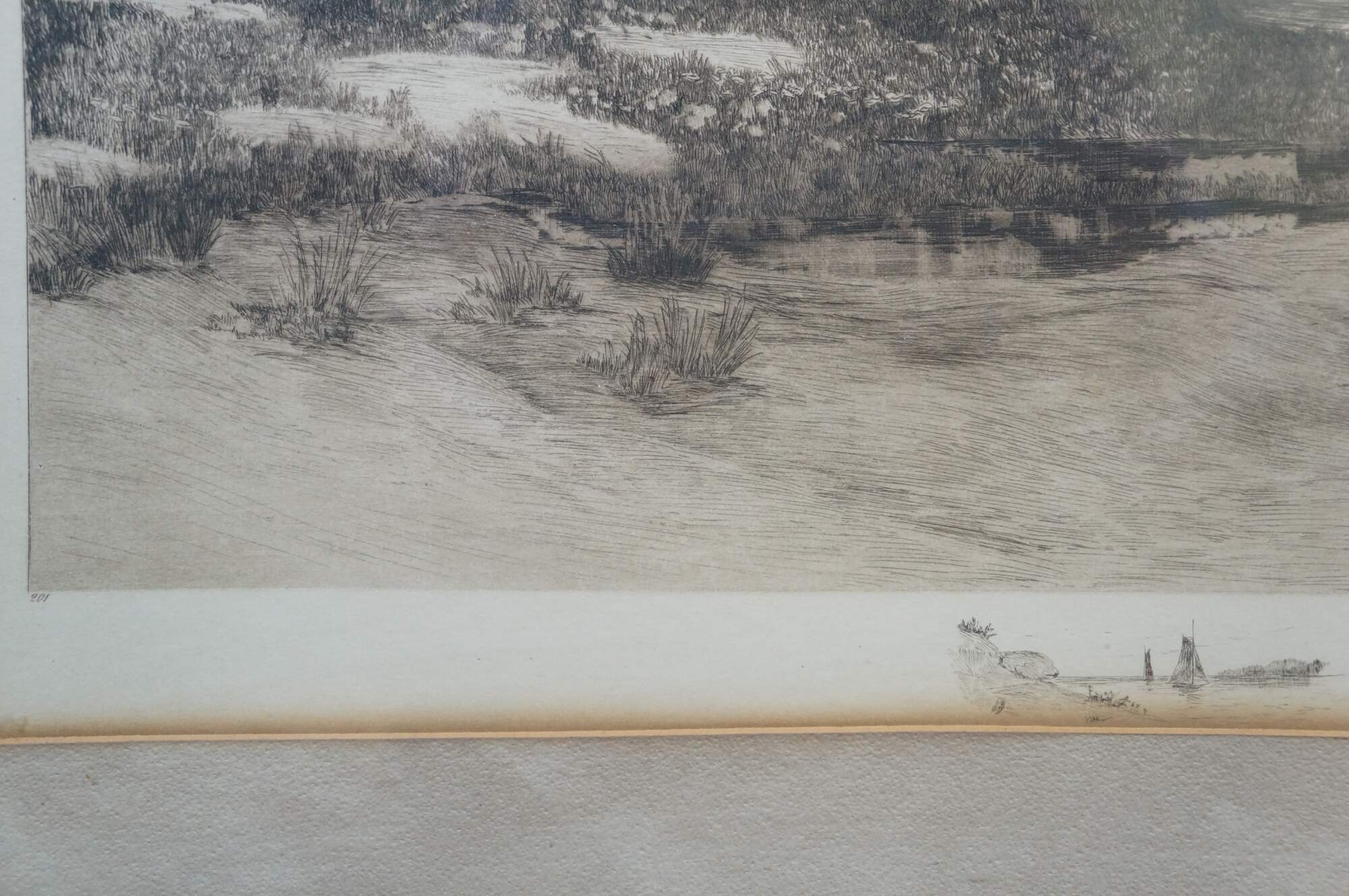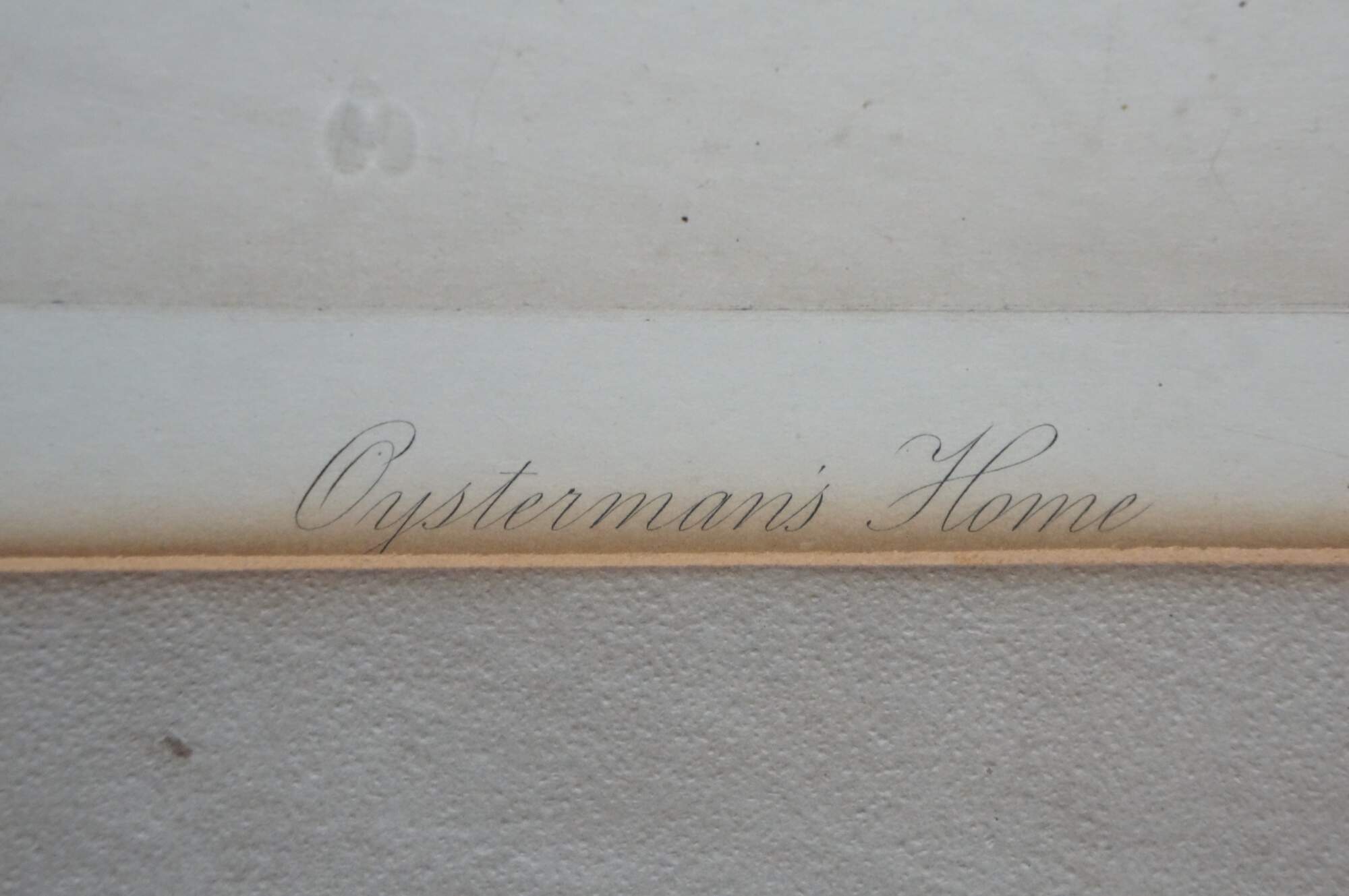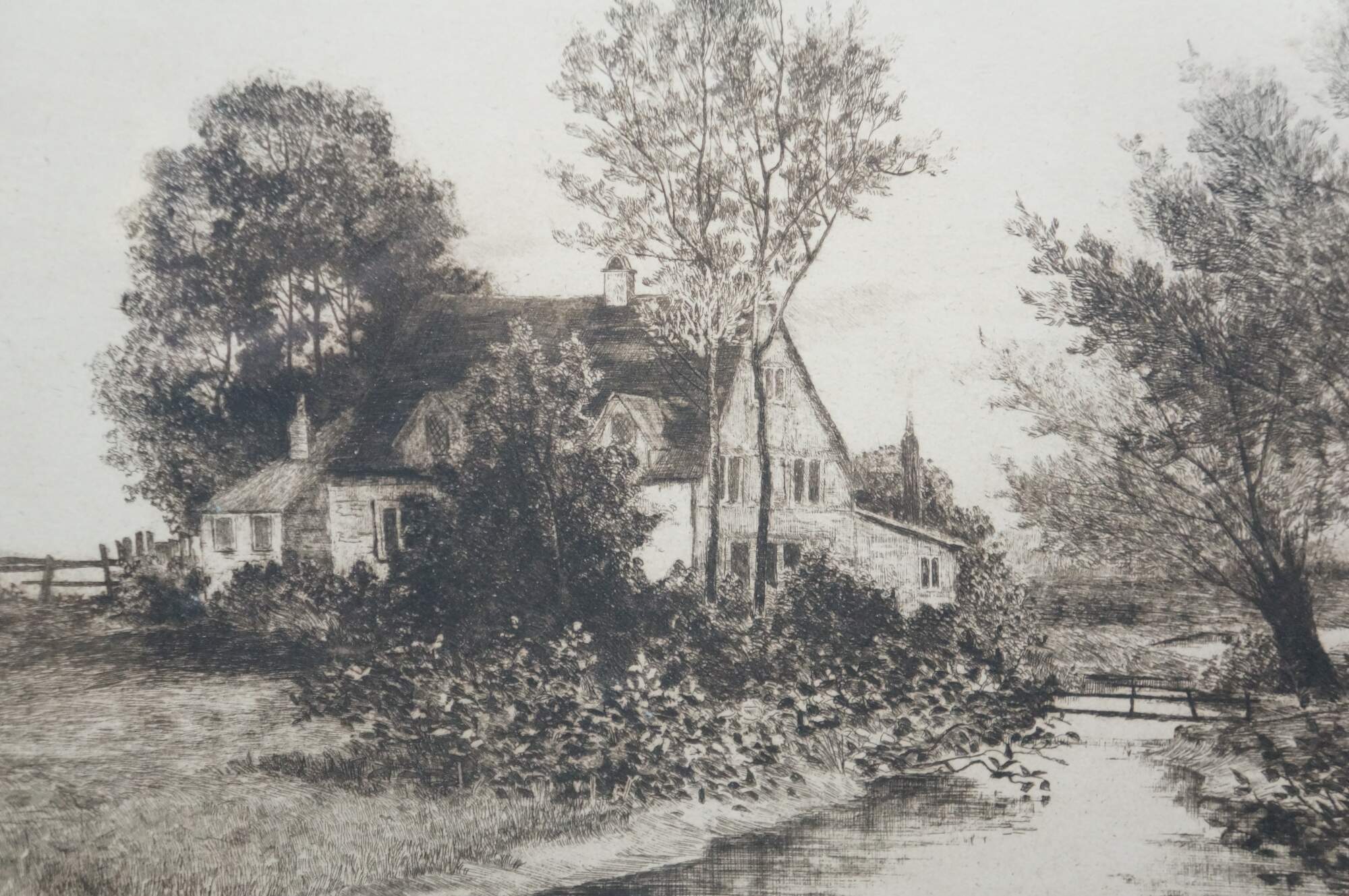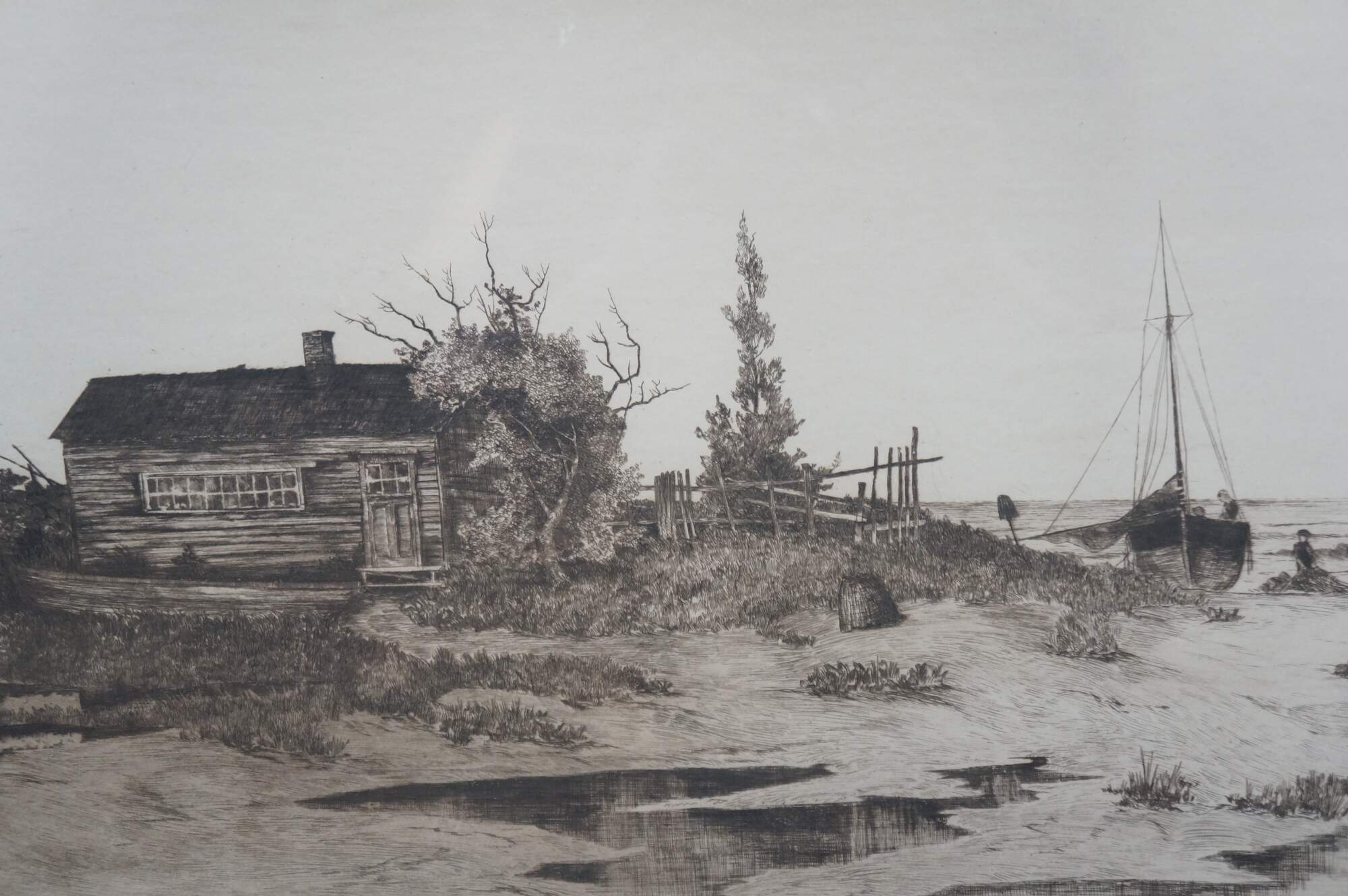 Pair of late 19th century black and white etchings by George William Bohde (American, 1870-1939). One titled "Green to the Very Doors" (printed, lower edge). A panoramic country landscape showing a pair of figures walking down a road, near a house at the edge of a small river. Remarke of a landscape, lower edge. Numbered 202, left corner. The other titled "Oystermans Home" (printed, lower edge). Numbered 201, left corner. Both Copyrighted 1891 by Radtke, Lauckner & Co, NY. Carved gilt wood frames with acanthus leaf corners; white mat.