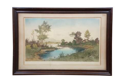 Late 19th century hand colored etching titled "In the Cove" by George William Bohde (American, 1870-1939). Bright country riverscape showing a small boat in an inlet near a pair of red roofed cottages. Published by Fishel, Adler & Schwartz, New York. Signed in plate GW Bohde 1892. Title and "Etched by George Bohde printed, lower right. Beveled wood frame; white mat.