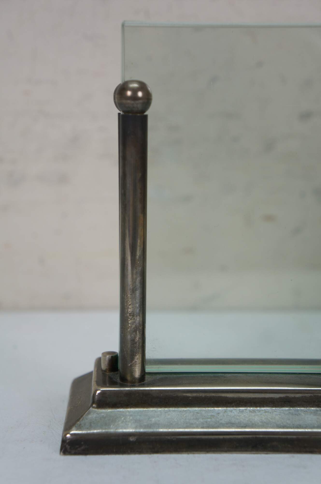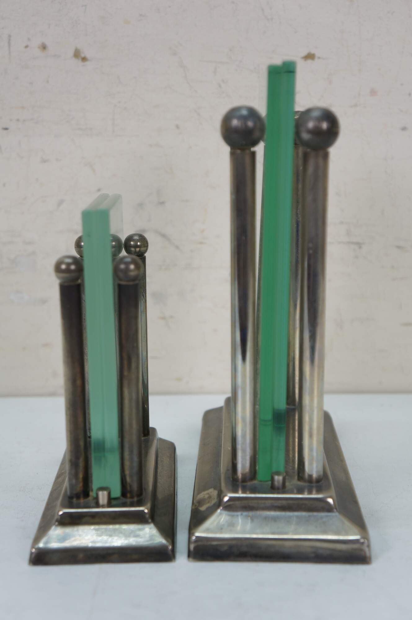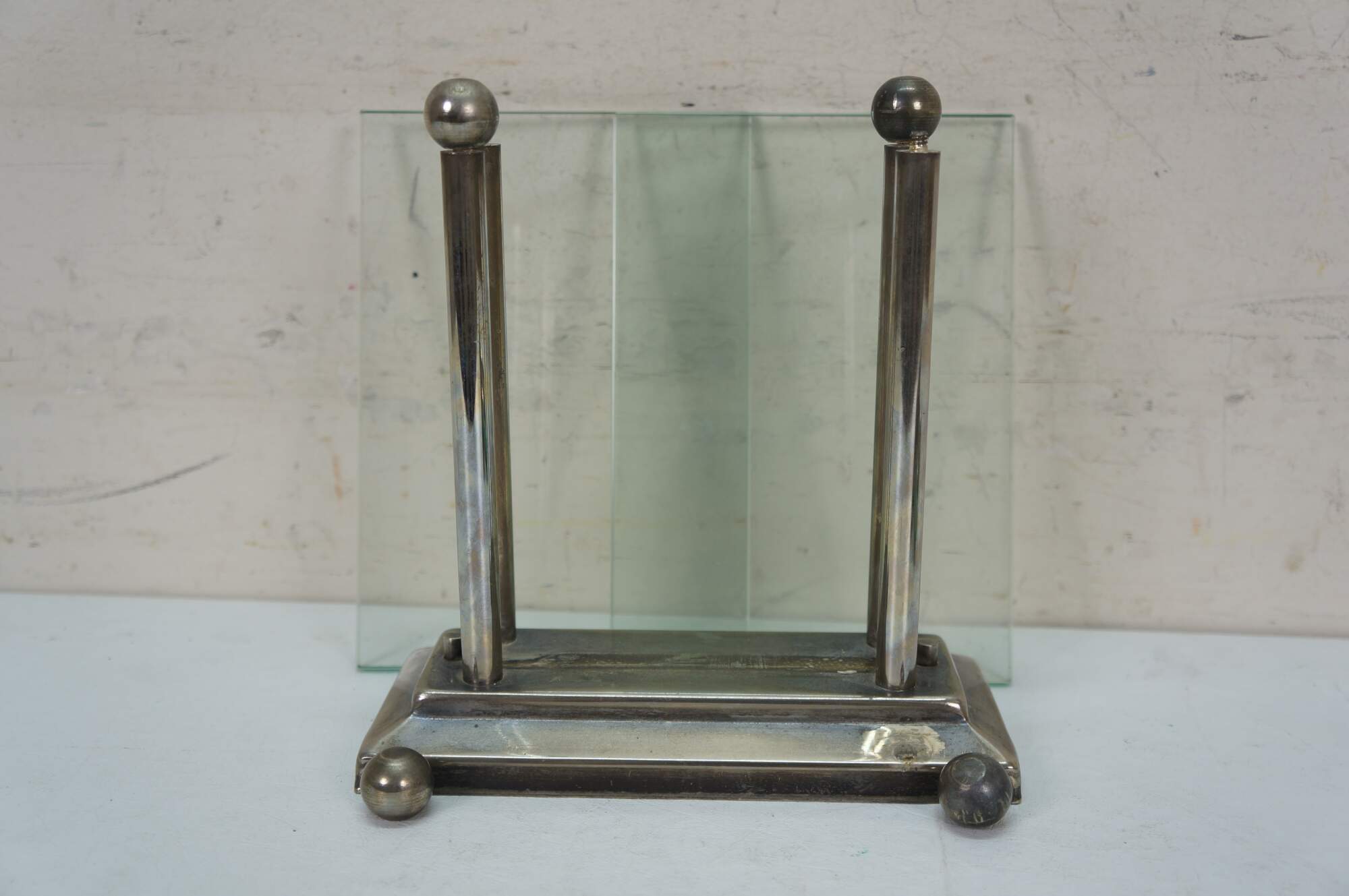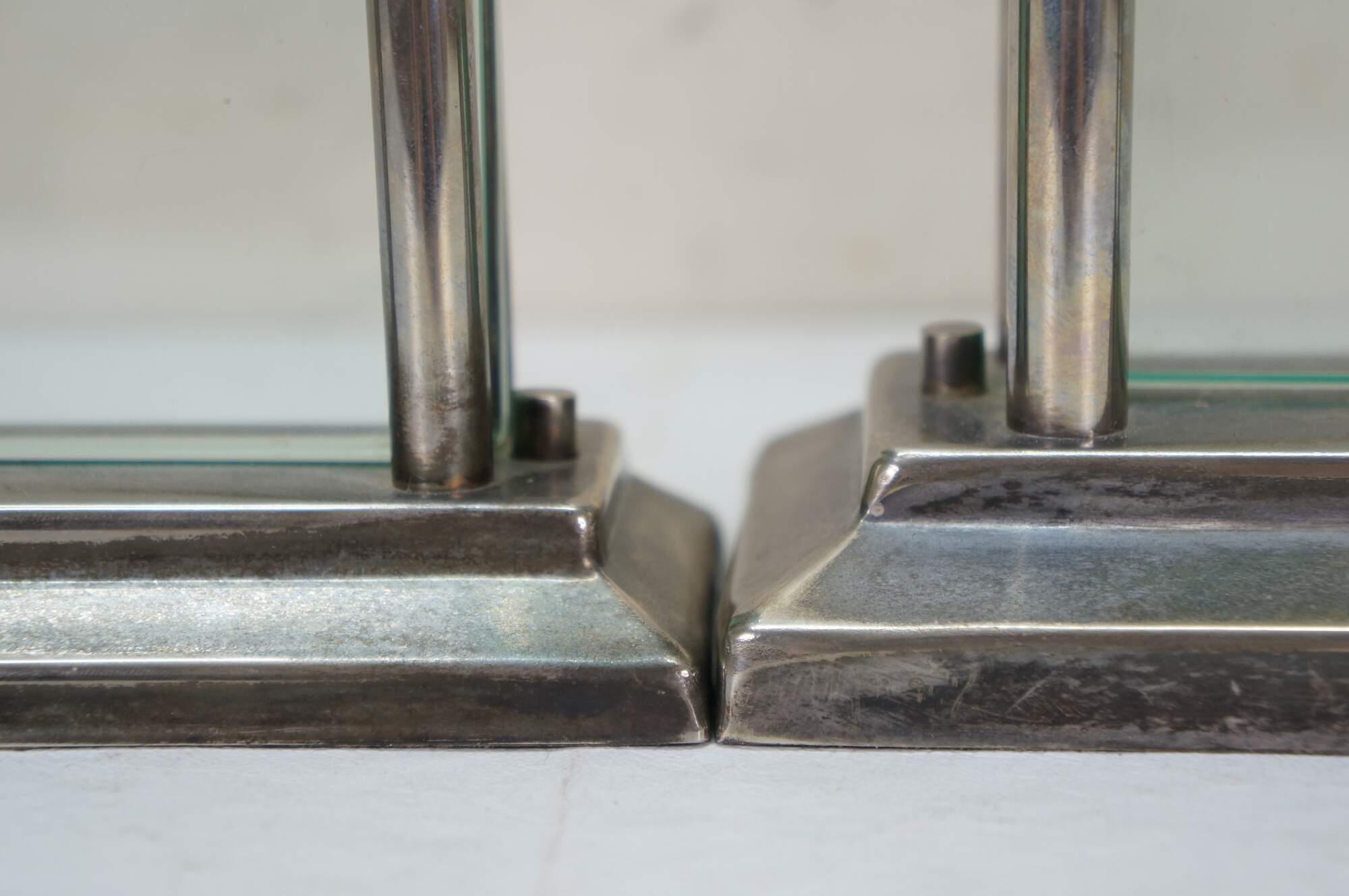 Pair of vintage art deco / mid century modern floating picture frames. Photos are pressed between two panels of tempered glass, supported by four silverplate columns topped with orbs, on rectangular pedestal bases.