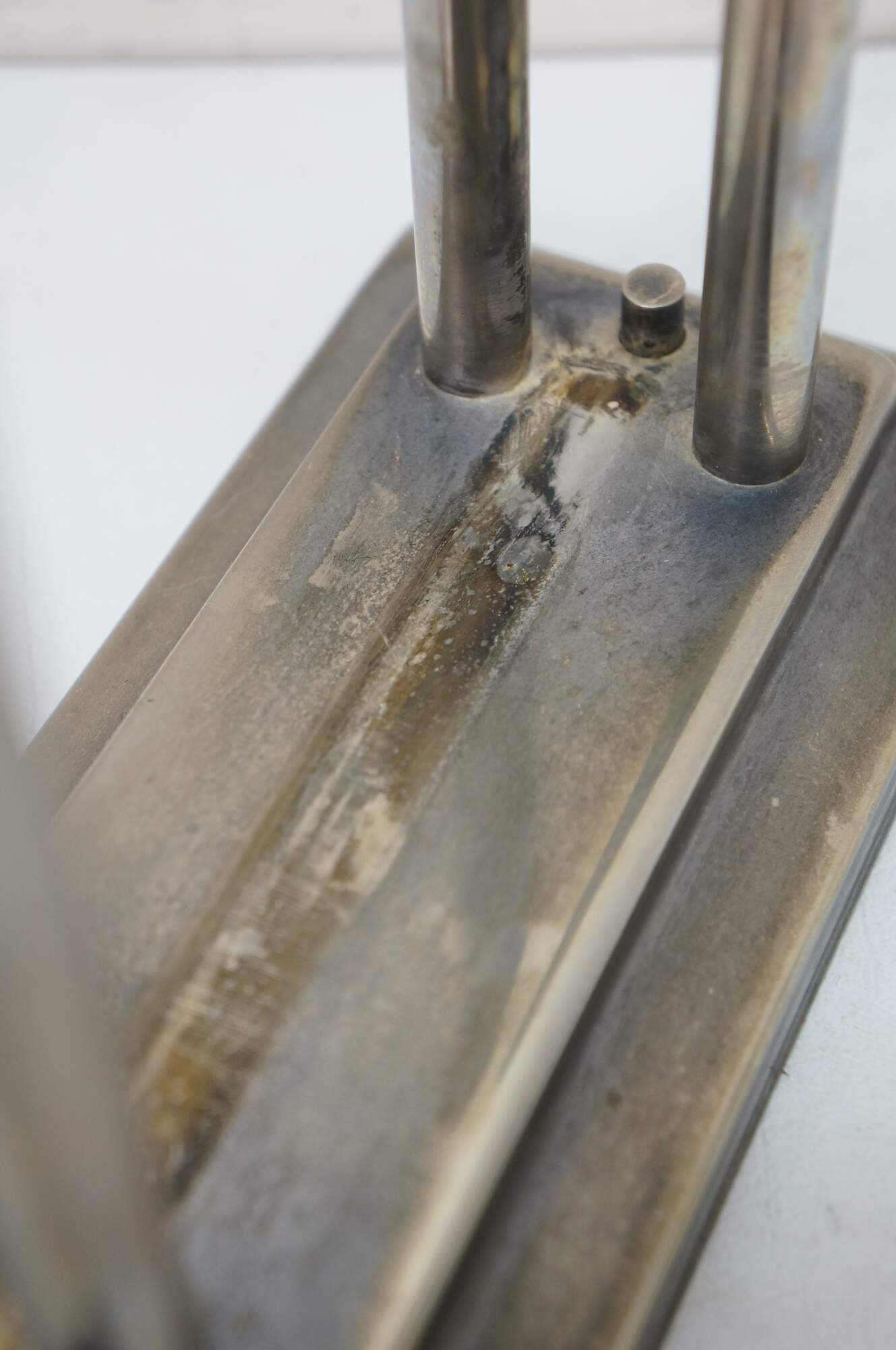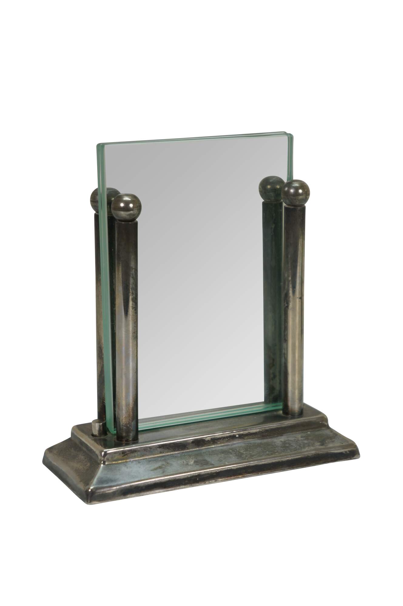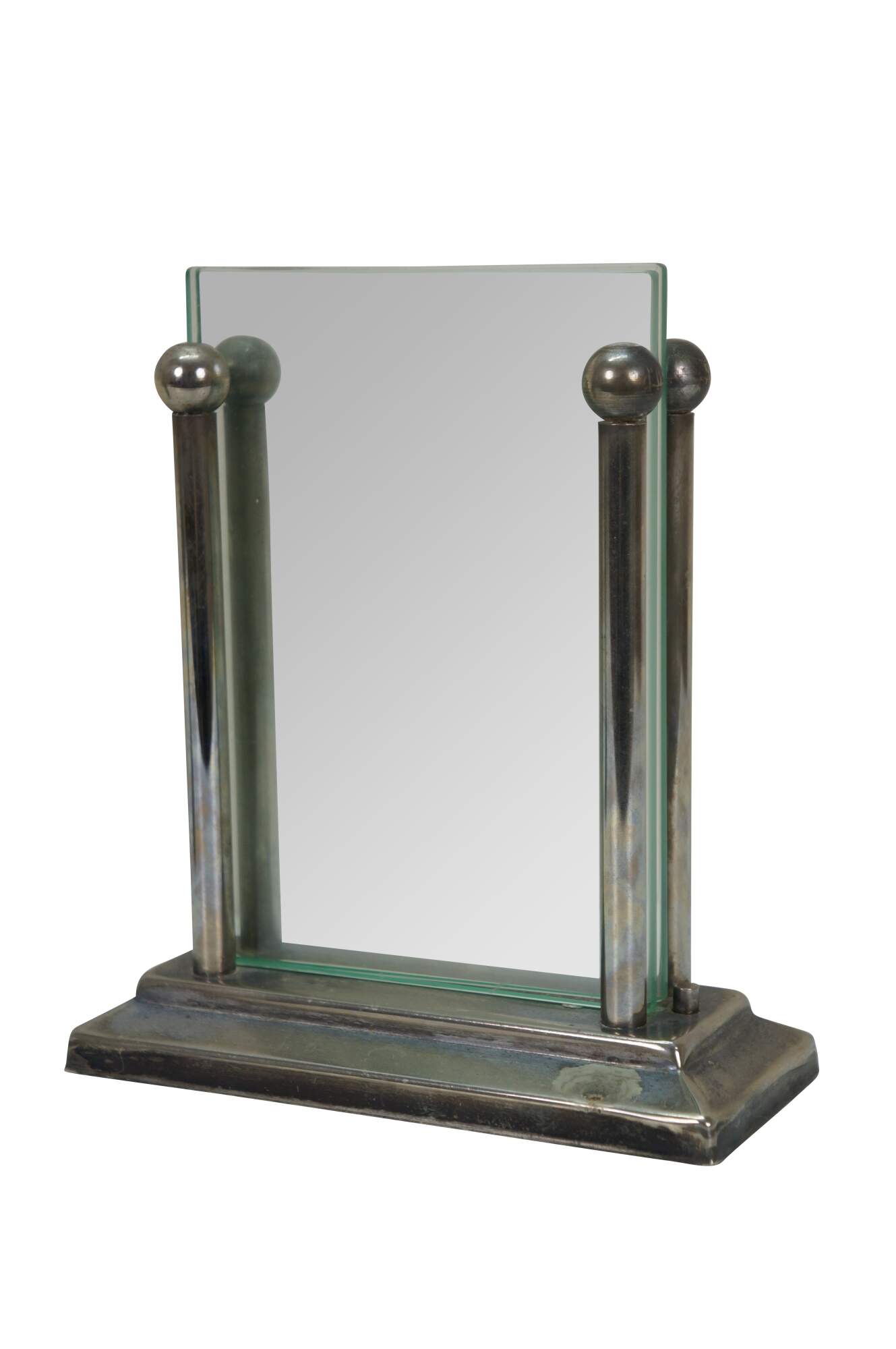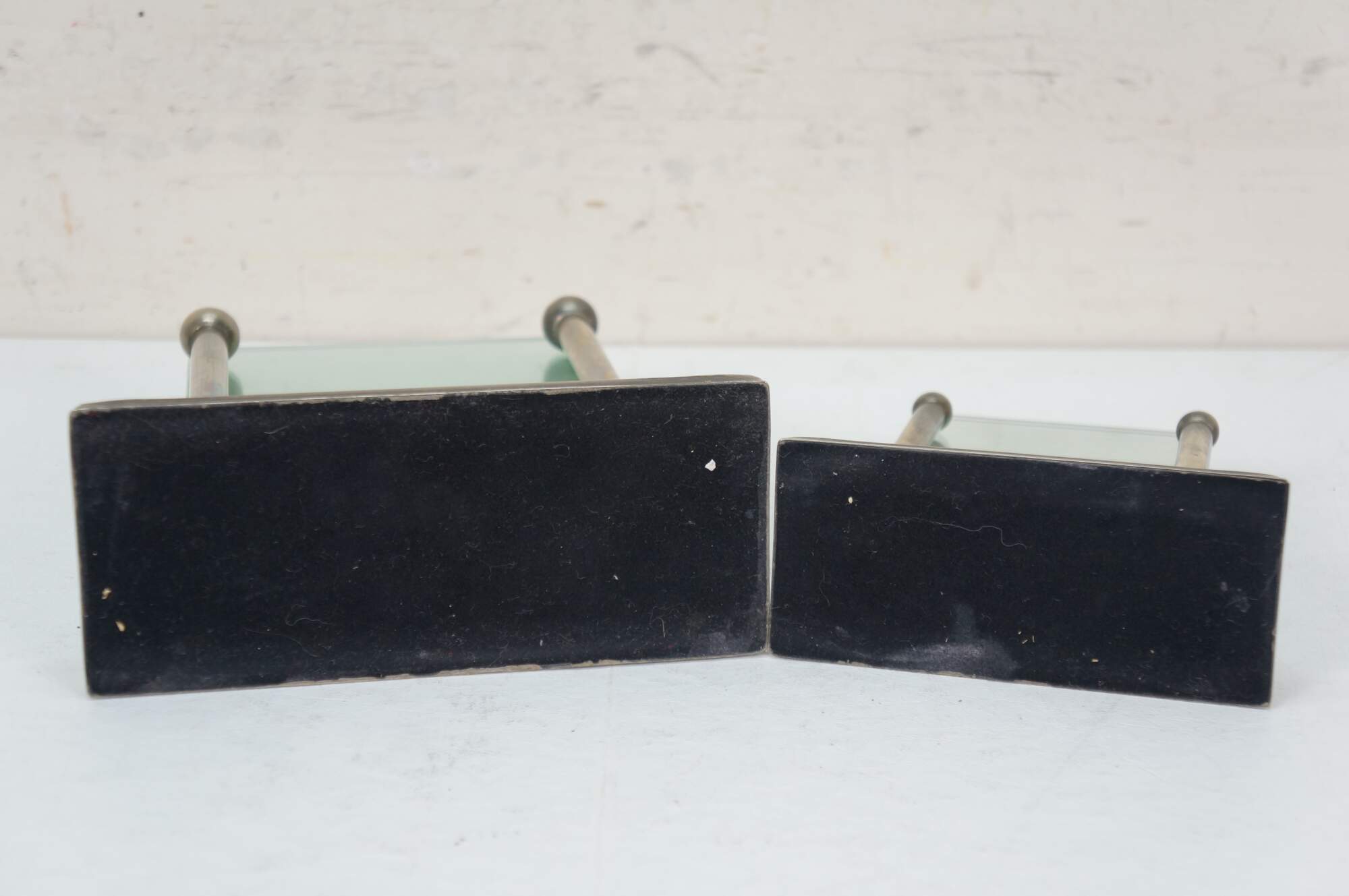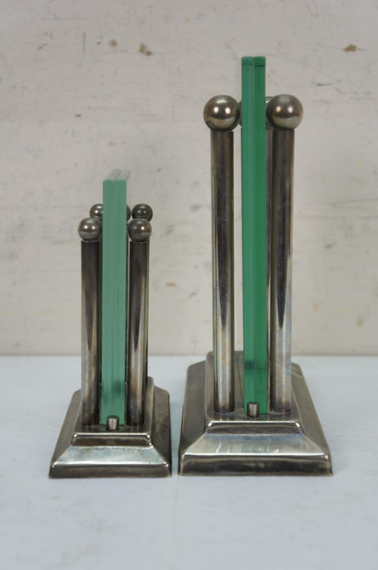 Pair of vintage art deco / mid century modern floating picture frames. Photos are pressed between two panels of tempered glass, supported by four silverplate columns topped with orbs, on rectangular pedestal bases.