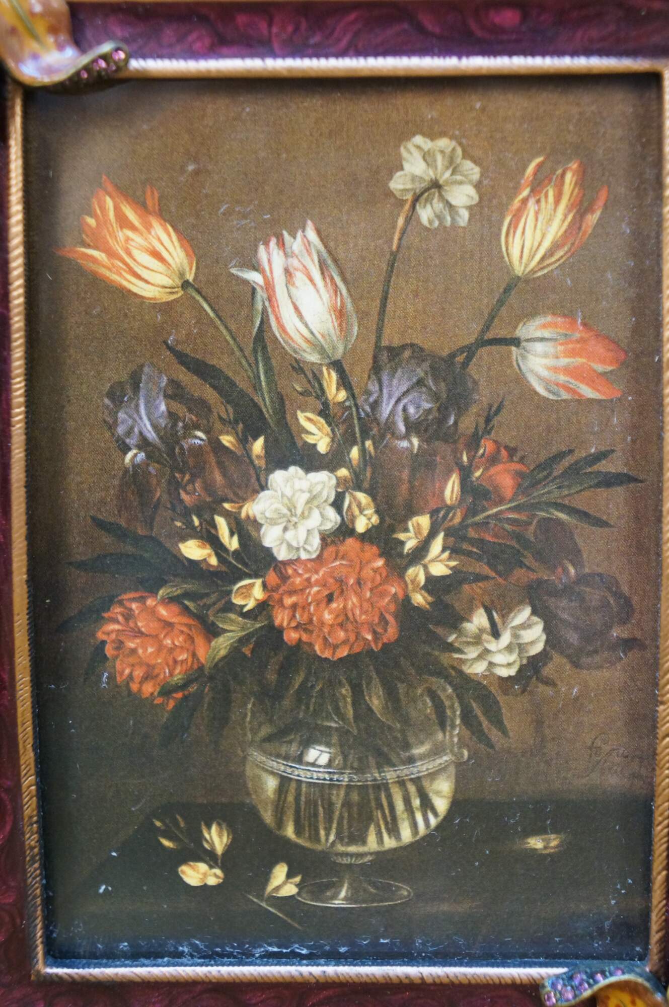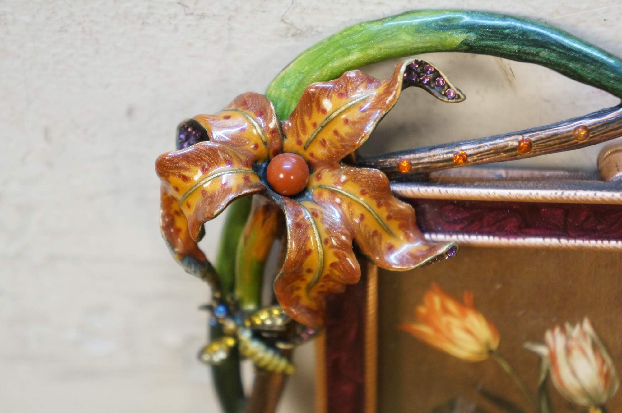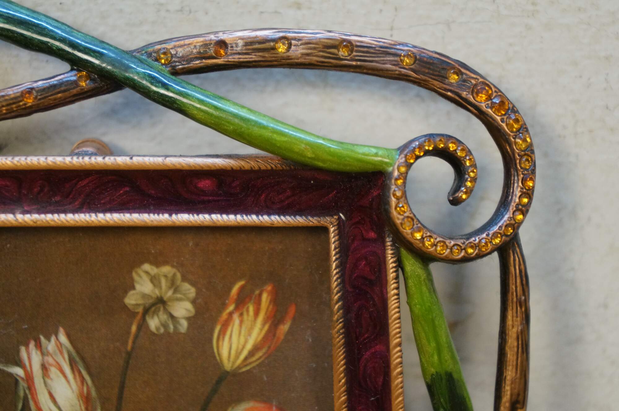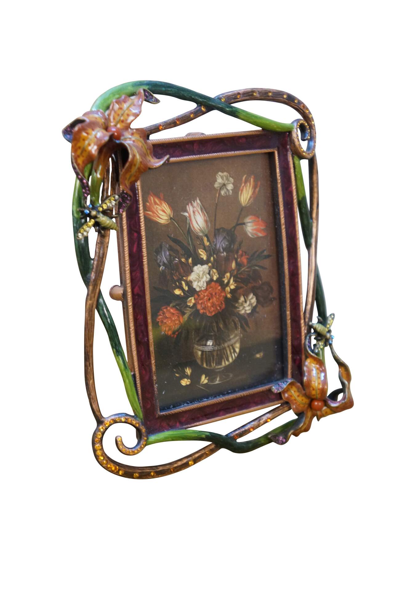 Jay Strongwater enameled brass picture frame and miniature floral print. Rectangular frame trimmed with swirling vines and enameled tiger lily blossom and bee studded with blue and gold crystals at each corner. Enameled easel style back; support also decorated with an enameled flower.