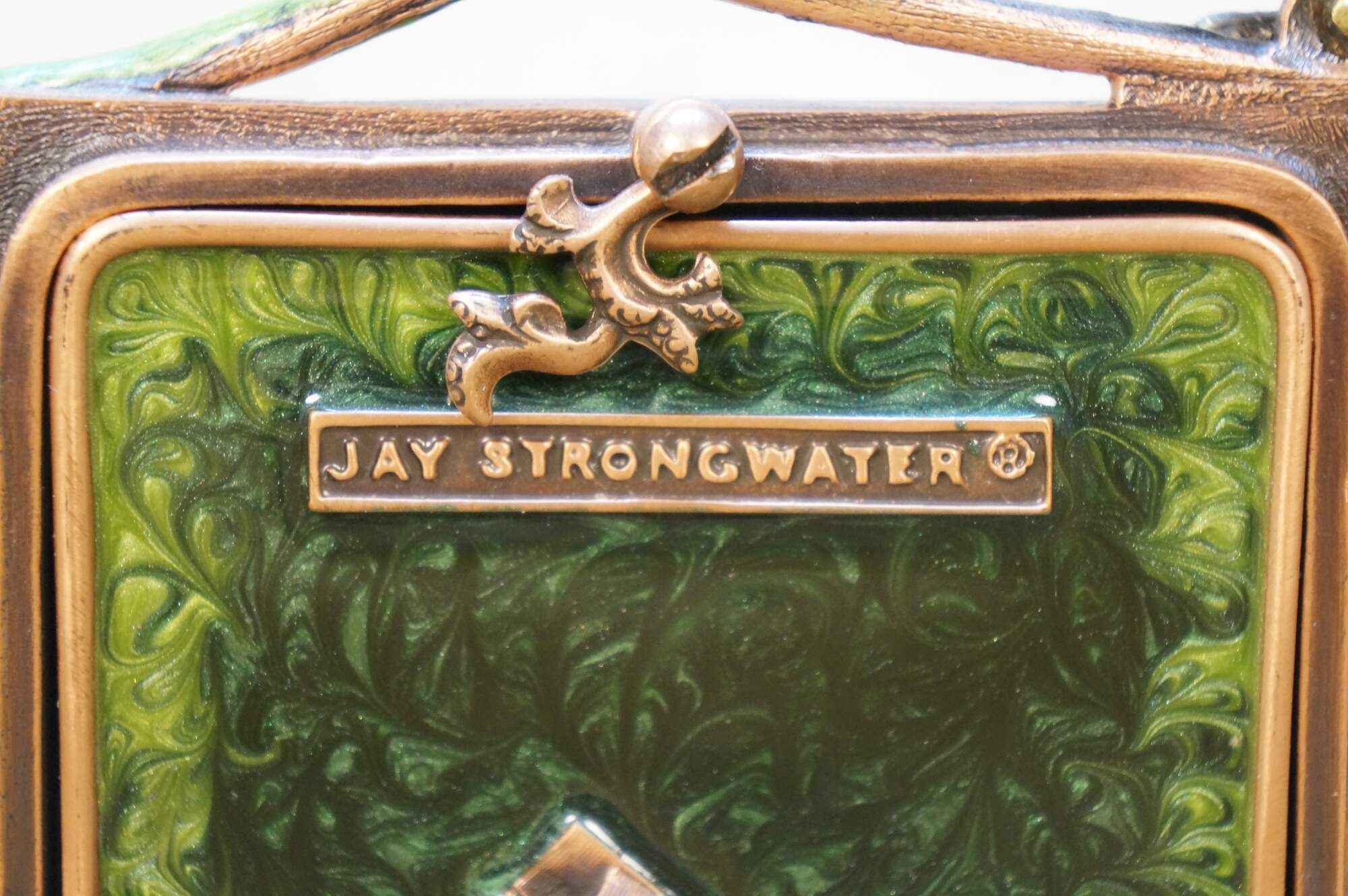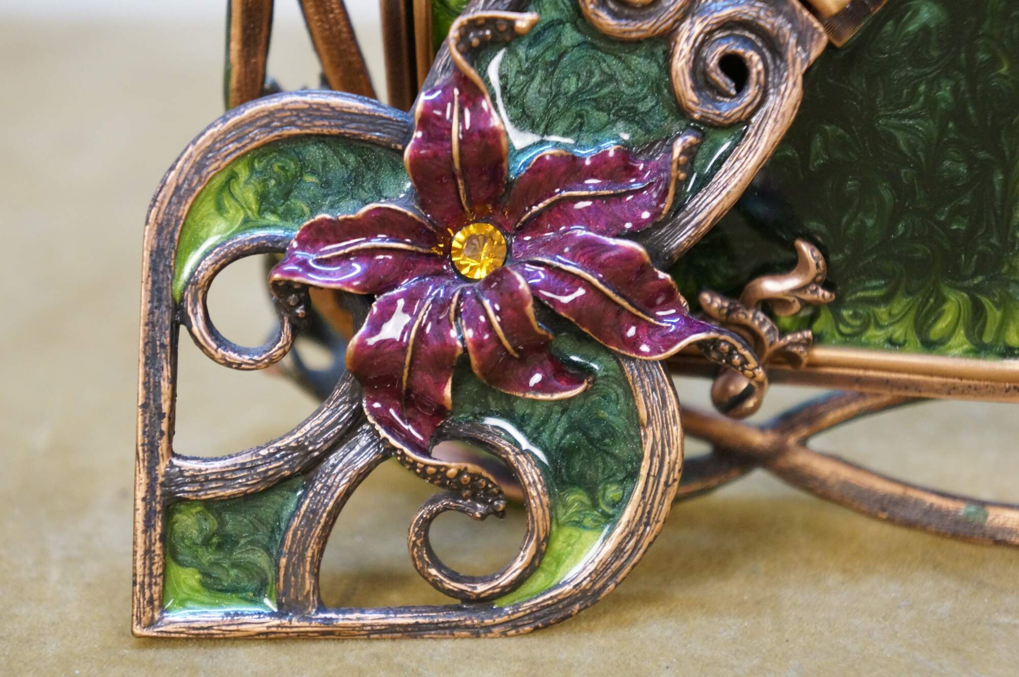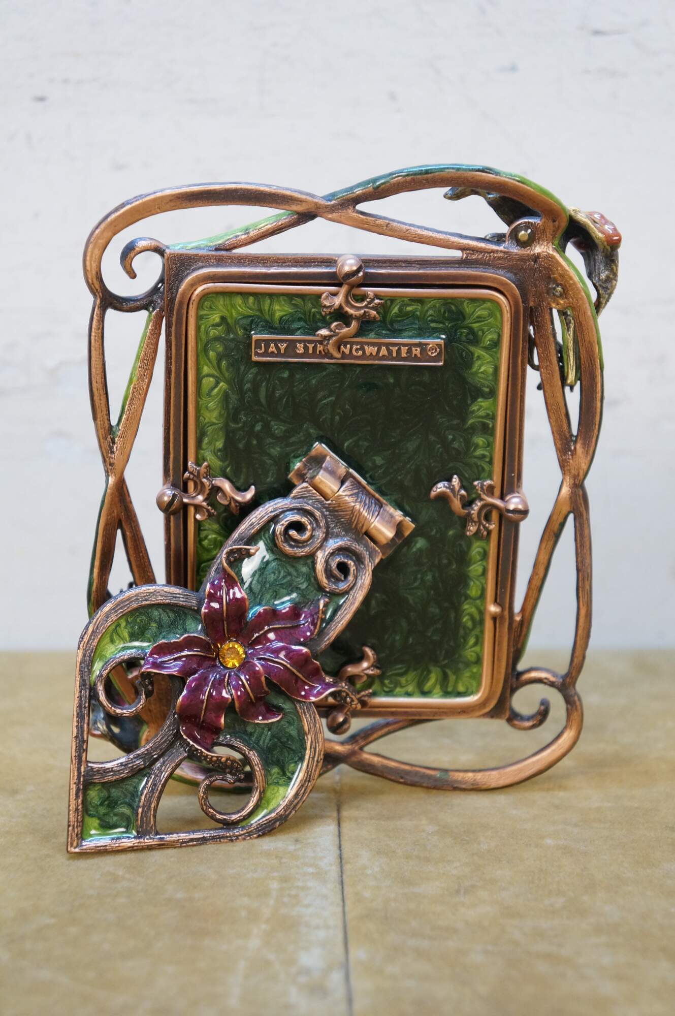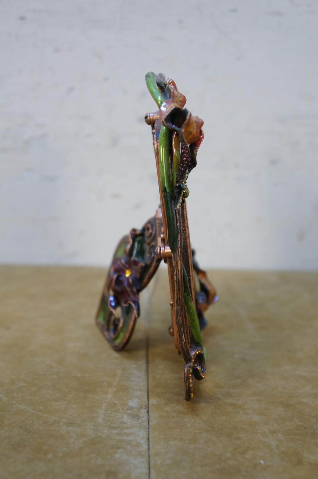 Jay Strongwater enameled brass picture frame and miniature floral print. Rectangular frame trimmed with swirling vines and enameled tiger lily blossom and bee studded with blue and gold crystals at each corner. Enameled easel style back; support also decorated with an enameled flower.