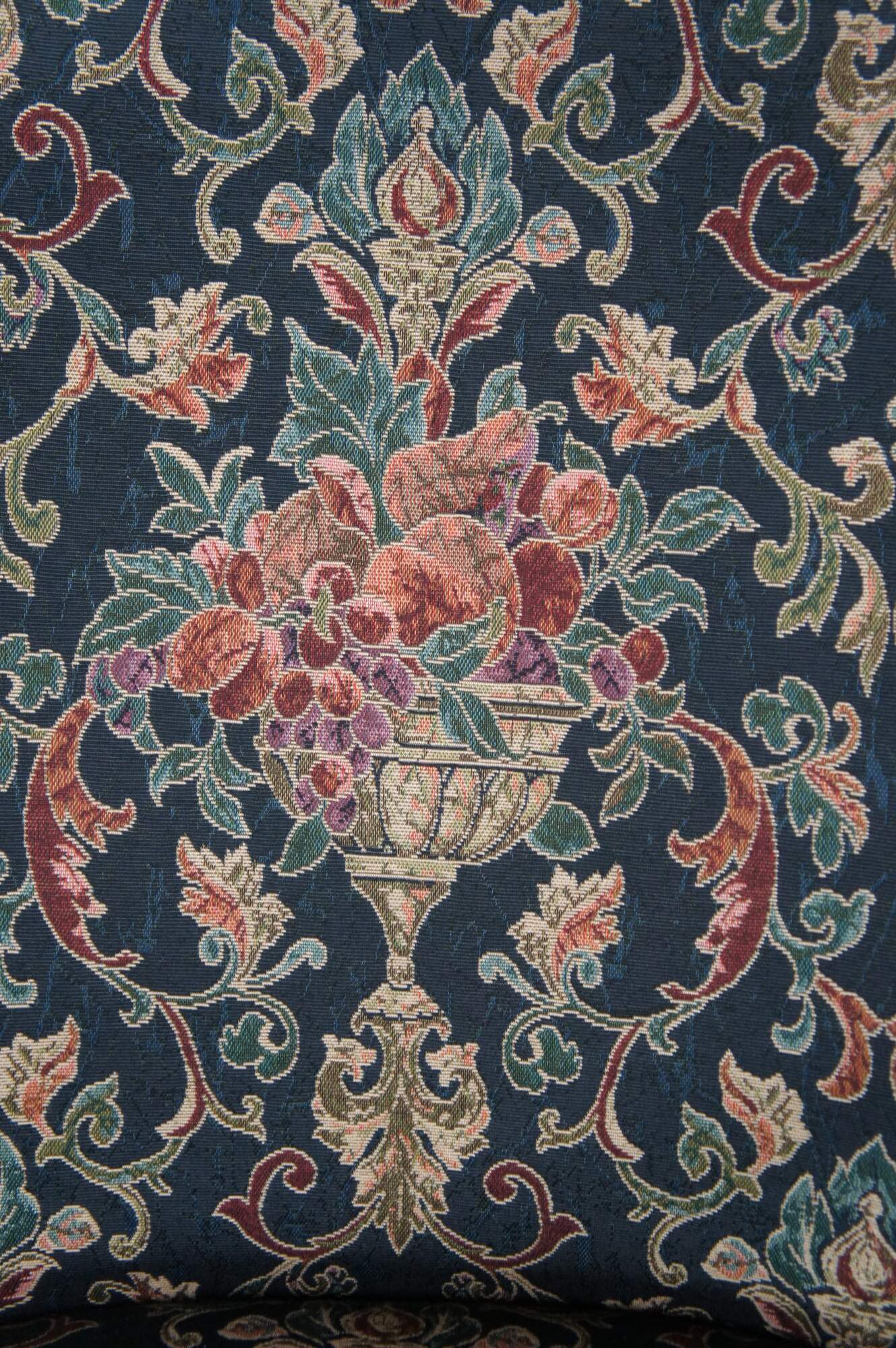 Set of two vintatge club / lounge / dining arm chairs with a traditional / formal skirted upholstery that features a scrolling foliate / acanthus design with Grecian style trophy urns overflowing with fruit, and accented with torchiere lights and fleur de lis.