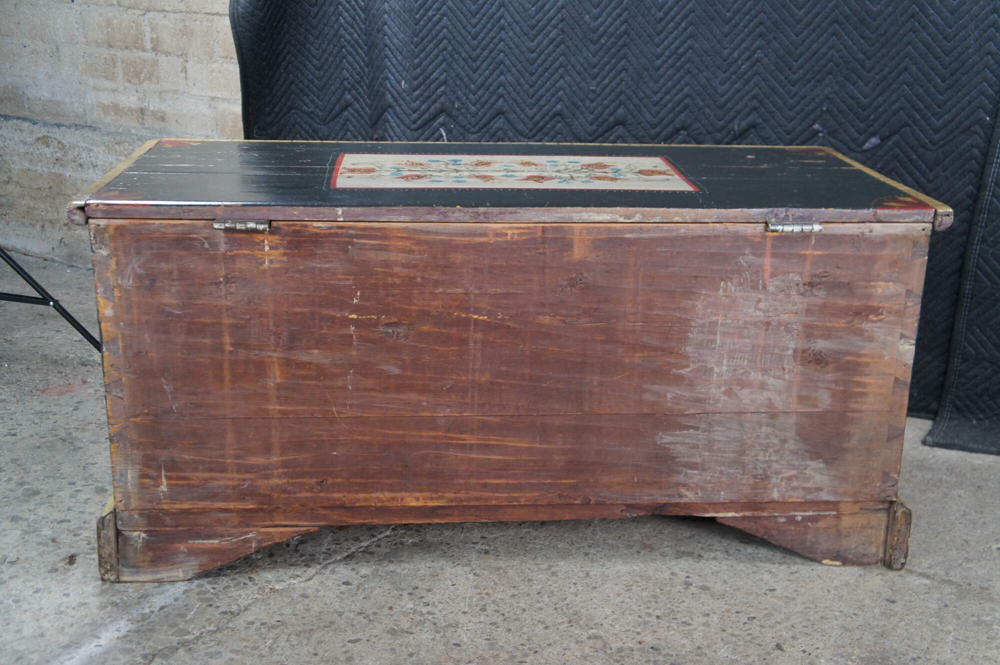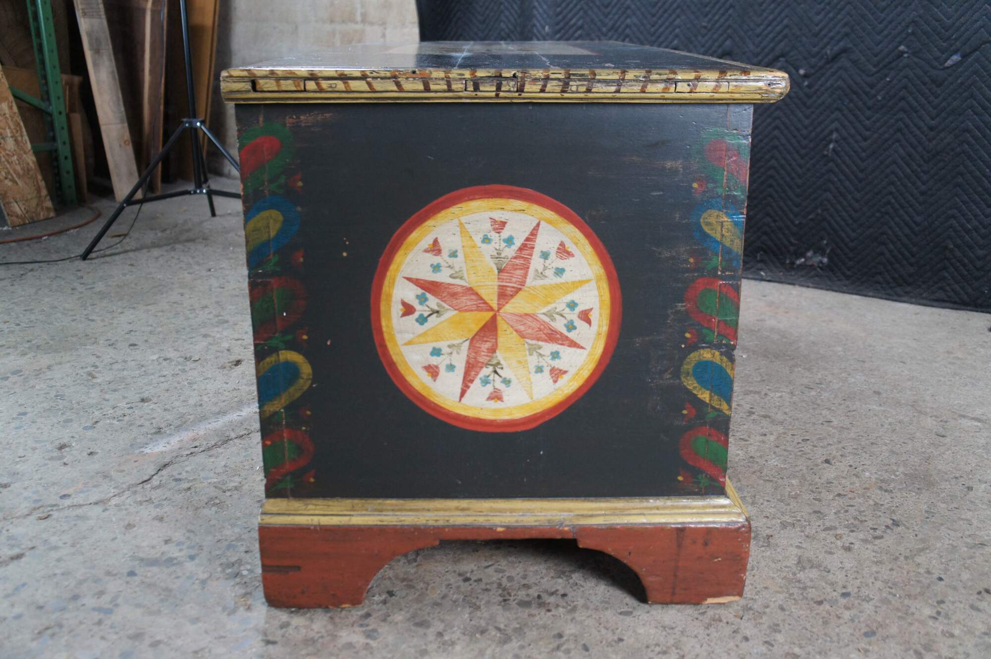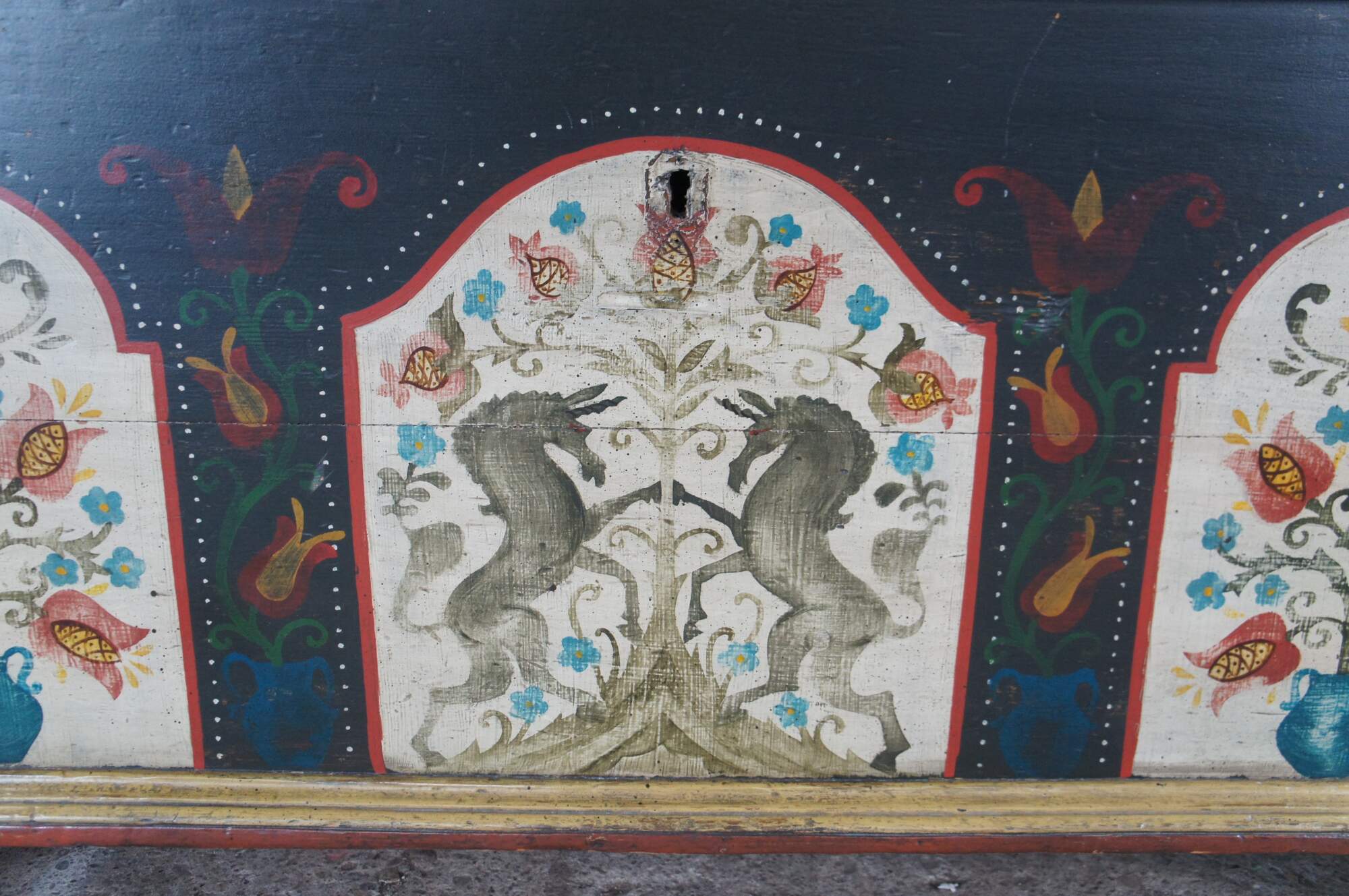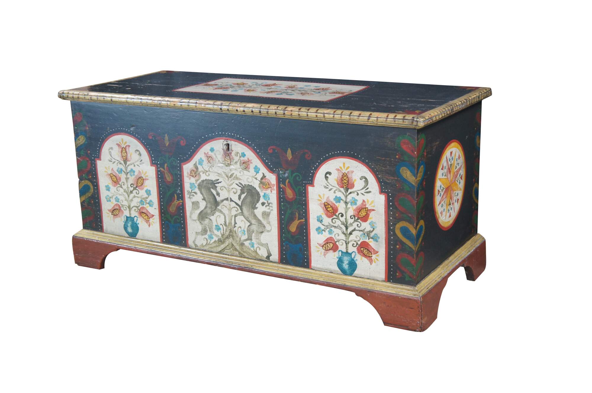 Antique late 18th to early 19th century Pennsylvania Dutch blanket trunk / hope / dowry / wedding chest featuring painted unicorns, floral roses, and 8-pointed LeMoyne Stars.