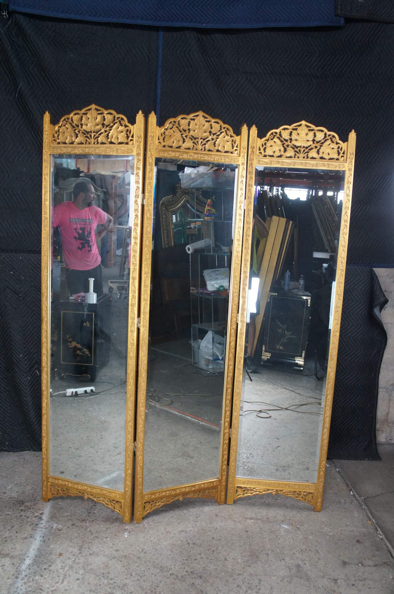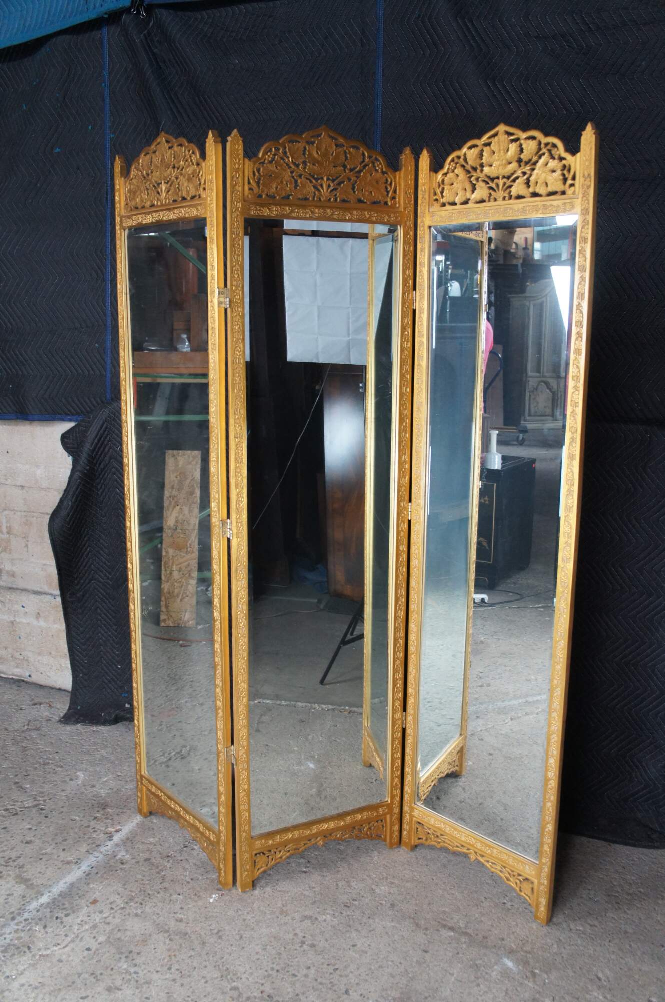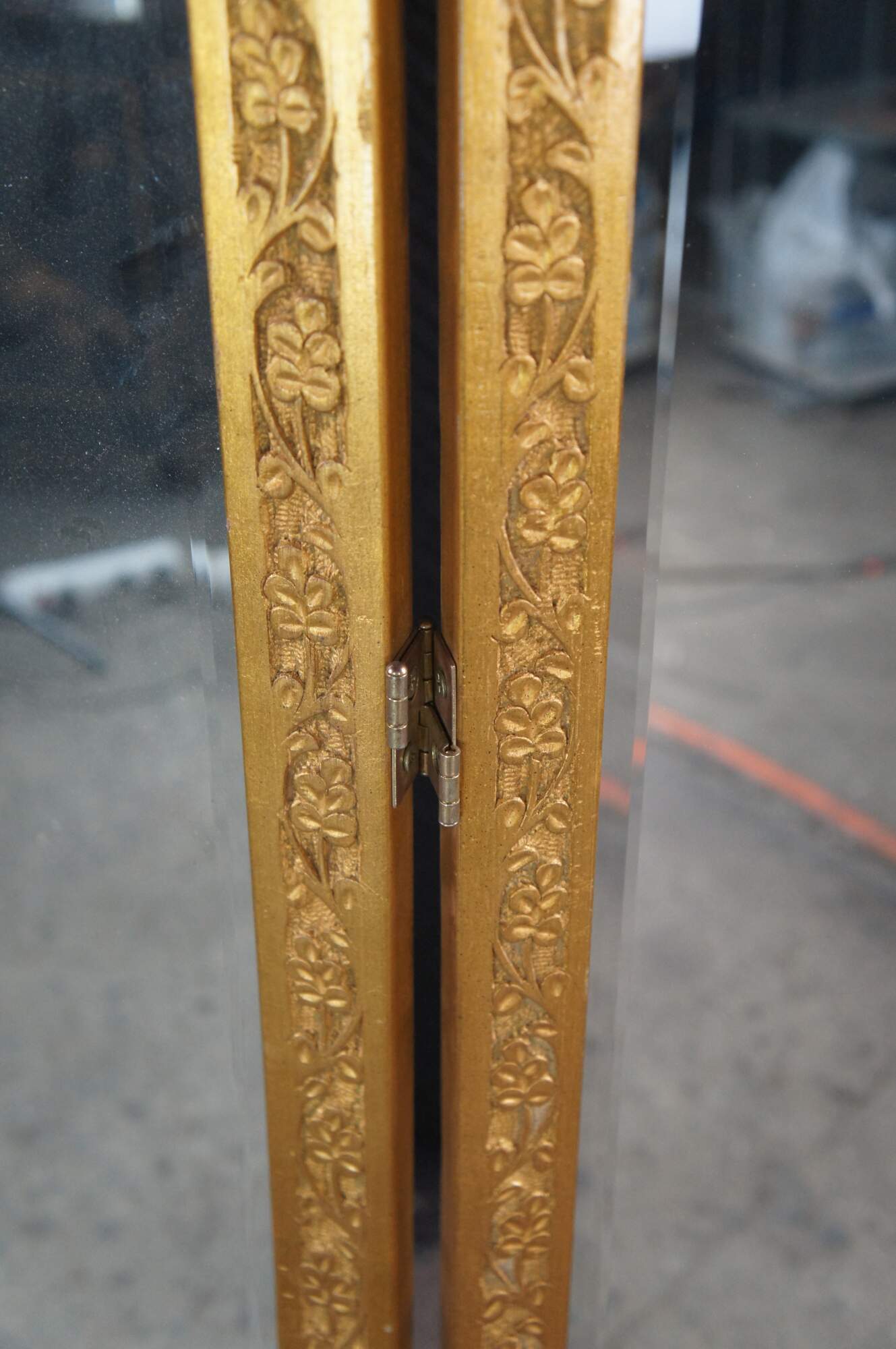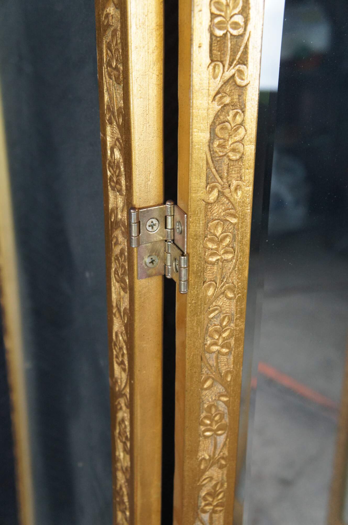 Vintage Chinese Chippendale / Hollywood Regency style gold giltwood tri fold full length dressing mirror / room divider featuring three double hinged beveled mirror panels with reticulated / pierced maple leaf and carved foliate designs.